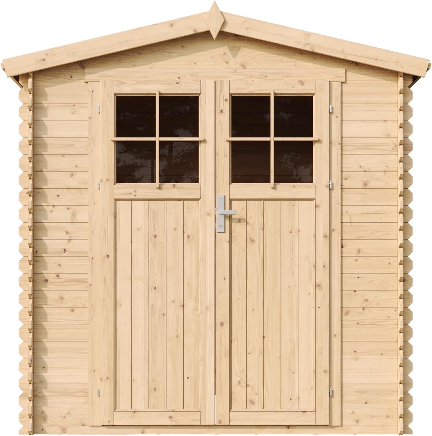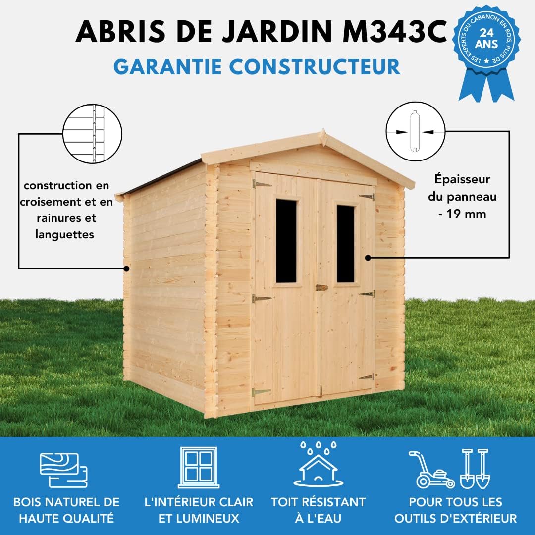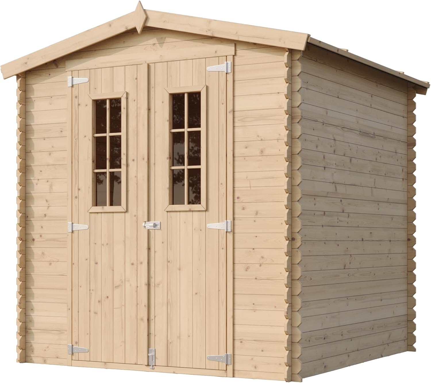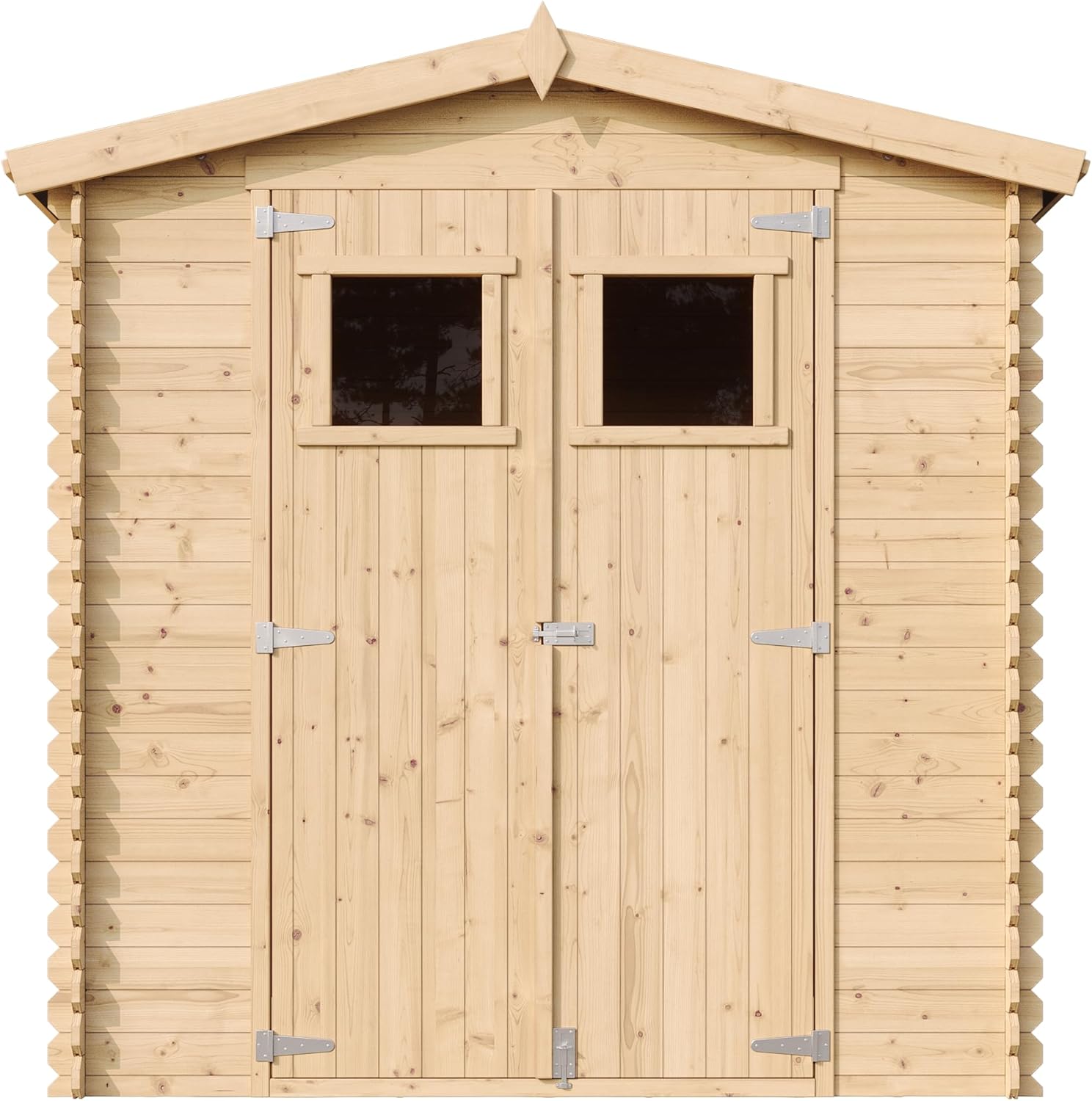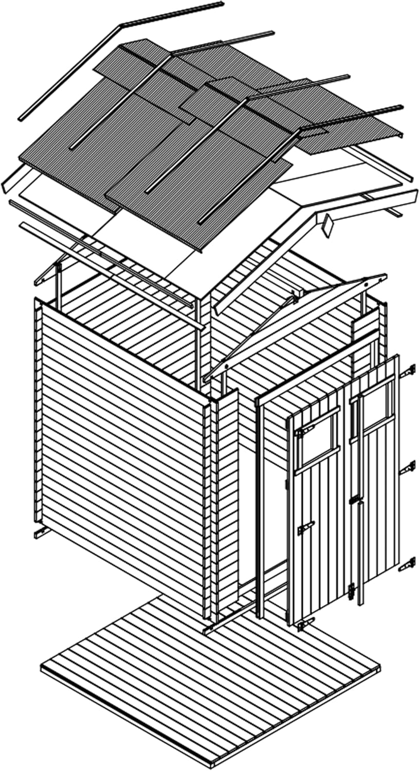 Additional Accessories: As the manufacturer, we recommend adding hexagonal asphalt shingles to the roof of the hut for reliable roof protection and to create a unique house design. You can find shingle options in the product description. Perfect small-space wooden hut. Outdoor storage space (1.97 sq m), suitable for small spaces. Perfectly nestled against a fence, wall, or under the shade of a tree. Versatile for storing trash cans, barbecue equipment, toys, or bicycles. Very Important: Please provide your mobile phone number when ordering so the carrier can contact you to arrange delivery! Sturdy wooden garden hut. Factory direct. Made with high-quality 19mm natural planks. The combination of cross bracing and mortise and tenon joints creates a sturdy and durable garden hut that will stand the test of time. The garden hut is easy to assemble. Pre-cut beams and detailed instructions help you build easily. The product includes roofing panels and felt, treated flooring, fasteners, double doors with windows, locks, and accessories. This garden storage hut offers excellent accessibility and is an ideal storage solution. The double doors open to a height of 1.77 meters, making it easy to store your belongings. Two acrylic windows provide ample natural light and a good view.