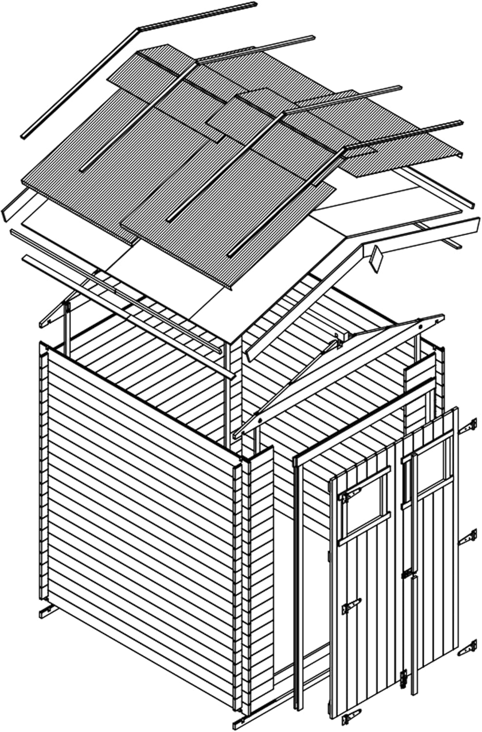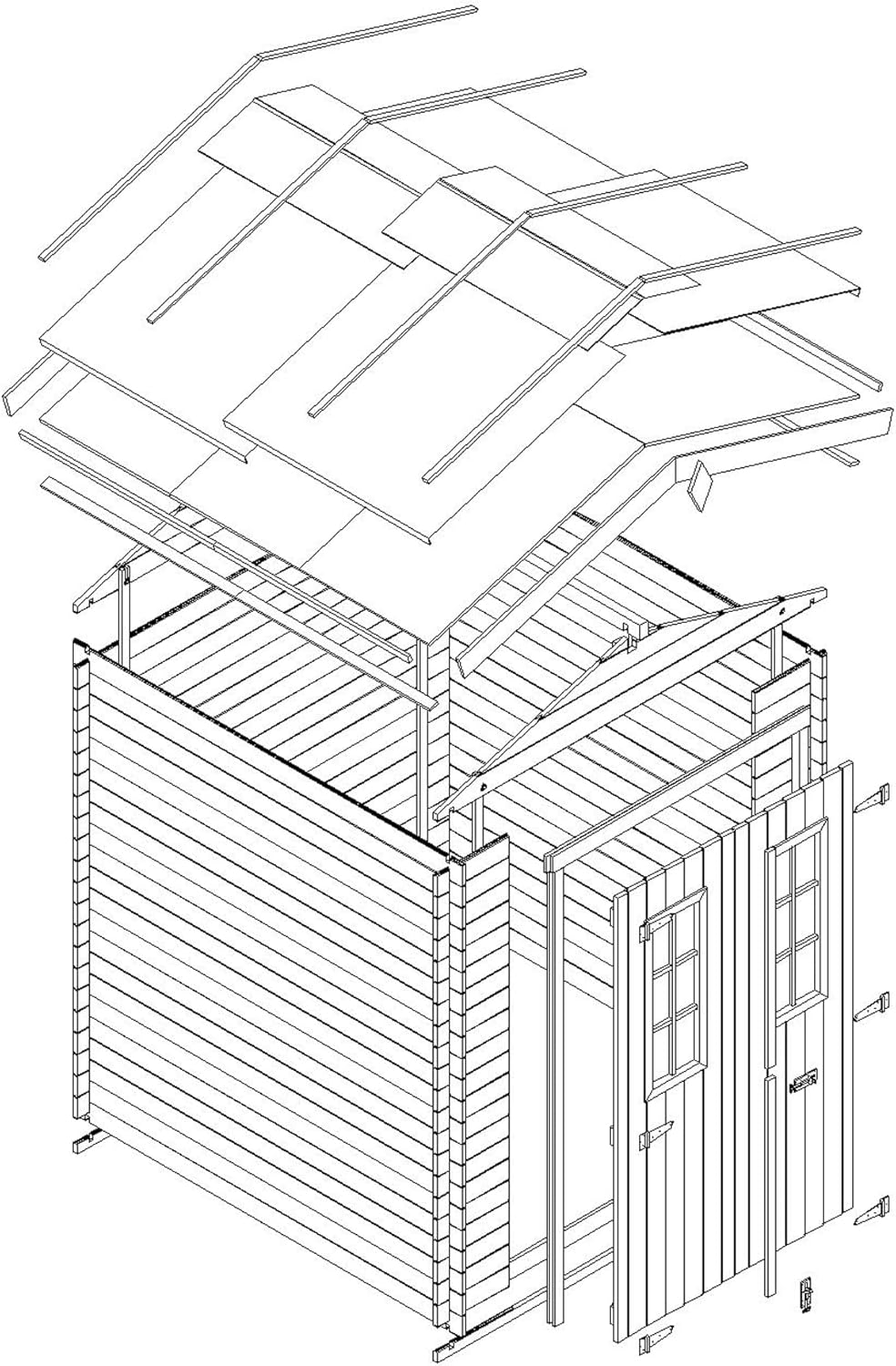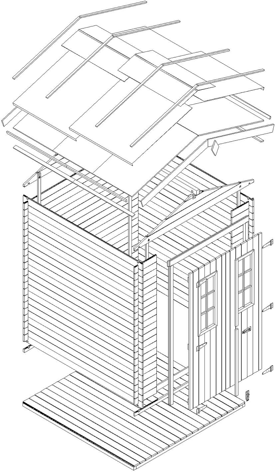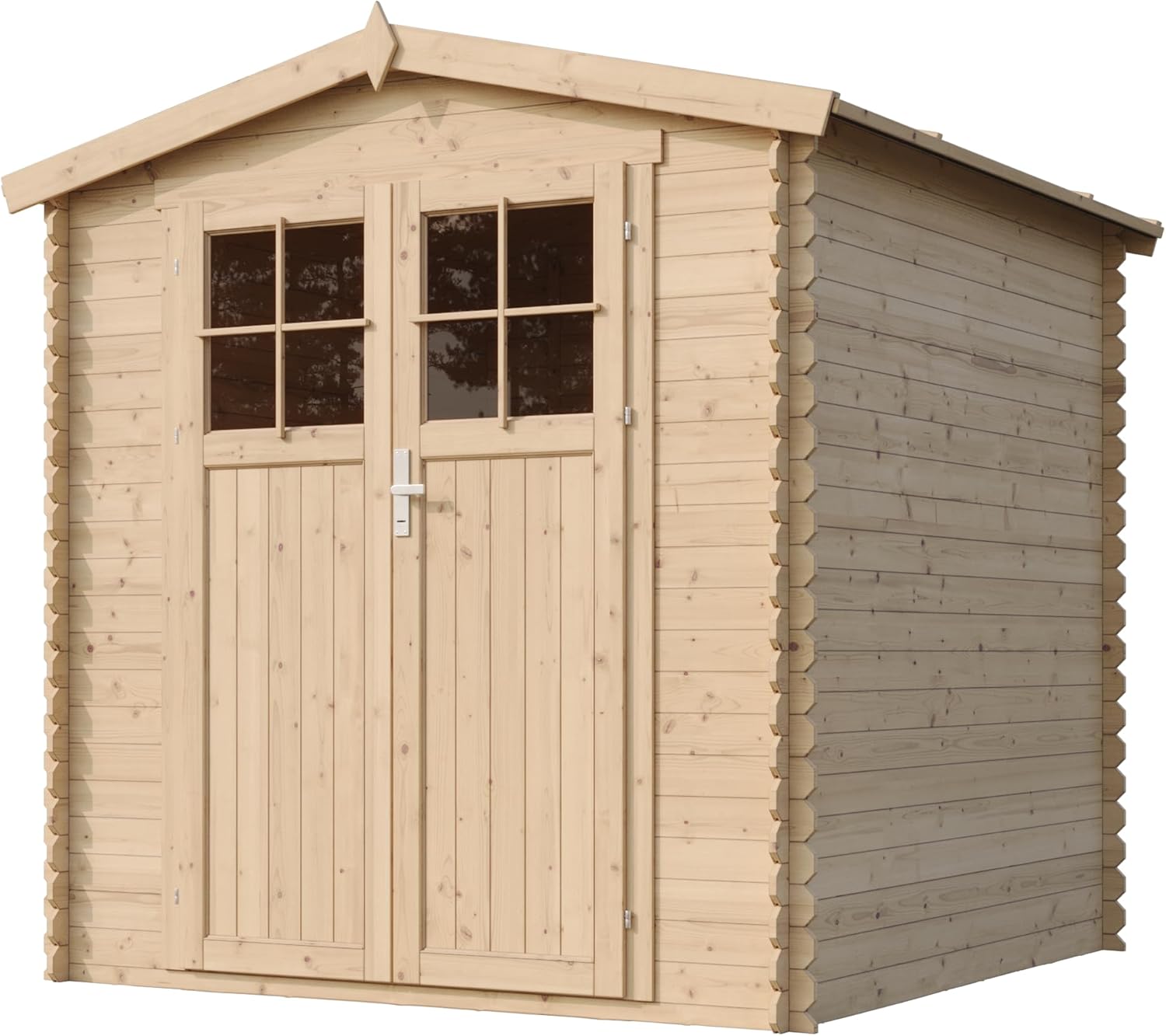 Additional Accessories: As the manufacturer, we recommend adding hexagonal asphalt shingles to the roof of the hut for reliable roof protection and to create a unique house design. You can find shingle options in the product description. Perfect small-space wooden hut. Outdoor storage space (1.97 sq m), suitable for small spaces. Perfectly nestled against a fence, wall, or under the shade of a tree. Versatile for storing trash cans, barbecue equipment, toys, or bicycles. Very Important: Please provide your mobile phone number when ordering so the carrier can contact you to arrange delivery! Sturdy wooden garden hut. Factory direct. Made with high-quality 19mm natural planks. The combination of cross bracing and mortise and tenon joints creates a sturdy and durable garden hut that will stand the test of time. The garden hut is easy to assemble. Pre-cut beams and detailed instructions help you build easily. The product includes roofing panels and felt, treated flooring, fasteners, double doors with windows, locks, and accessories. This garden storage hut offers excellent accessibility and is an ideal storage solution. The double doors open to a height of 1.77 meters, making it easy to store your belongings. Two acrylic windows provide ample natural light and a good view.