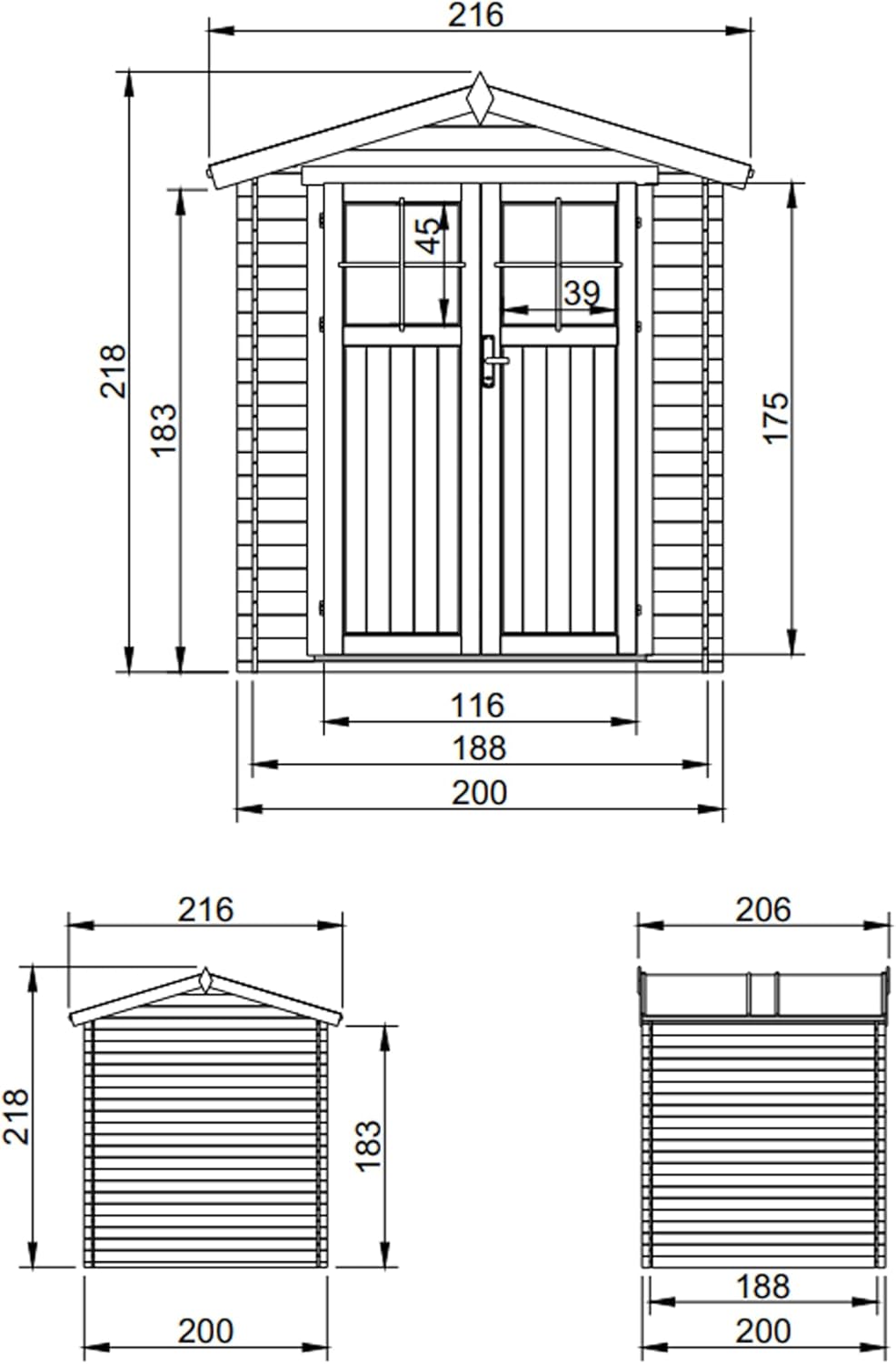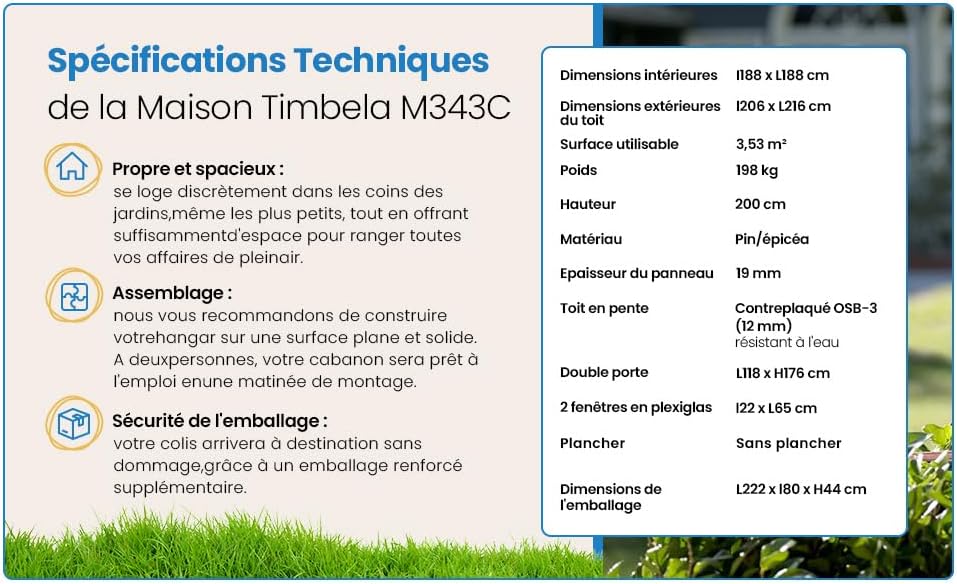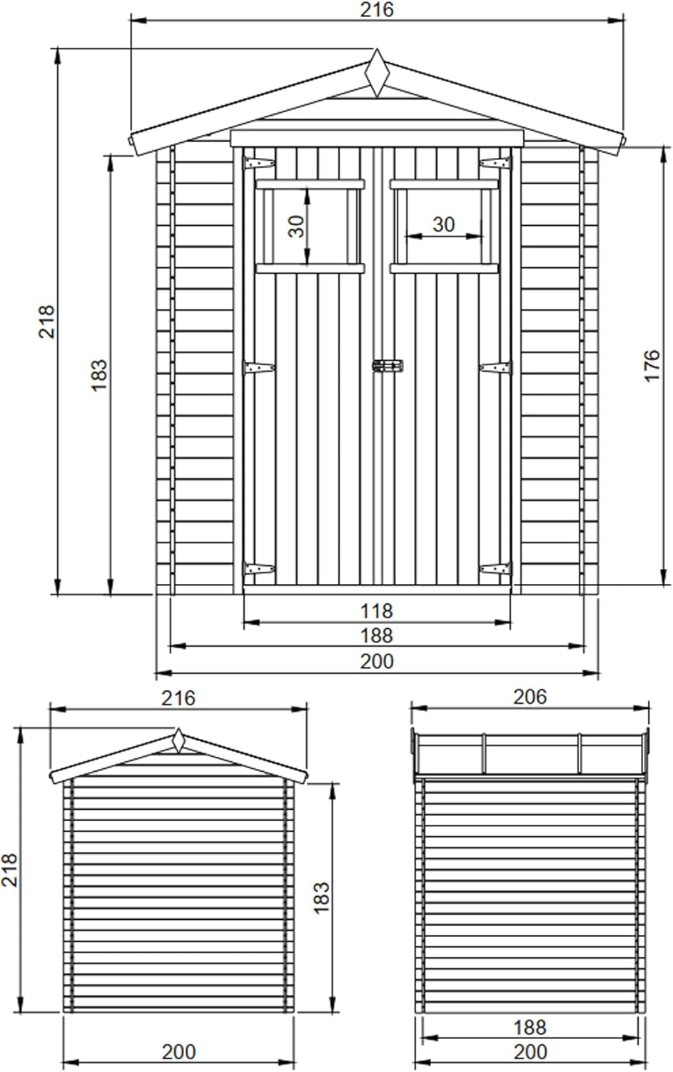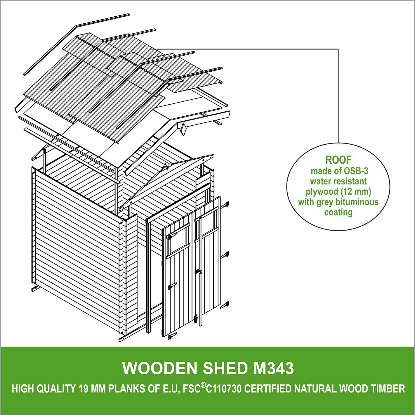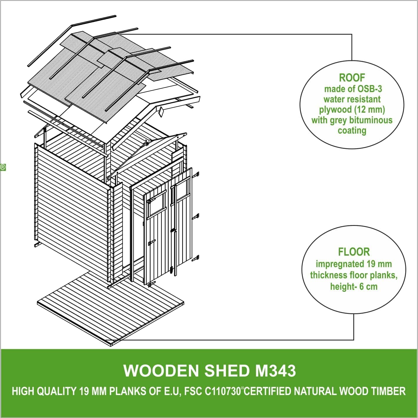 • Wooden garden shed with treated floor, high-quality lockable door - Outdoor storage 3.55 m2 (216 x W206 x H218 cm) - Waterproof roof, windows M343F+M343G