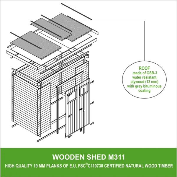 The Wooden Garden Hut (Model M311) helps you create a stylish and efficient outdoor space to meet all your storage needs. This premium hut is made from natural European timber, easy to assemble, and offers ample interior space, making it ideal for storing tools, equipment, and gardening supplies. Its weather-resistant design and integrated windows ensure natural light while protecting your belongings from the elements. Double doors allow easy access to items, even bulky ones. This hut is perfect for DIY enthusiasts and sustainable gardeners, combining exquisite craftsmanship with certified environmentally friendly materials to provide a sustainable solution to your storage problems. Easy Assembly: Pre-cut wooden components and detailed installation instructions make assembly a breeze. Natural Light and Easy Access: Two windows enhance the interior view; double doors allow easy access to bulky items. Weather Resistance: A robust structure with interlocking cladding and a sloping roof provides optimal protection against wind and rain. Premium Craftsmanship and Materials: Made with premium natural timber from European forests. Technical Specifications: External Dimensions: 204 cm (W) x 142 cm (D) x 200 cm (H) Internal Dimensions: 188 cm (W) x 118 cm (D) Overall Dimensions: 239 cm (W) x 142 cm (D) x 200 cm (H) Usable Area: 2.22 square meters Weight: 164 kg Material: Premium pine and spruce Board Thickness: 19 mm Roofing Type: Waterproof OSB-3 plywood, sloping design Door Type and Size: Double doors - 118 cm (W) x 176 cm (H) Windows: Two acrylic windows - 30 cm x 30 cm each Package Dimensions: 202 cm (L) x 80 cm (W) x 40 cm (H)
