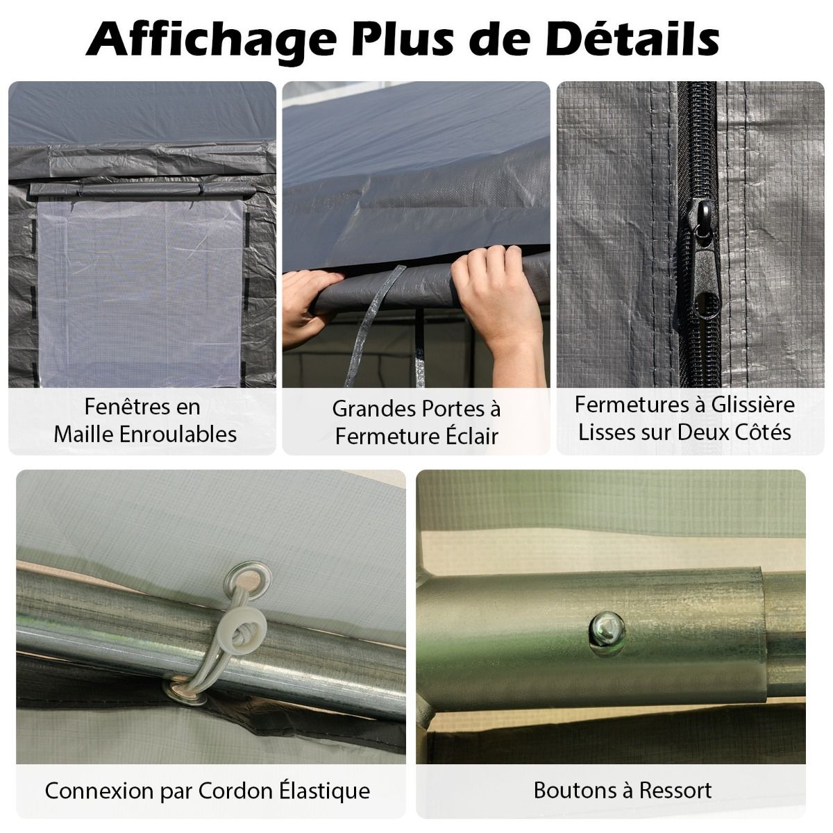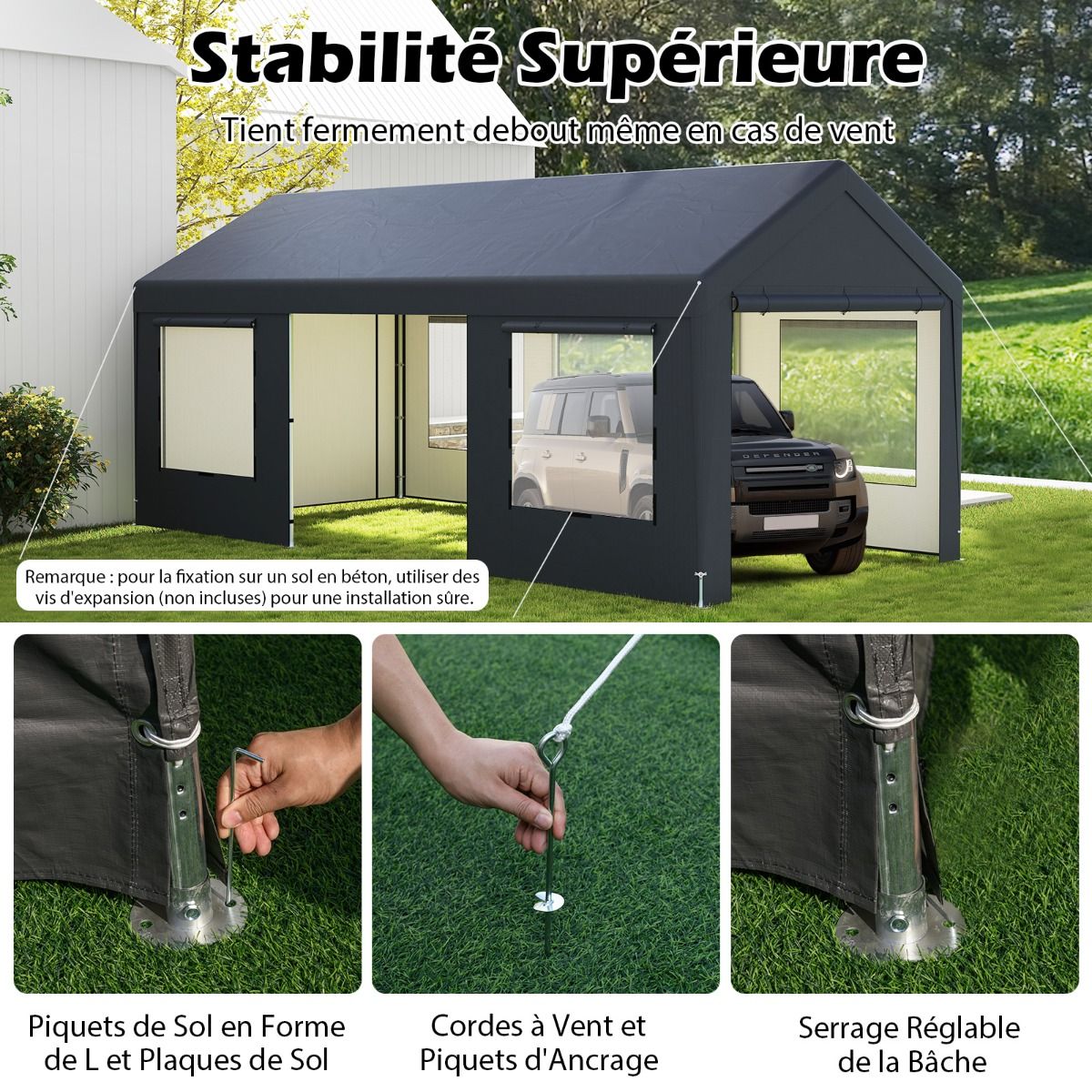 Our carport provides ample parking for your vehicle. It features 8 removable side panels, including 4 doors and 4 windows, 4 pull ropes, 16 ground pegs, and 4 anchors, allowing for multiple setup options. You can also use it for commercial purposes such as a garden gazebo, wedding and party tent, market stall, or tool shed. The carport is constructed with a galvanized metal frame and all-weather PE tarpaulin, ensuring reliable durability in all weather conditions. Product Features: Spacious Coverage This large carport measures 595 x 300 x 280 cm, providing ample parking space for cars, trucks, boats, SUVs, or small motorhomes. The frame tubing is secured with spring buttons, and the tarpaulin is connected with elastic ropes for easy installation. Robust and Reliable Construction The frame uses rust-resistant galvanized metal tubing and reinforced welded joints, and features an upper triangular support beam. The robust structure ensures its reliability and provides lasting protection. All-Weather Protection: The carport roof is made of PE material and designed to withstand all weather conditions and seasons. It effectively protects against sunlight, rain, wind, snow, and dust. Please remove snow from the canopy promptly to avoid unnecessary damage. Superior stability: Equipped with L-shaped ground stakes and mats, as well as windproof ropes and anchors, this canopy stands firmly on the ground even in strong winds. Its adjustable canopy provides a perfect seal, ensuring the canopy remains secure and effective at all times. To secure it to a concrete surface, use expansion bolts (not included) for a firm installation. Versatile design: This portable garage features eight side panels, including four roller shutter doors and four mesh windows, ensuring optimal airflow and comfort. The eight side panels can be individually removed or installed, making it ideal for trade shows, picnics, social events, weddings, parties, and storage. Durable and sturdy, featuring: PE material for sun and water protection, rain, wind, and snow resistance; 41mm thick galvanized metal tubing for rust resistance and durability; reinforced triangular top beam to prevent structural twisting; L-shaped ground pegs to secure the tent at all eight corners; four ground anchors and four guy ropes for enhanced wind resistance; adjustable tent fabric for a flat and aesthetically pleasing appearance; eight side panels that can be removed or installed to suit various needs; suitable not only for covering cars or boats but also for weddings, parties, and trade shows; roll-up mesh windows for excellent ventilation; large zippered door with smooth double-sided zippers for easy entry and exit; elastic cord connections and spring buckles for convenient installation. Note: The product is shipped in two boxes; shipping time may vary depending on the packaging. Screws are included in box #2. Specifications Color: Gray Material: PE, galvanized metal Product Dimensions: 595 x 300 x 280 cm (L x W x H) Front and Rear Door Dimensions: 243 x 196 cm (W x H) Side Door Dimensions: 193 x 196 cm (W x H) Window Dimensions: 121 x 121 cm (W x H) Net Weight: 53.5 kg Package Contents: 1 x Carport 2 x Double Gloves 16 x L-Shaped Ground Studs 4 x Ground Stud Anchoring Kit 4 x Windproof Rope 1 x Instruction Manual
