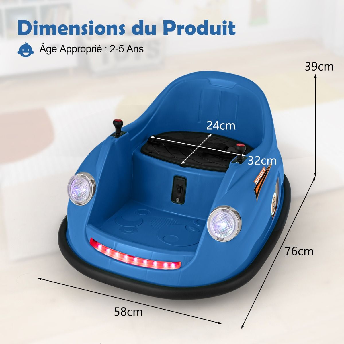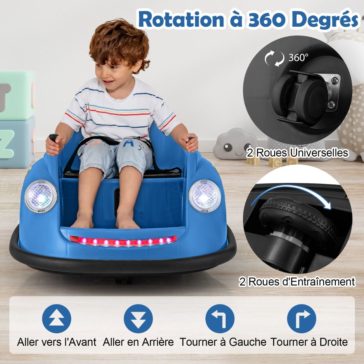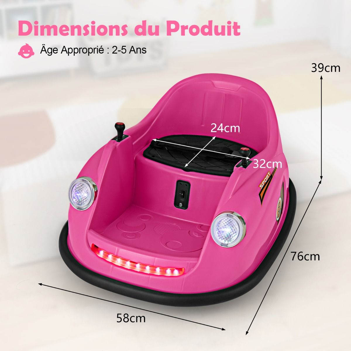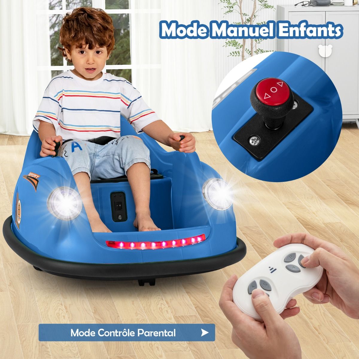 This electric bumper car, designed for children aged 2 to 5, features two reliable 12V motors. The rechargeable battery offers long battery life and comes with a convenient charger. Parents can control younger children using the remote, while older children can drive independently using the joystick. With two omnidirectional wheels and soft bumpers, this bumper car can rotate 360Spend, ensuring a safe and exciting driving experience. LED lights and cheerful music further enhance the fun of every adventure. Product Features: High-Performance Bumper CarThis electric bumper car features two powerful 12V motors, delivering superior performance and a thrilling driving experience. The 12V/4.5AH rechargeable battery ensures longer battery life. It comes with a charger and a built-in charging port for convenient and quick charging. Two Control ModesParents can control younger children using the remote (two AAA batteries sold separately). As children grow older, they can use the easy-to-use joystick to control the bumper car themselves. The bumper car can move forward, backward, turn left, or turn right. 360Spend Rotation, Enhanced SafetyThis children's toy features two omnidirectional wheels, allowing for 360Spend rotation. The soft-start function significantly improves safety compared to standard starting methods. Furthermore, the adjustable seatbelt ensures toddlers remain securely seated, enjoying a safe bumper experience. Fun Driving, Exciting FeaturesPressing the power switch illuminates bright LED headlights and colorful light strips on this battery-powered bumper car. Children can select their favorite music using the music button, turning each ride into a wonderful adventure. Ideal Gift for ToddlersThis 12V electric bumper car meets high standards, ensuring reliability in both indoor and outdoor environments. It's the perfect gift for children aged 2-5, providing them with an educational and fun driving learning opportunity. Product Features: Two powerful 12V motors provide superior performance; a 12V/4.5Ah rechargeable battery extends playtime; equipped with a charger and built-in charging port for convenient charging; child manual mode with joystick to foster independence; parental control mode with remote control for enhanced safety; two omnidirectional wheels for 360-degree rotation; two drive wheels for forward and backward movement; soft bumpers protect furniture from damage; built-in LED lights and music for added fun; soft-start function and adjustable seatbelt ensure safety; child-friendly pedals enhance riding comfort; an ideal gift for children aged 2-5 and toddlers; suitable for indoor or outdoor use, bringing endless fun. Product Specifications: Colors: Pink/Red/Blue; Material: PP, Metal; Product Dimensions: 76 x 58 x 39 cm (Length x Width x Height). Seat Dimensions: 32 x 24 cm (L x W) Weight Capacity: 20 kg Motors: 2 x 12V Battery: 12V / 4.5Ah Charger Input: AC 120V / 0.25A / 60Hz Charging Time: 8 to 12 hours Remote Control Battery Type: 2 AAA Batteries Net Weight: 6.5 kg Package Contents: 1 x Bumper Car 1 x Remote Control 1 x Charger 1 x Instruction Manual
