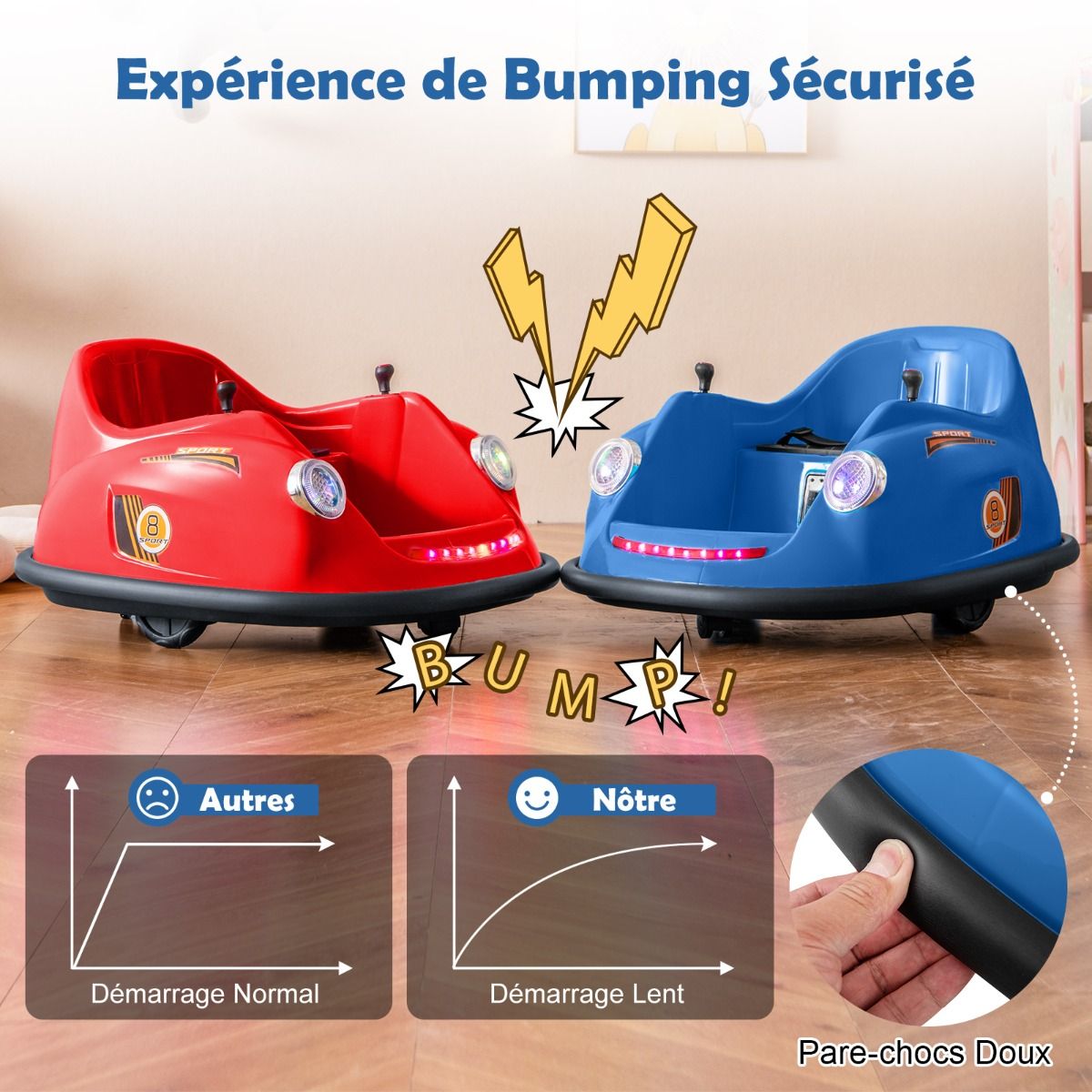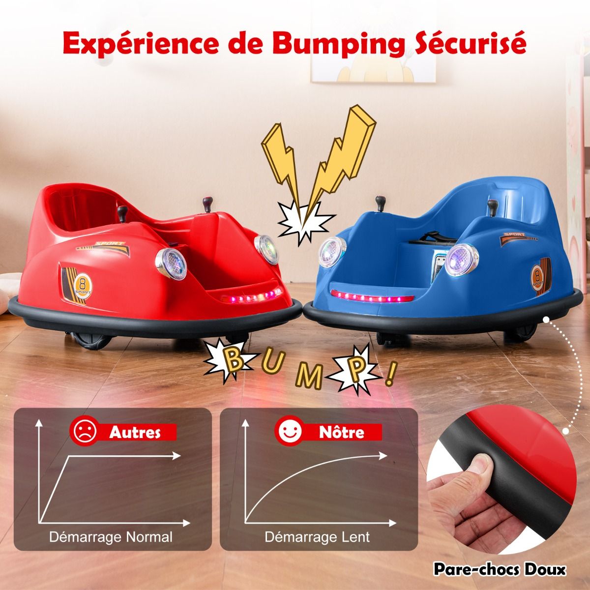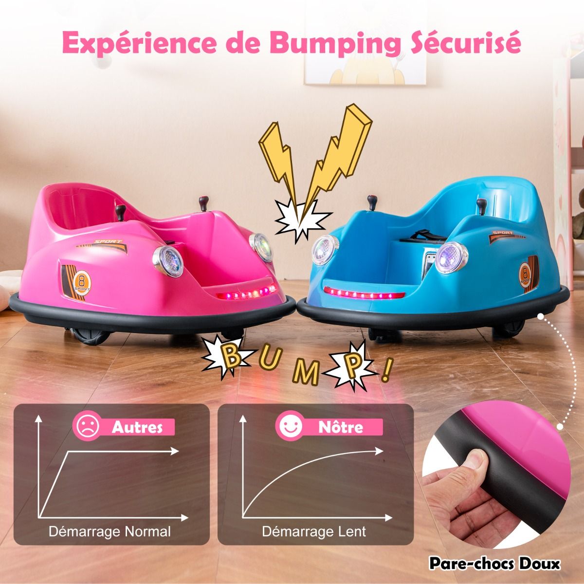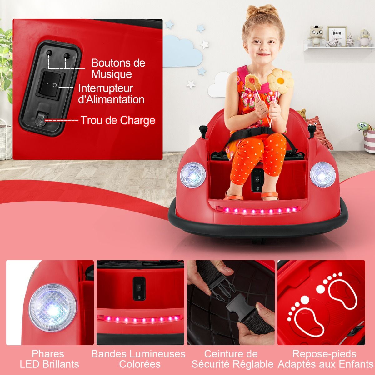 This electric bumper car, designed for children aged 2 to 5, features two reliable 12V motors. The rechargeable battery offers long battery life and comes with a convenient charger. Parents can control younger children using the remote, while older children can drive independently using the joystick. With two omnidirectional wheels and soft bumpers, this bumper car can rotate 360Spend, ensuring a safe and exciting driving experience. LED lights and cheerful music further enhance the fun of every adventure. Product Features: High-Performance Bumper CarThis electric bumper car features two powerful 12V motors, delivering superior performance and a thrilling driving experience. The 12V/4.5AH rechargeable battery ensures longer battery life. It comes with a charger and a built-in charging port for convenient and quick charging. Two Control ModesParents can control younger children using the remote (two AAA batteries sold separately). As children grow older, they can use the easy-to-use joystick to control the bumper car themselves. The bumper car can move forward, backward, turn left, or turn right. 360Spend Rotation, Enhanced SafetyThis children's toy features two omnidirectional wheels, allowing for 360Spend rotation. The soft-start function significantly improves safety compared to standard starting methods. Furthermore, the adjustable seatbelt ensures toddlers remain securely seated, enjoying a safe bumper experience. Fun Driving, Exciting FeaturesPressing the power switch illuminates bright LED headlights and colorful light strips on this battery-powered bumper car. Children can select their favorite music using the music button, turning each ride into a wonderful adventure. Ideal Gift for ToddlersThis 12V electric bumper car meets high standards, ensuring reliability in both indoor and outdoor environments. It's the perfect gift for children aged 2-5, providing them with an educational and fun driving learning opportunity. Product Features: Two powerful 12V motors provide superior performance; a 12V/4.5Ah rechargeable battery extends playtime; equipped with a charger and built-in charging port for convenient charging; child manual mode with joystick to foster independence; parental control mode with remote control for enhanced safety; two omnidirectional wheels for 360-degree rotation; two drive wheels for forward and backward movement; soft bumpers protect furniture from damage; built-in LED lights and music for added fun; soft-start function and adjustable seatbelt ensure safety; child-friendly pedals enhance riding comfort; an ideal gift for children aged 2-5 and toddlers; suitable for indoor or outdoor use, bringing endless fun. Product Specifications: Colors: Pink/Red/Blue; Material: PP, Metal; Product Dimensions: 76 x 58 x 39 cm (Length x Width x Height). Seat Dimensions: 32 x 24 cm (L x W) Weight Capacity: 20 kg Motors: 2 x 12V Battery: 12V / 4.5Ah Charger Input: AC 120V / 0.25A / 60Hz Charging Time: 8 to 12 hours Remote Control Battery Type: 2 AAA Batteries Net Weight: 6.5 kg Package Contents: 1 x Bumper Car 1 x Remote Control 1 x Charger 1 x Instruction Manual