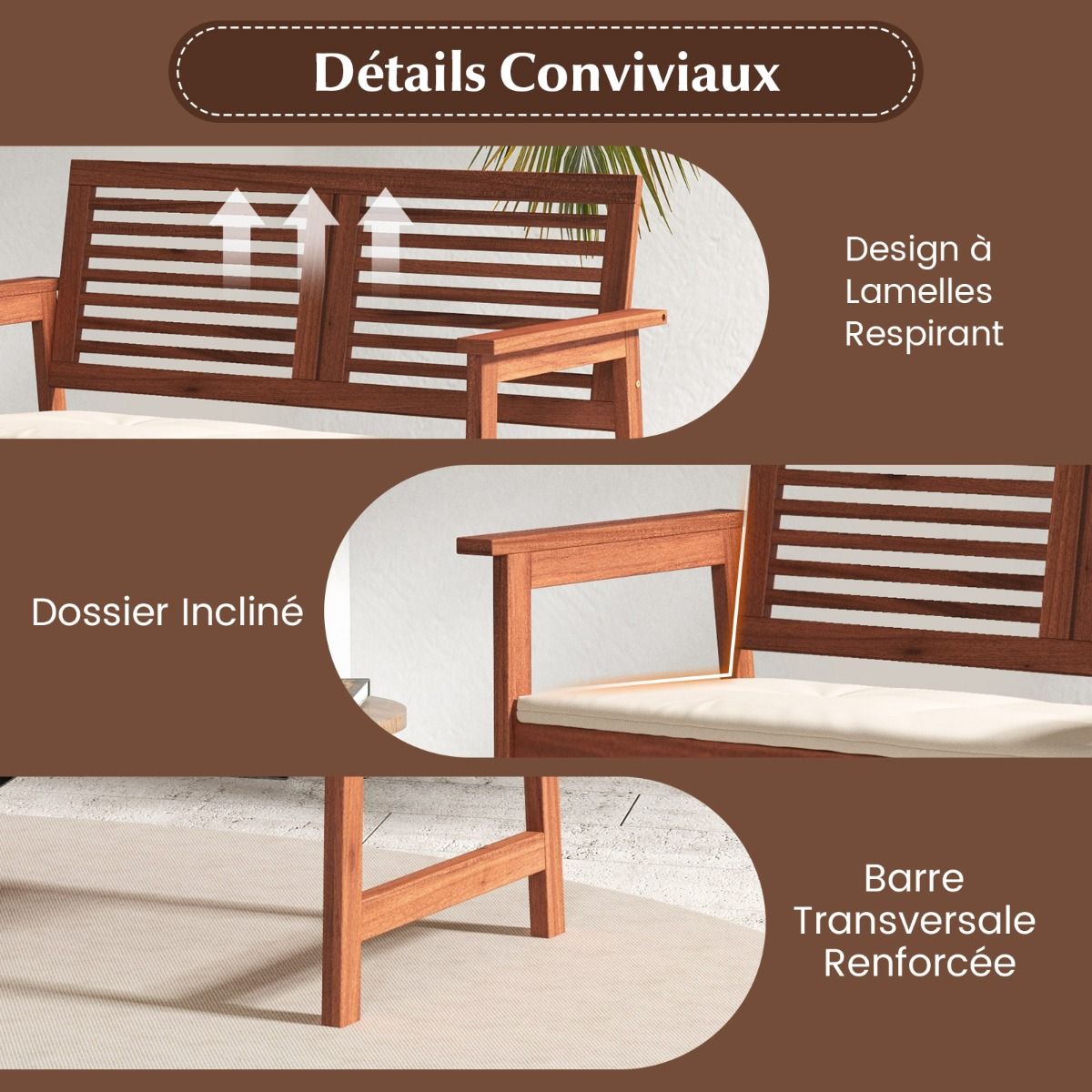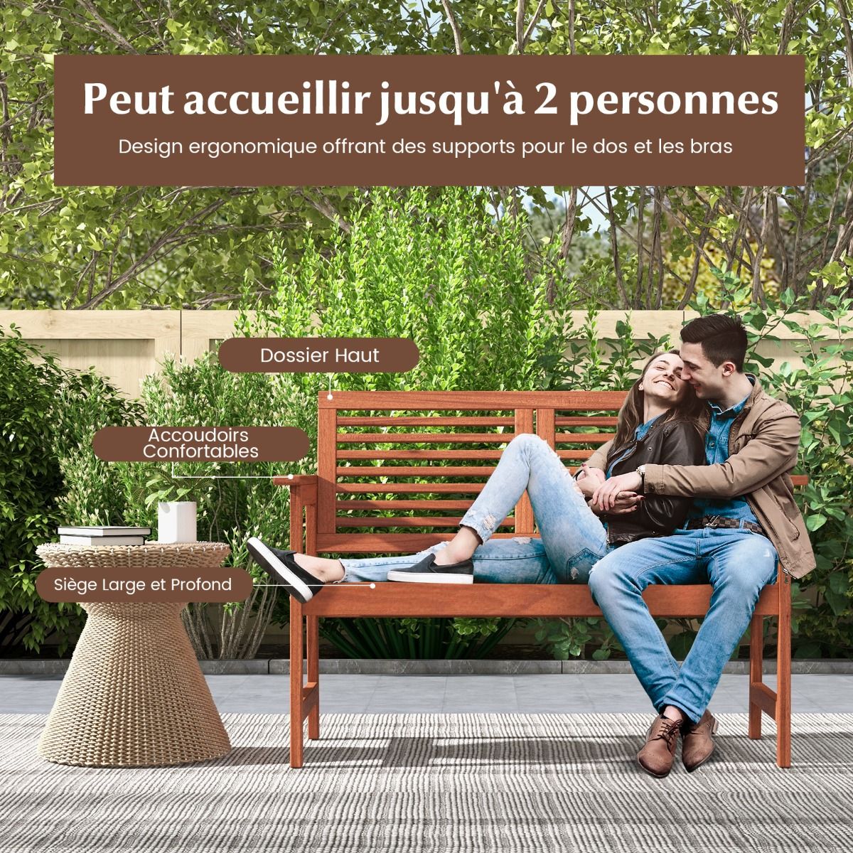 This double sofa chair is crafted from solid wood, featuring an adjustable backrest, soft and comfortable cushions, and durability. Its spacious size comfortably accommodates two adults, providing a relaxing retreat. The breathable slatted seat adds extra comfort, while the natural wood surface brings a touch of elegance to any space. Versatile and suitable for outdoor environments, this sofa chair is ideal for gardens or patios. Sturdy and durable with a robust structure, this patio double sofa chair is made from high-quality, sturdy solid wood, ensuring durability and excellent stability. Furthermore, reinforced crossbeams further enhance overall stability. The reclining backrest and slatted design allow for maximum comfort. This upscale patio bench will help you relax. In addition, the high-density upholstered seat provides a comfortable seating experience. Functional securing straps keep the cushion firmly in place. A beautiful outdoor bench: the smooth, burr-free wooden surface is not only durable but also stylish and adds a touch of natural elegance. This spacious and comfortable outdoor bench will be a beautiful addition wherever you sit. Versatile for Various Occasions: This comfortable and stylish double bench is ideal for outdoor relaxation. It's suitable for various settings such as patios, porches, poolside areas, and balconies. Easy Assembly: Detailed instructions and a complete set of accessories greatly improve assembly efficiency. Align all holes before tightening the screws. Overall Dimensions: 111 x 62.5 x 81 cm (Length x Width x Height). Strong and Durable Features: Crafted from high-quality solid wood for durability; reinforced crossbeams enhance stability; breathable ergonomic seat for relaxation; wide seat accommodates two people; seat cushion enhances comfort; securing straps prevent seat shifting; natural wood grain finish adds elegance; suitable for patios, balconies, or poolside areas; easy assembly with clear instructions. Specifications: Frame color: Natural wood; Seat cushion color: Off-white; Material: Solid wood, polyester fiber, PU foam; Overall dimensions: 111 x 62.5 x 81 cm (Length x Width x Height); Seat cushion dimensions: 102 x 51 x 2.5 cm (Length x Width x Height); Seat height: 37 cm; Net weight: 15 kg. Package includes: 1 x Outdoor bench; 1 x Seat cushion; 1 x Instruction manual.
