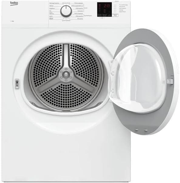 Front-loading dryer, 8 kg capacity - vented type. Main functions: Electrical functions: delayed start, remaining time display, LCD screen. Installation method: Freestanding. Drying capacity: 8 kg. Noise level: 66 dB. Energy efficiency rating: C. Connectivity: No. Total volume: 106 liters. Annual power consumption: 577.1 kWh. Delayed start time: 24 hours. Drying programs: Cotton, Cotton Energy-saving, Cotton Quick-dry, Cotton Extra Dry, Synthetic Fiber, Synthetic Fiber, Timer, Fresh program, Delicate garments/shirts, Jeans, Sports/Warm clothing, Everyday, Hygiene, Delicate garments, Quick 14 minutes, Standard cotton program (160 minutes). Motor type: Standard. Factory warranty: 2 years. Color: White. Country of origin: Turkey, other countries/regions. Weight: 32.5 kg. Drying method: Vented type. Safety features: Child lock, filter maintenance indicator. Display: Digital display. Product height: 85.6 cm. Product depth: 58.4 cm. Width: 59.7 cm. Spare parts supply period: 11 years. Main features: 8 kg capacity - C-type exhaust. Induction drying. 24-hour delayed start/remaining time display. Aquawave roller - freshening program - automatic wrinkle prevention - digital display.