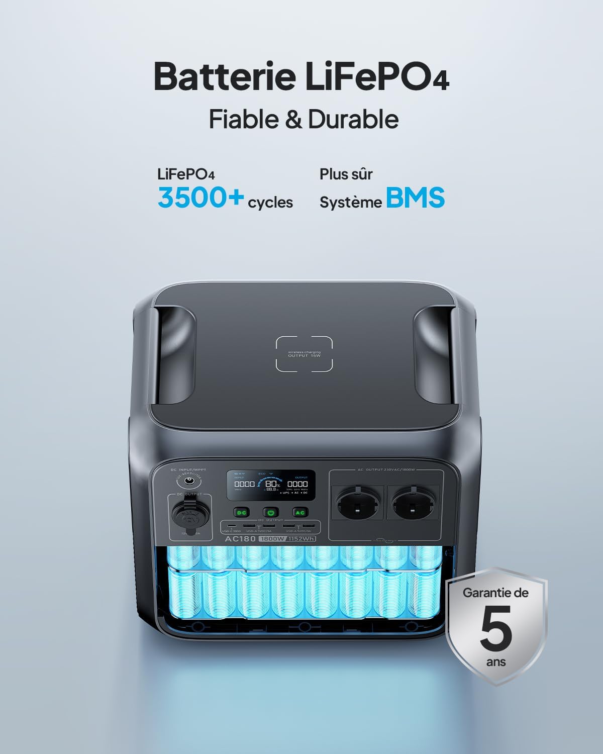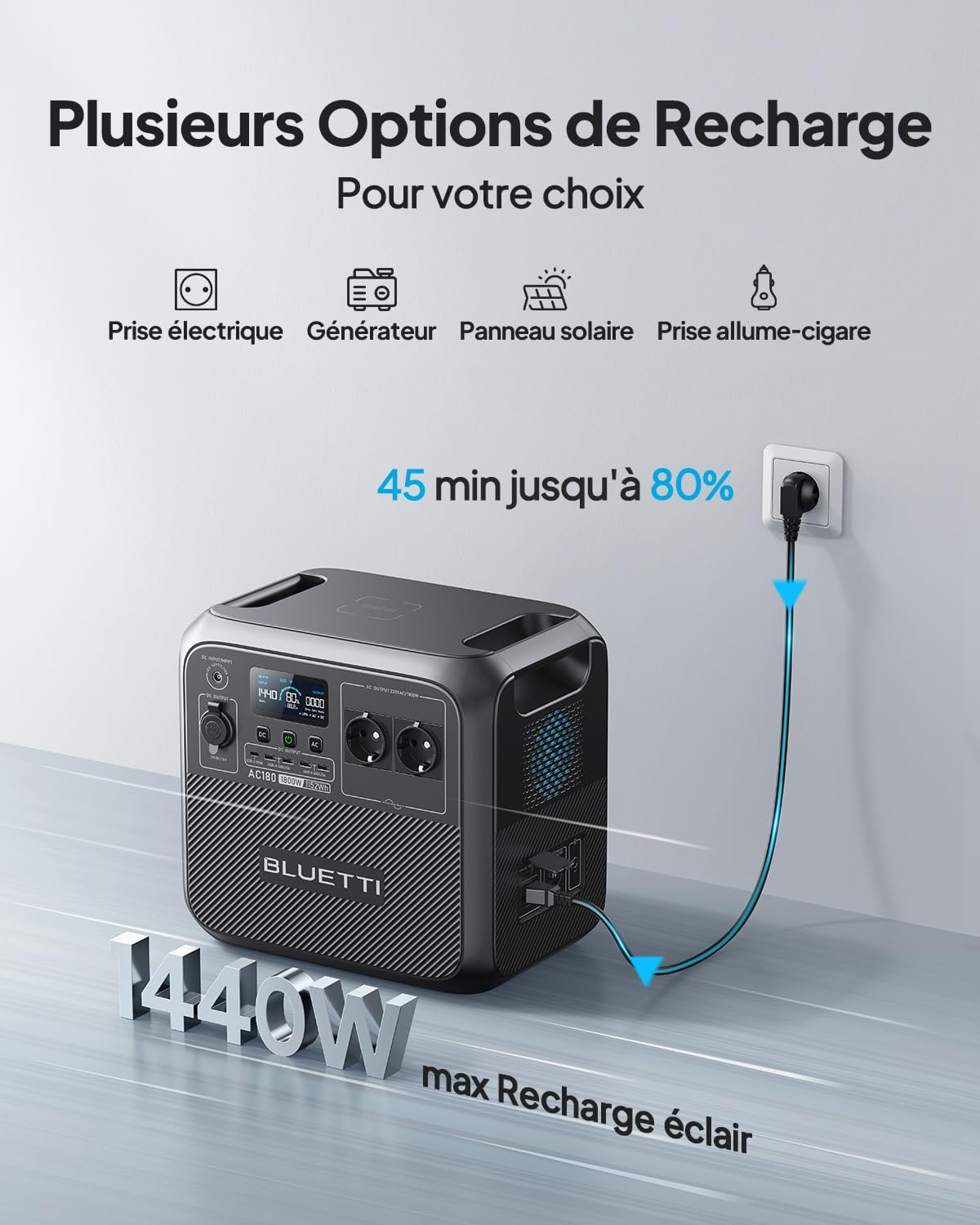[Summer Heat Solution] An eco-friendly air conditioning alternative: Enjoy all-night use of a high-powered fan without worrying about power limitations or high electricity bills. [1440W Lightning Fast Charging] No bulky adapters needed; a single cable is all it takes to charge the BLUETTI AC180, which supports 1440W AC input, fully charging the 1152Wh portable power bank in 1.3-1.8 hours. [9 Multi-Functional Interfaces] 1800W output power Includes an AC power outlet, USB Type-A port, Type-C port, and wireless charging port. Supports all device interfaces. For purely resistive loads, AC output power can reach 2700W. [Fast Solar Charging] Built-in MPPT charging controller supports up to 500W of solar input. Using clean, environmentally friendly, and renewable solar energy, the AC180 solar generator can be fully charged in 2.8-3.3 hours. [Reliable UPS] The AC180 power bank is equipped with advanced UPS functionality, quickly restoring power within 20 milliseconds, eliminating worries about power outages. Package List - BLUETTI AC180 Portable Power Bank, AC Charging Cable, Car Charger Adapter, Solar Charging Cable, User Manual. What devices can the AC180 power? The solar generator can power devices up to 1800W. With the "Power Boost" mode enabled in the BLUETTI app, it can even power heating devices like electric kettles/hair dryers up to 2700W. How long can the AC180 power my devices? For high-power loads (>300W): Runtime = Capacity (Wh) * Depth of Discharge (DoD) * n �� Load Power; For low-power loads (<300W): Runtime = Capacity (Wh) * Depth of Discharge (DoD) * n �� (Load Power + 15W), where Depth of Discharge (DoD) = 90%, n = 85%. Which solar panel should I choose? Please consider the following requirements: 1. Total open circuit voltage: 12-60V; 2. Total solar input power: 500W maximum; 3. Equipped with a compatible solar connector.