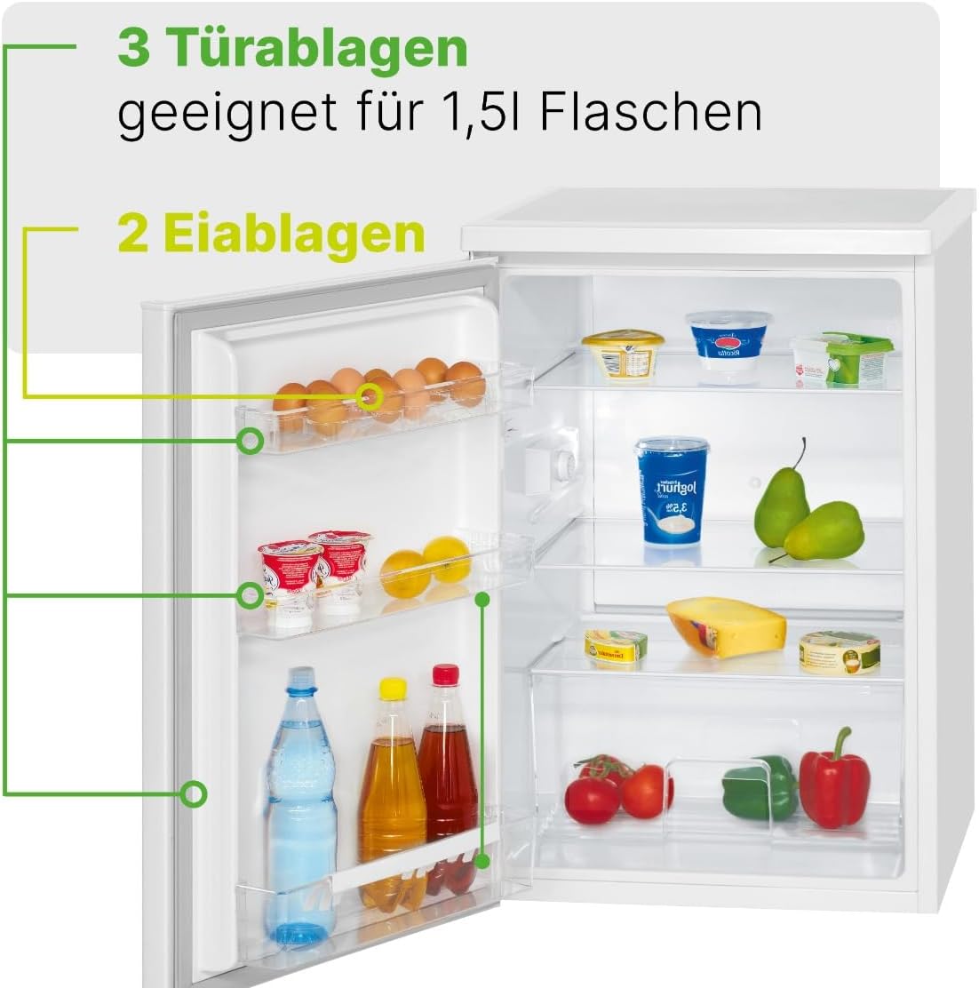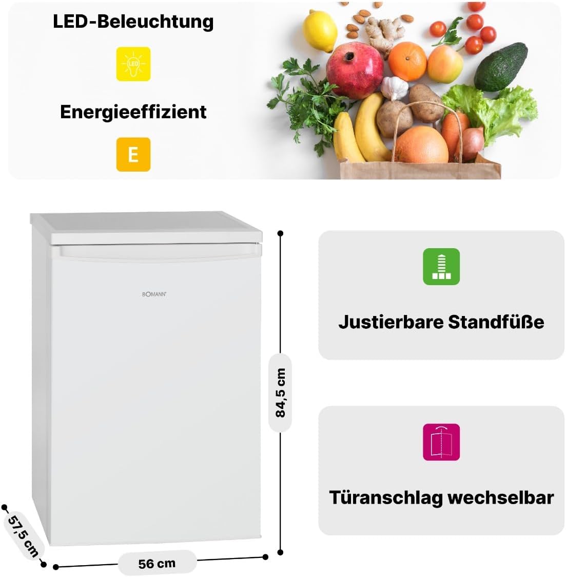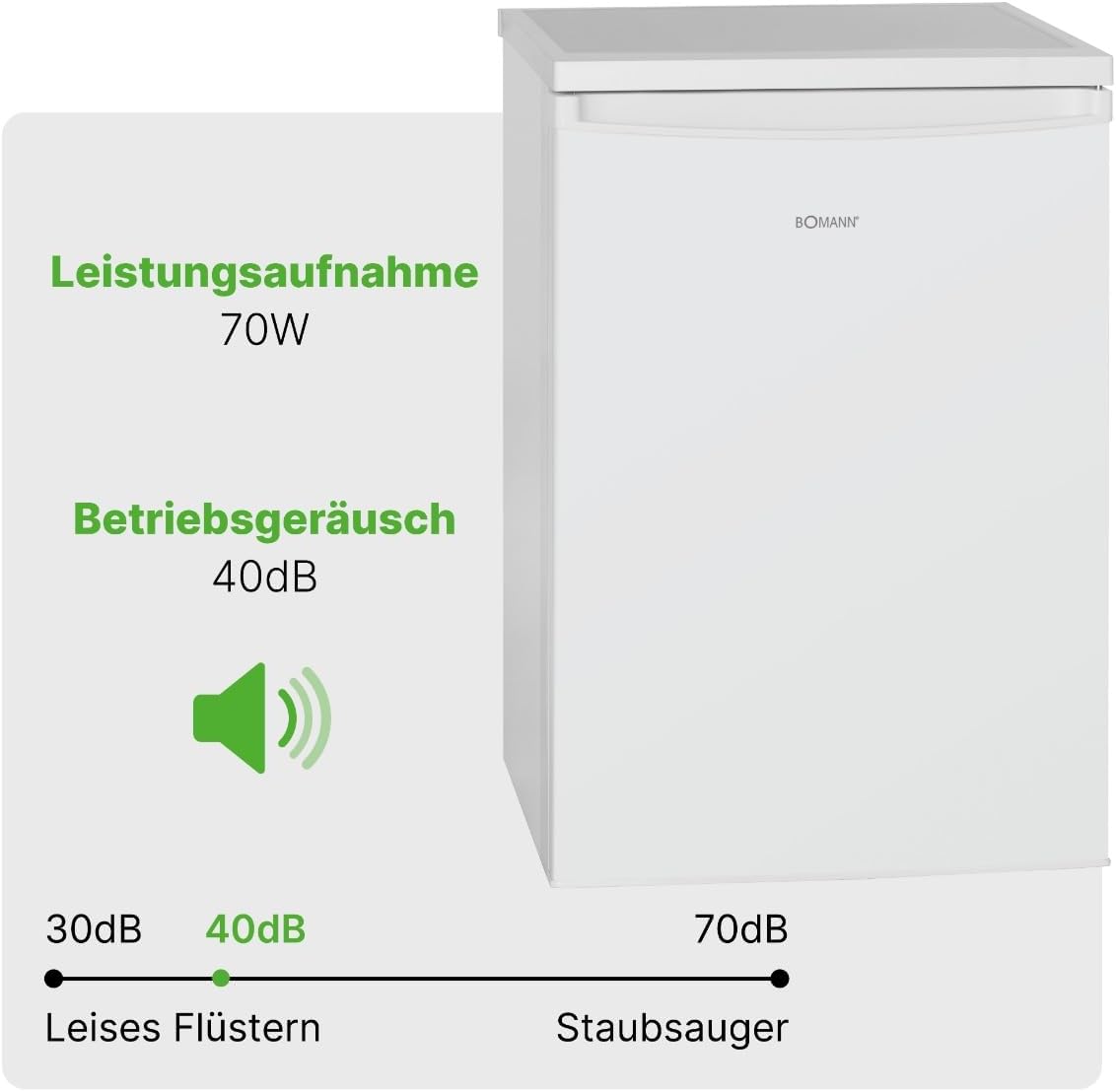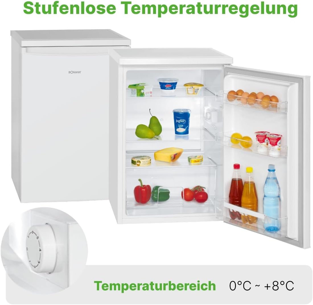 Innovation: Bomann appliances keep pace with the times, employing the latest technology for low energy consumption and superior craftsmanship. The Bomann VS 2185.1 has a capacity of 133 liters. Equipped with three door shelves, two egg trays, and a transparent crisper drawer, it provides ample storage space. This full-size refrigerator features a semi-automatic defrosting system. With a continuously adjustable thermostat, you can set the temperature individually as needed. Adjustable feet ensure stable support. Replaceable door hinges offer greater flexibility in using your Bomann refrigerator. Safety is Bomann's top priority: therefore, this product is designed to the most stringent safety standards and is CE certified. This product comes with a European standard plug and a multilingual user manual. BOMANN is a family business with over 130 years of history, specializing in electrical appliances. Its extensive portfolio of home appliances offers a variety of tested products to ensure proper function and compliance with current standards. All product lines meet European standards and bear the CE mark. Specifications: Net capacity: 133 liters; LED internal lighting; Continuous temperature control; Temperature range: 0Spend ~ +8Spend; Automatic defrost; Transparent vegetable drawer; 3 glass shelves, 2 of which are height adjustable; 3 door shelves; 2 egg trays; Interchangeable right-side door hinges; Adjustable feet. Technical Specifications: Connection voltage: 220-240V~ / 50Hz; Power: 70W; Climate rating: SN/N/ST/T (+10Spend ~ +43Spend); Refrigerant: R600a; Operating noise: 40dB. Energy consumption data: 24-hour energy consumption: 0.247kWh; Annual energy consumption: 90kWh (according to EU Regulation 2019/2016 datasheet). Dimensions (approx. H x W x D) and weight: Refrigerator: 84.5 x 56.0 x 57.5 cm; Packaged: 88.0 x 57.5 x 59.5 cm. Net weight: 28.0 kg Gross weight: 32.0 kg