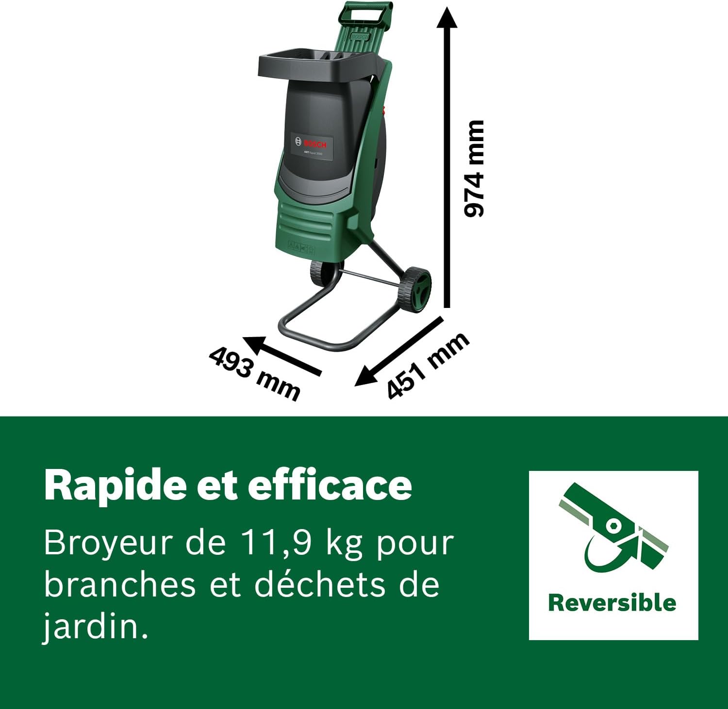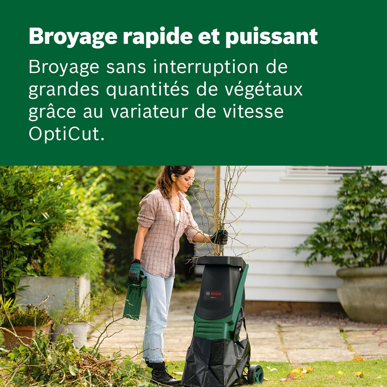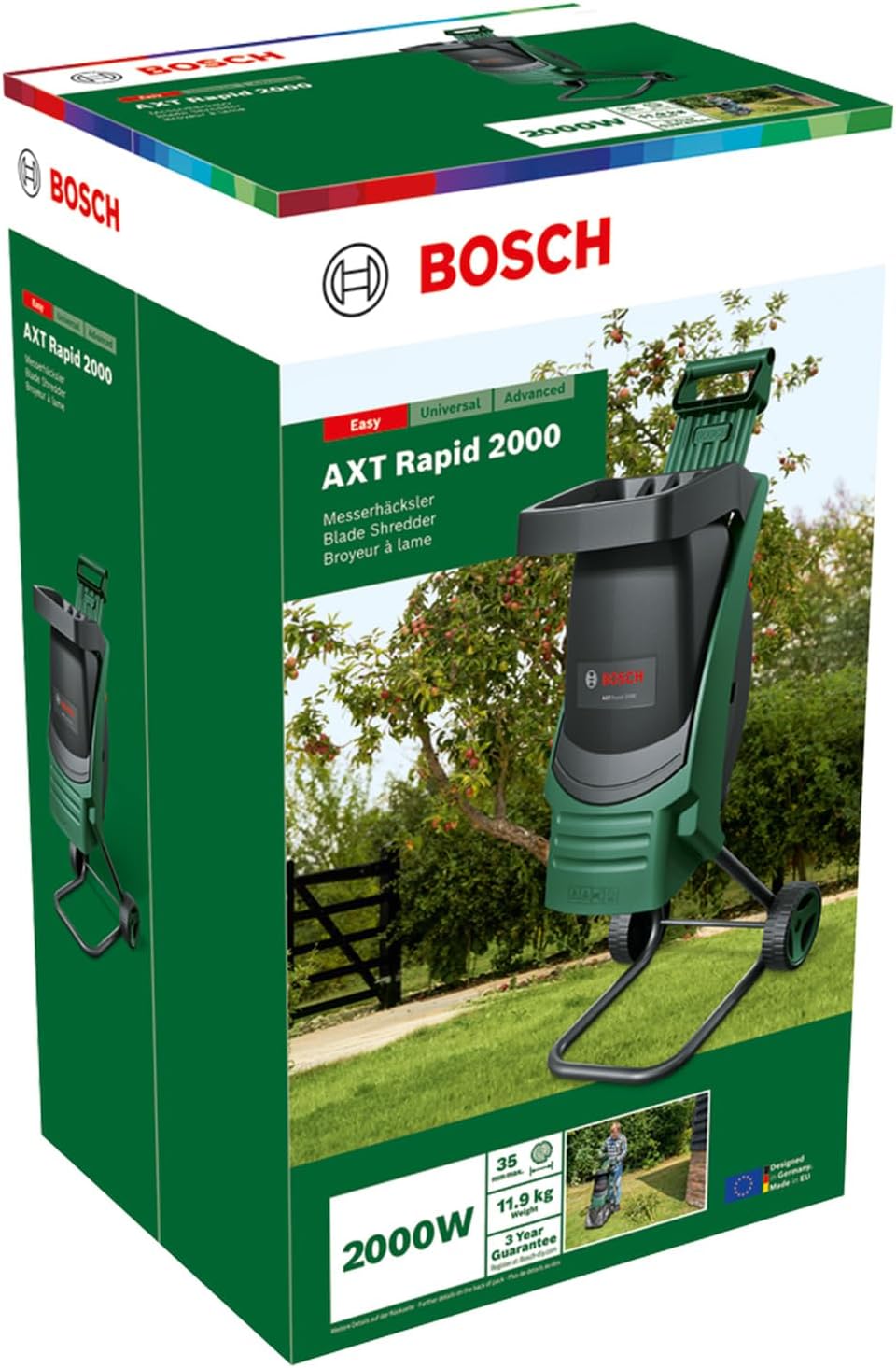 Laser-cut steel blades offer optimal cutting performance and durability. OptiCut speed control enables continuous, high-volume shredding. Reversible blades efficiently shred branches up to 35mm in diameter. This shredder easily shreds green waste and wood for easy mulching and composting. Product includes: AXT Rapid 2000 shredder, instruction manual, and cardboard box. The Bosch AXT Rapid 2000 is a fast and powerful shredder. With multiple functions, the AXT Rapid 2000 shredder is ideal for quickly shredding shrubs, branches, and other garden waste. This garden shredder features a powerful 2000-watt motor, and OptiCut automatic speed control enables optimal, continuous, and uninterrupted shredding in large batches. The laser-cut blades are made of ultra-hard steel and can cut branches up to 35cm in diameter. The double-edged blades are reversible for extended life. It features a convenient pusher for safely feeding high-quality garden waste into the fast-feed hopper. This high-performance garden shredder is lightweight and easy to move around in gardens and patios. Technical Specifications: Motor Power: 2000 watts. Cutting Speed: 3650 rpm. Maximum Cutting Diameter: 35 mm. Weight: 11.9 kg. Package Contents: AXT Rapid 2000 Wood Chipper.