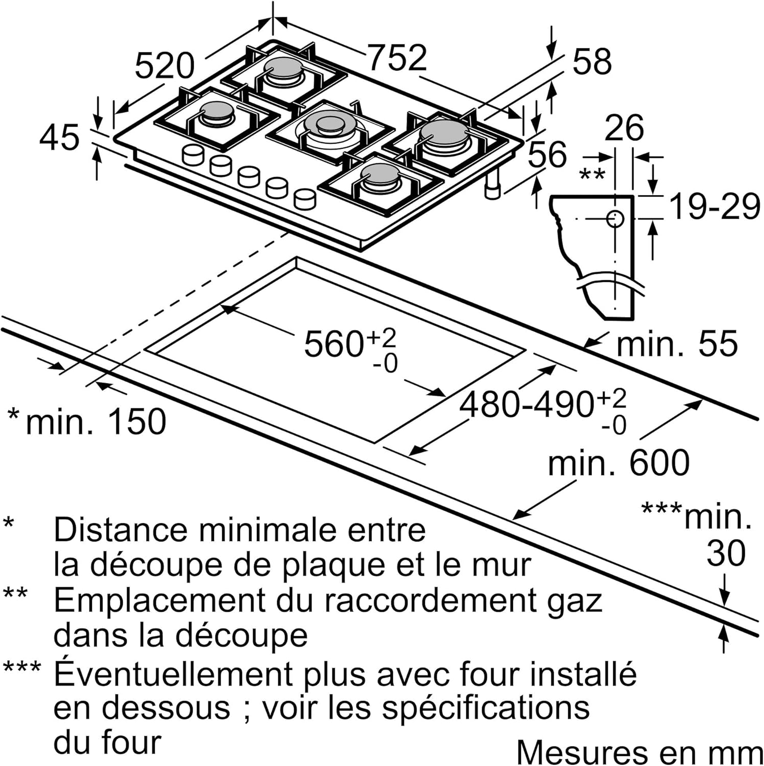 This gas cooktop features five powerful burners, including a 4 kW wok burner, perfect for quickly cooking a variety of dishes. Its elegant design, with a black tempered glass panel, independent cast iron pot rack, and control knobs, adds a modern touch to your kitchen. FlameSelect technology provides precise flame adjustment with nine preset levels; the ergonomic front knobs are easy to operate; and one-handed ignition is possible. The gas safety system uses thermocouples to automatically cut off the gas supply when the flame goes out, ensuring safe use. Product dimensions: 54 x 75.2 x 52 cm; required installation space: 45 x 56 x (48 - 49.2) cm; natural gas compatible; butane and propane gas cylinders included.