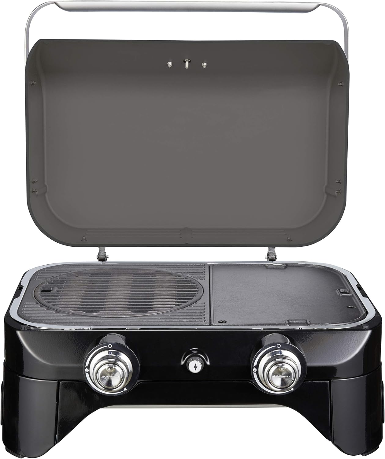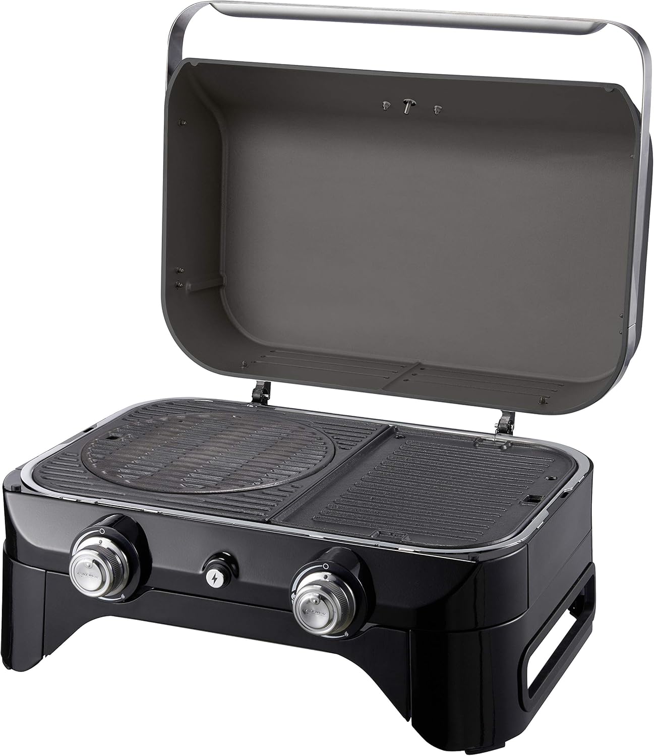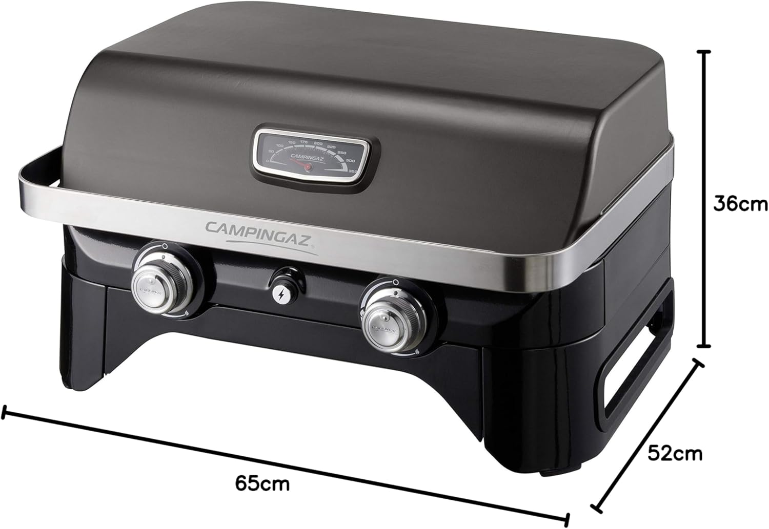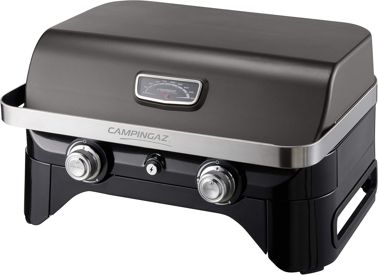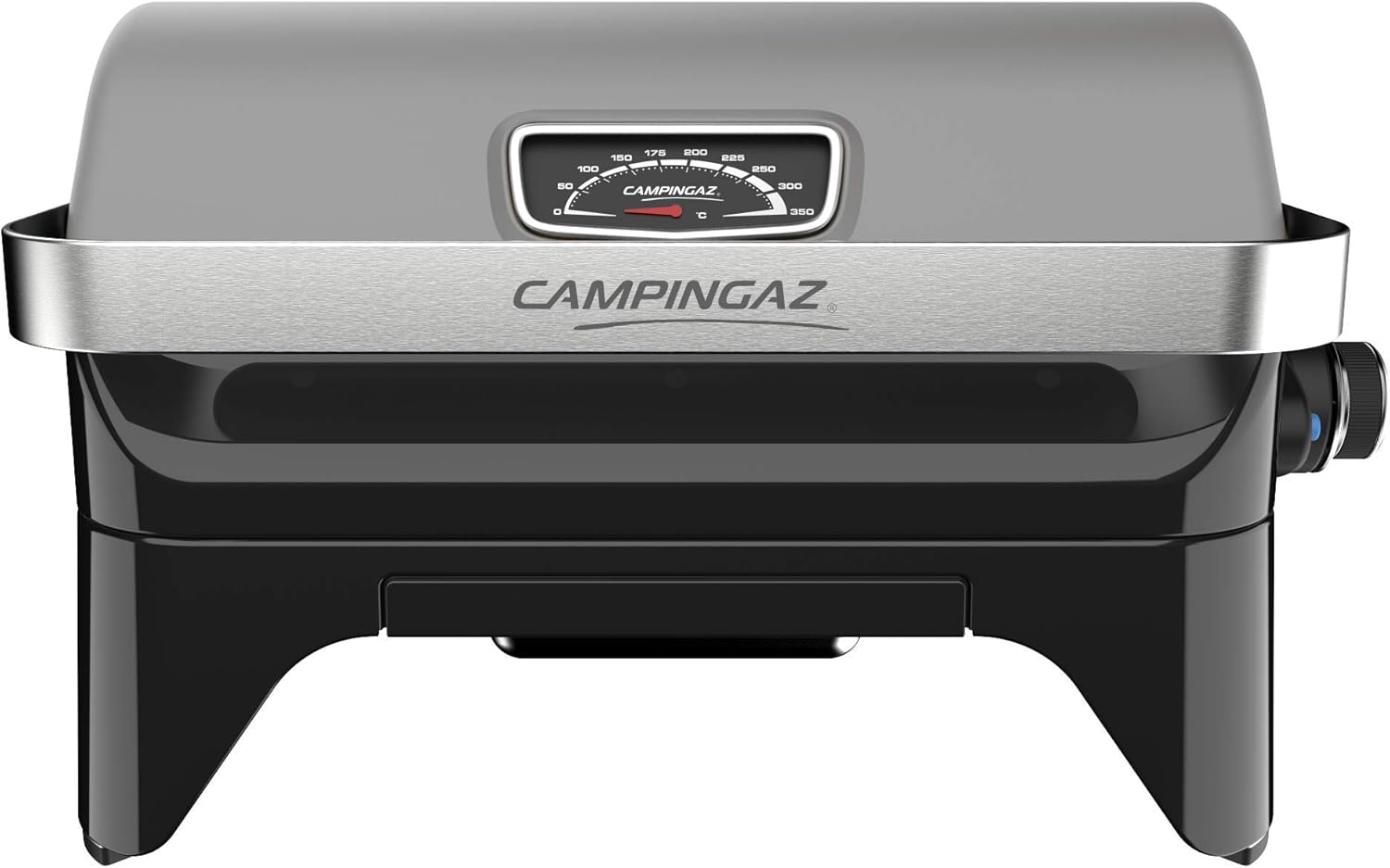 • Attitude2go, Low Smoke Tabletop BBQ, Portable BBQ with Lid, Thermometer, and Cast Iron Grill, Power Supply: CV 470 Plus Gas Cartridge, Grey
