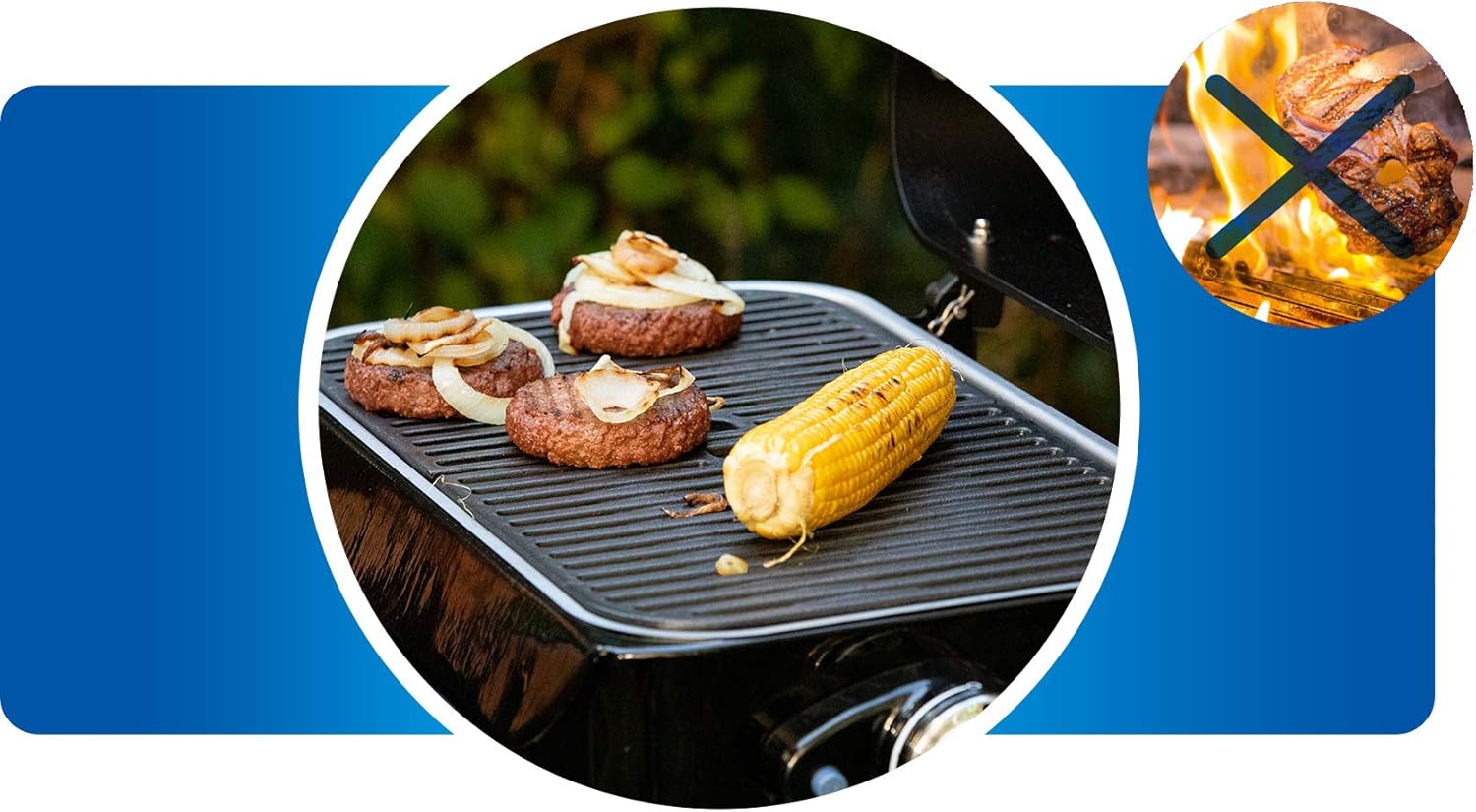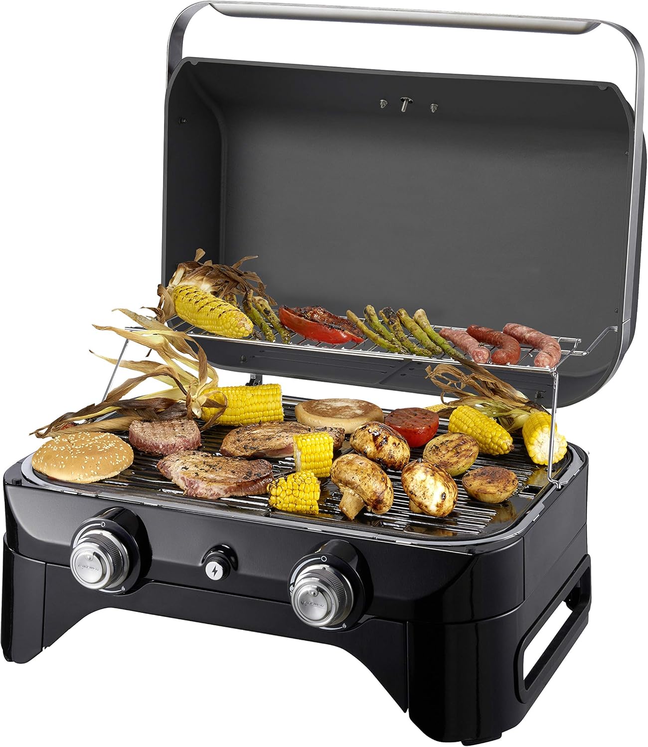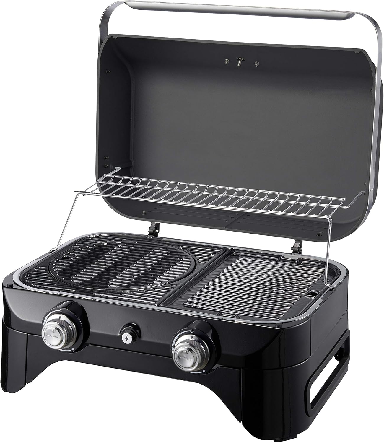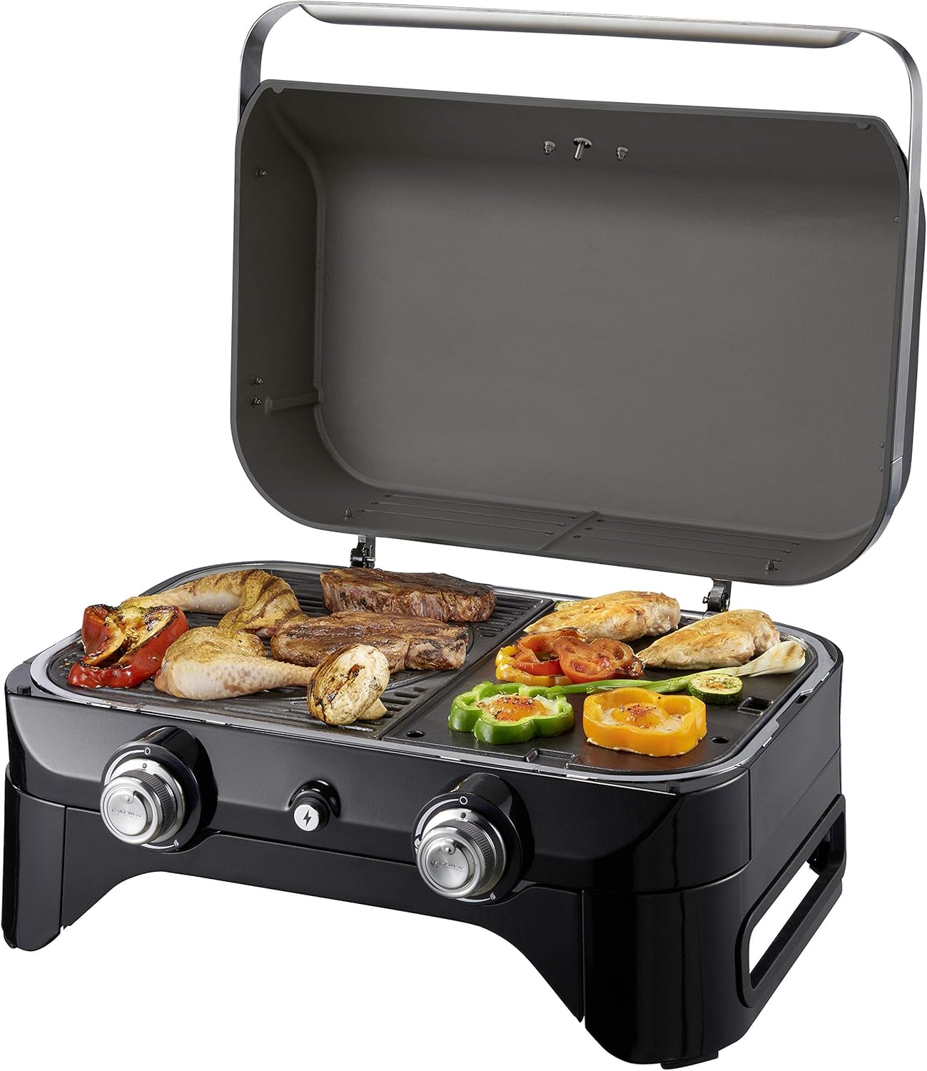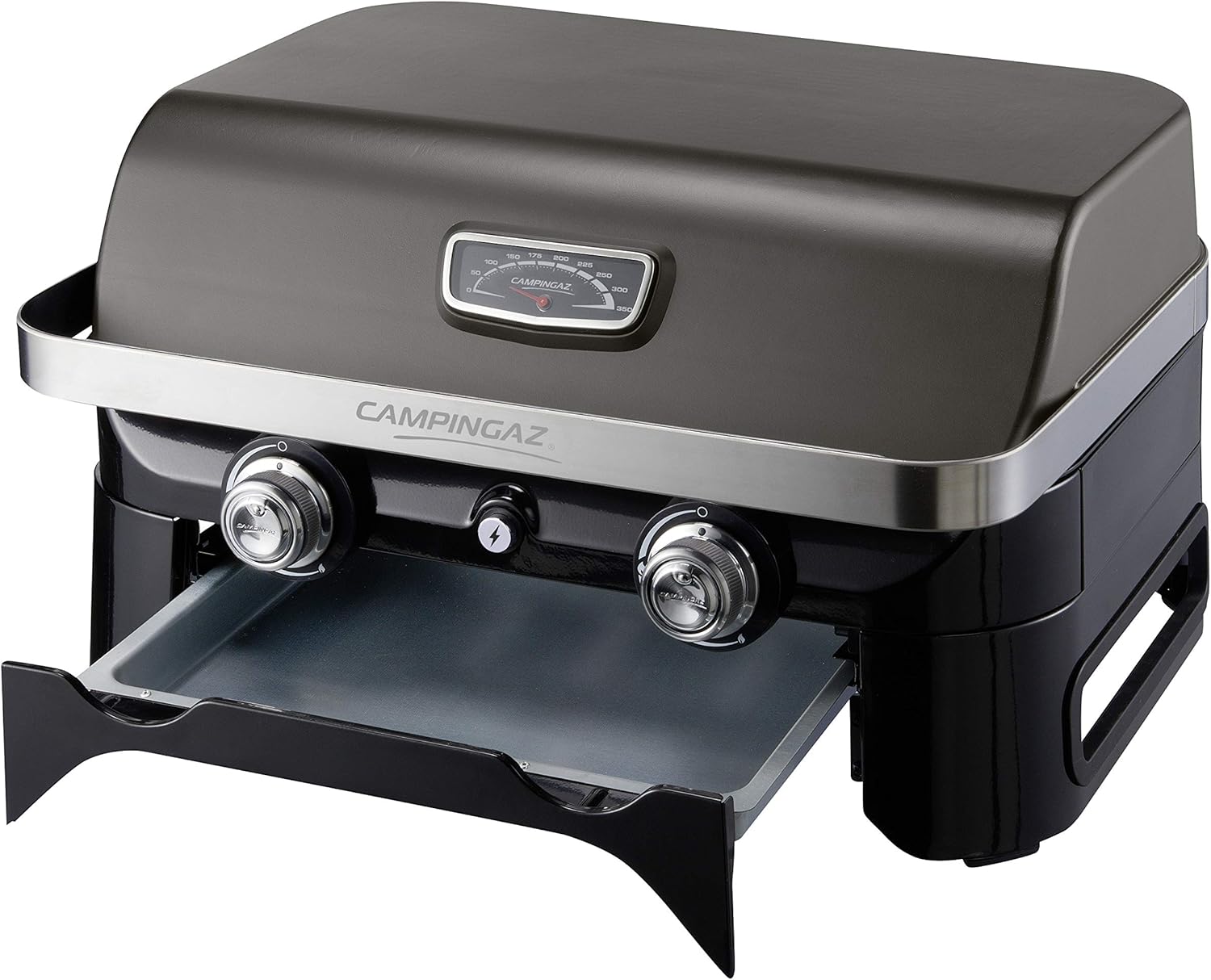 • Attitude2go, Low Smoke Tabletop BBQ, Portable BBQ with Lid, Thermometer, and Cast Iron Grill, Power Supply: CV 470 Plus Gas Cartridge, Grey