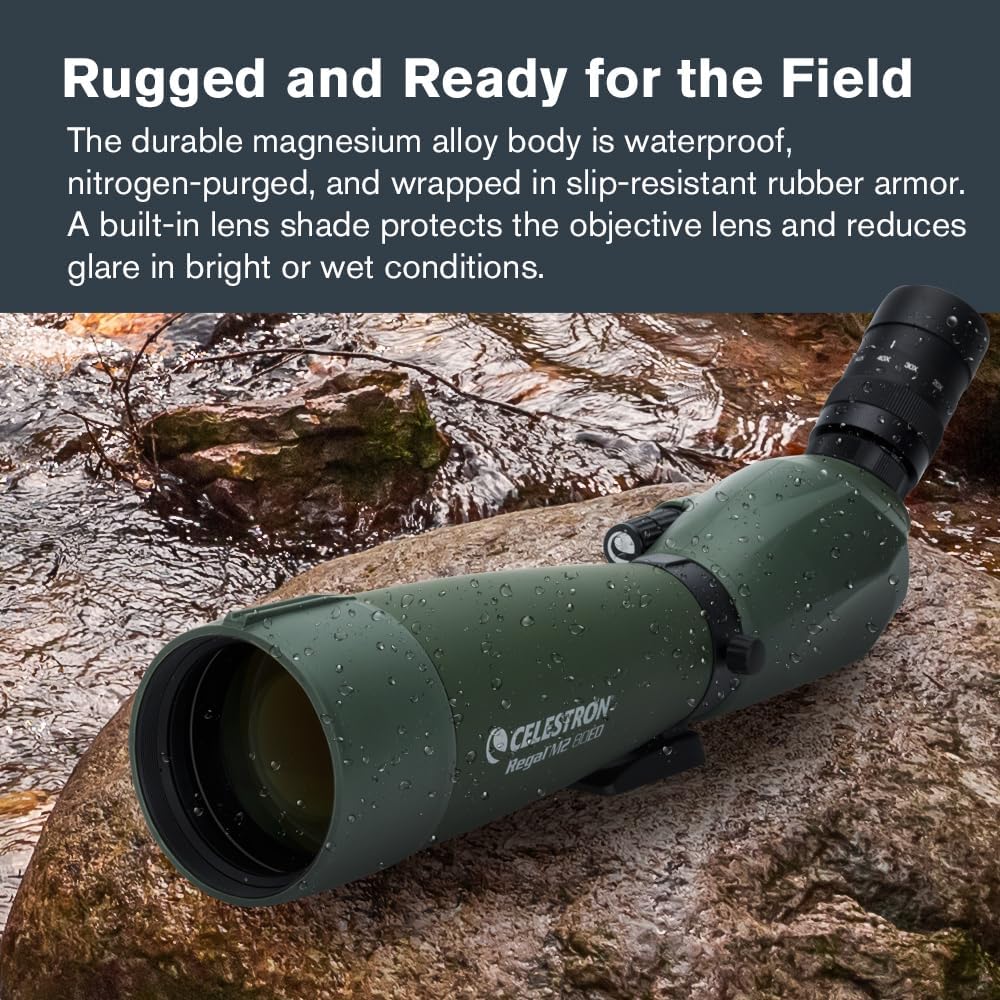 ED-grade lens: Utilizes ultra-low dispersion optical glass with exceptional dispersion properties, reducing chromatic aberration for sharp, clear, and color-corrected images. XLT lens coating: Employs Celestron's exclusive XLT multi-layer optical coating, the same coating used in observatory-grade telescopes. Optimizes light transmission in the optical path for brighter images. Perfect viewing angle: Use the included 20-60x zoom eyepiece or any other 2.5cm astronomical eyepiece. The Regal M2 ED's rotating tripod allows you to adjust the eyepiece to your ideal viewing angle. All necessary accessories are included: a padded carrying case, lens cap, eyepiece cap, storage cover for the eyepiece and eyepiece mount, a T-adapter for connecting to a DSLR camera, a cleaning cloth, and an instruction manual. Unparalleled warranty and after-sales service: As a leading company in sports optics and telescopes established in California since 1960, you can buy with confidence. You will also enjoy a limited lifetime warranty.