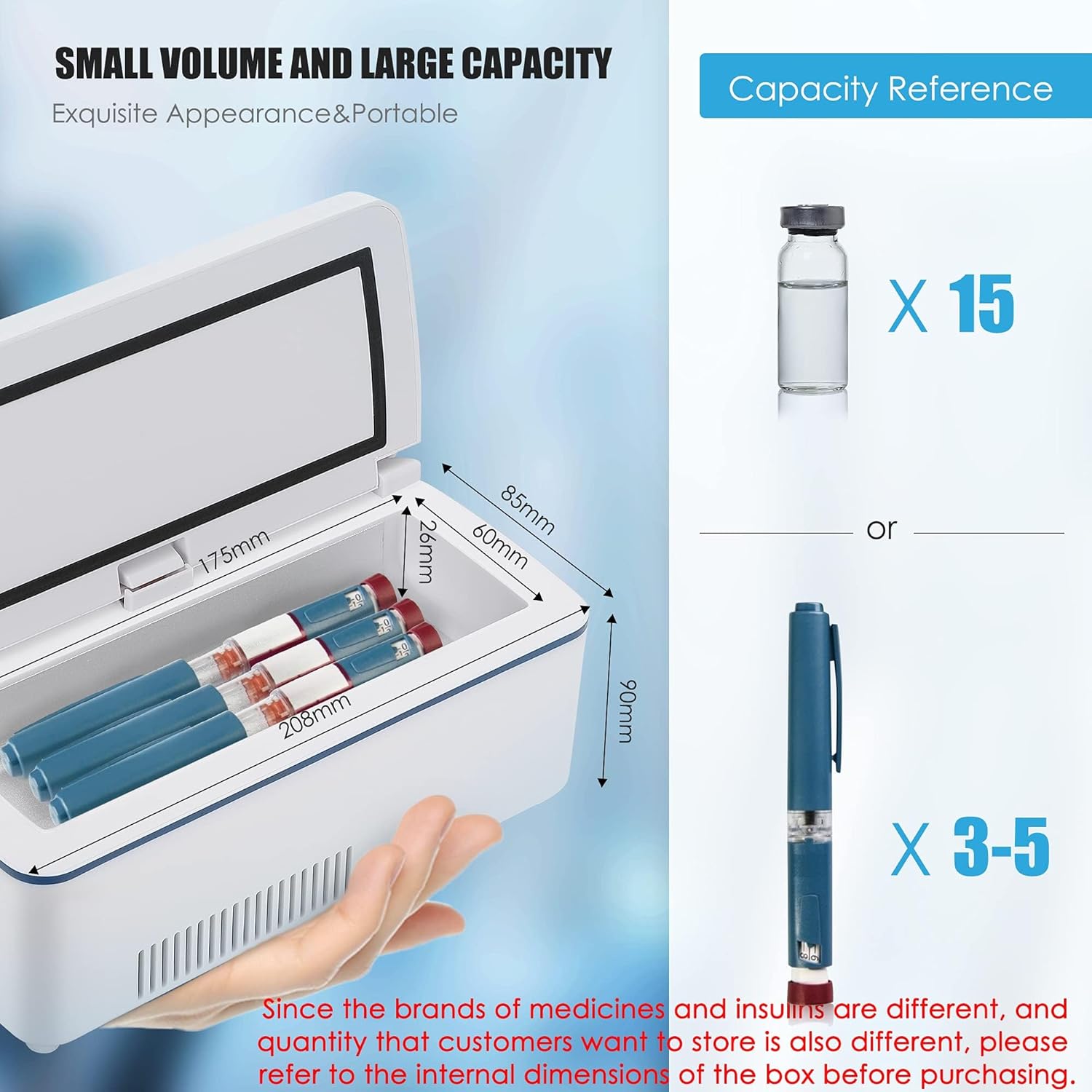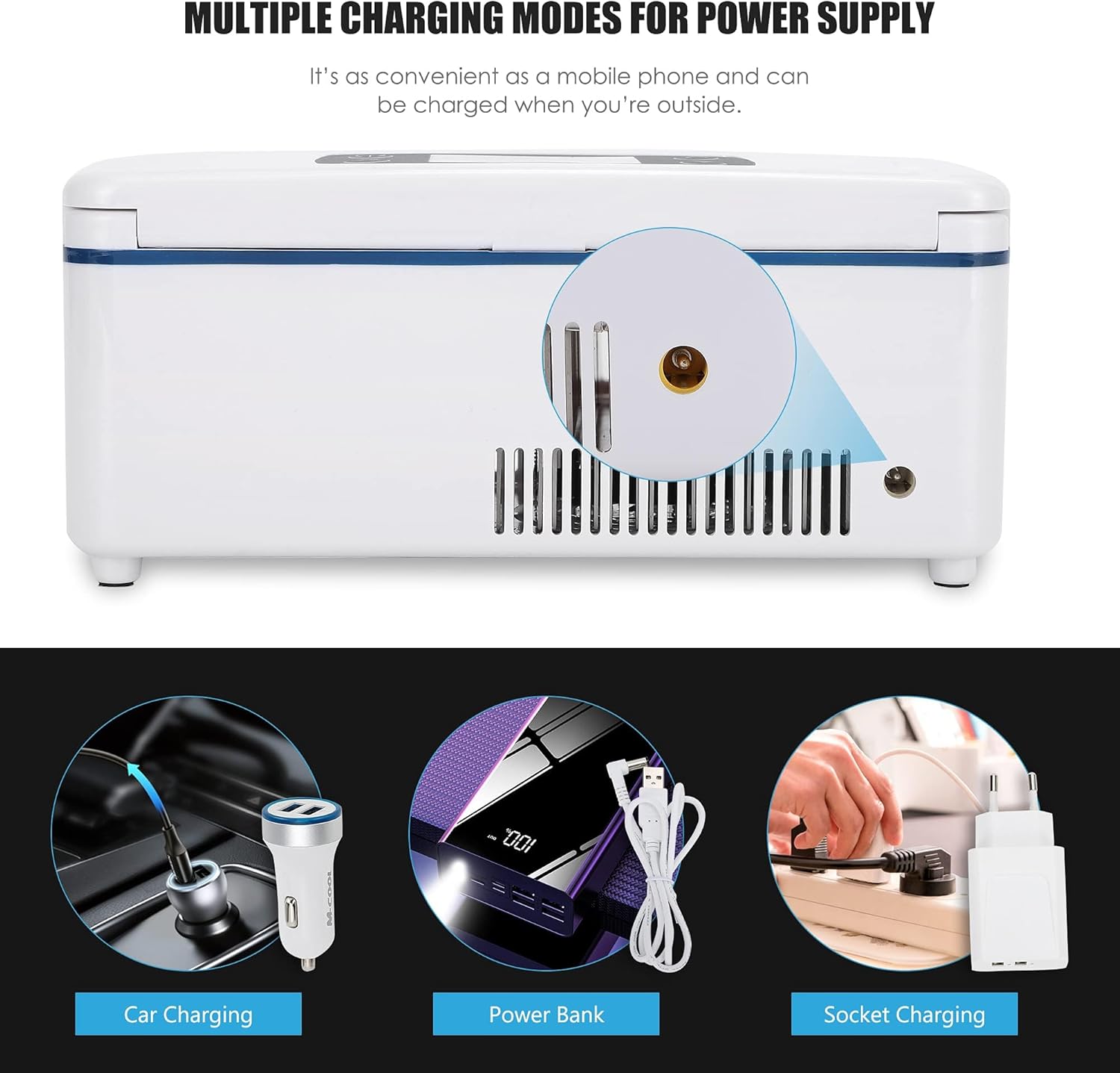 Large-Capacity Refrigeration Space - Our insulin cooler boasts a large refrigeration space of 175 * 60 * 26 mm, capable of storing nearly 3 months' worth of medication, approximately 3-5 insulin pens/9 vials of insulin. Extremely Long Standby Time - Equipped with a built-in 10400mAh high-quality battery, it ensures 8-12 hours of standby time after a full charge. With a full charge, the refrigeration temperature can reach 2-8 (below 25). Intelligent Cooling System - Utilizes an intelligent cooling system with a temperature setting range of 2-25. Features an intelligent alarm system, including low battery and high/low temperature alarms. Multiple Power Supply Options - Our portable insulin cooler supports multiple power supply options, including built-in/external battery power, car charging, computer charging, laptop charging, and wall socket charging. Lightweight and Quiet - Weighing only 780 grams, the medicine cooler is easy to carry. Its operating noise is below 30 decibels, creating a quiet environment. It truly is a great travel companion.