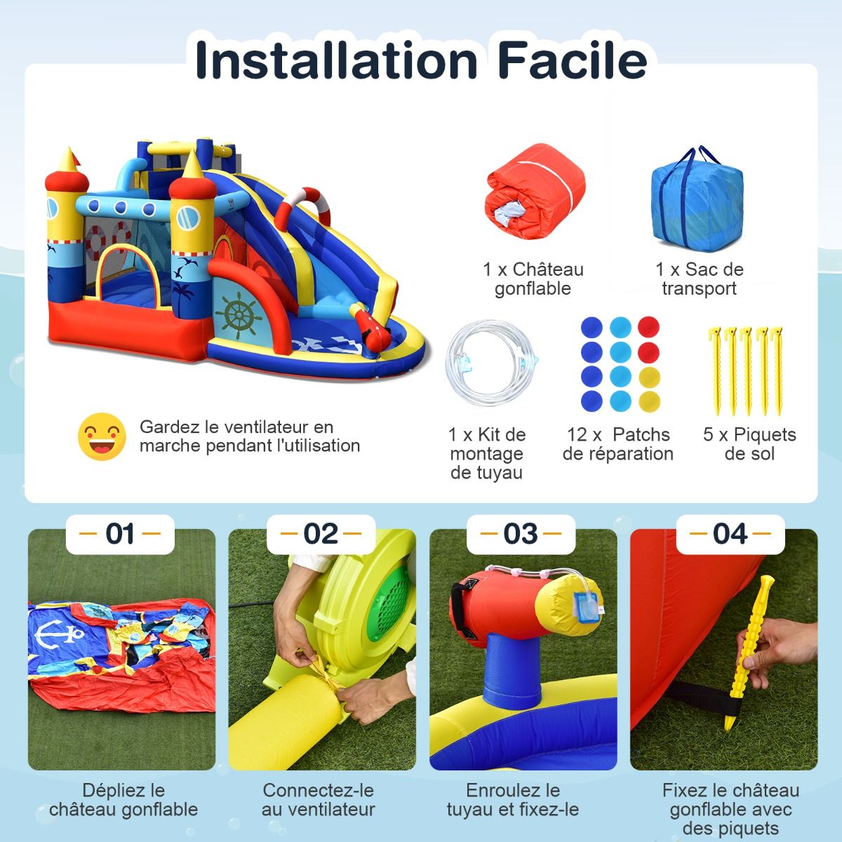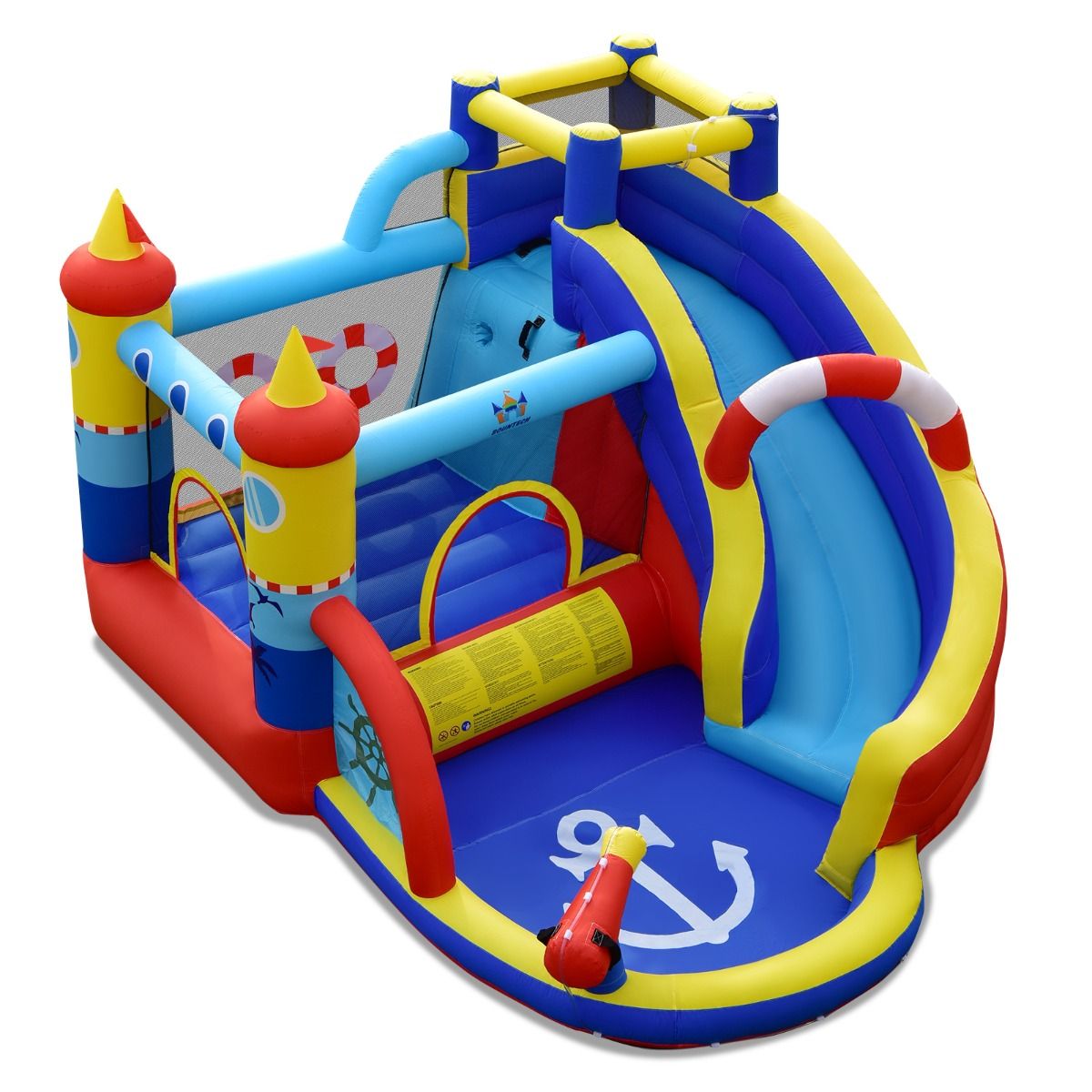Looking for healthier activities for kids to fill their free time? Then this inflatable castle is the perfect choice for a hot summer outdoor party. It features a long slide leading to a thrilling wading pool, creating a backyard water park for endless fun. Children can also jump, climb, and play other fun games like darts. More importantly, this inflatable castle is themed around an island cruise ship, sure to create unforgettable memories. Thick Oxford cloth ensures the castle's superior durability, while mesh walls provide safety for children jumping. Let the kids set sail now! Product Features: Inflatable Castle, Endless FunThis inflatable castle has an adorable boat-shaped exterior that instantly attracts children's attention. It combines a curved slide, wading pool, jumping area, climbing wall, and throwing games, greatly enriching children's playtime and allowing them to share happiness with friends. Suitable for All Year RoundIn addition to various entertainment functions, this backyard water park is equipped with sprinklers and water cannons on top, continuously spraying cool water to dispel the summer heat. Alternatively, you can choose dry use, allowing children to enjoy fun all year round. Safety Netting and HandrailsA breathable netting wall surrounds the jumping area, protecting children's safety while they jump. You can also supervise the children inside at any time. Furthermore, the long slide is equipped with raised handrails to ensure safe sliding. Thick Oxford Cloth, DurableThis giant water slide is made of thick, waterproof, and tear-resistant Oxford cloth, ensuring a long lifespan and bringing many happy childhood memories to children. The tightly stitched colorful fabric creates a dreamlike playground for children. Practical Accessory KitFor ease of use, this inflatable castle comes with a very practical accessory kit, including a storage bag, a set of hoses, 12 repair patches, and 5 ground pegs. Therefore, you can easily build and store this inflatable castle. Product Features: Includes a water slide, inflatable structure, wading pool, and climbing wall. Children can play with their friends and cool off with the water spray system. It also comes equipped with darts and water cannons for added fun. A protective mesh wall ensures good ventilation. Made of select waterproof Oxford cloth with tight stitching, it is durable and tear-resistant. The cute boat-shaped design will leave a unique impression on children. Thoughtful accessories such as a storage bag are also included. Product Specifications: Colors: Blue + Yellow + Red + White. Material: Oxford cloth. Overall Dimensions: 360cm x 290cm x 200cm (Length x Width x Height). Net Weight: 18.6kg. Maximum capacity for 3 children. Recommended Age: 3-12 years. Inflatable Part Weight: 90kg; Individual Weight Limit: 30kg; Package Includes: 1 inflatable castle, 1 carrying bag, 1 set of hoses, 12 repair kits, 5 inflatable structure pegs, 1 installation instruction booklet;