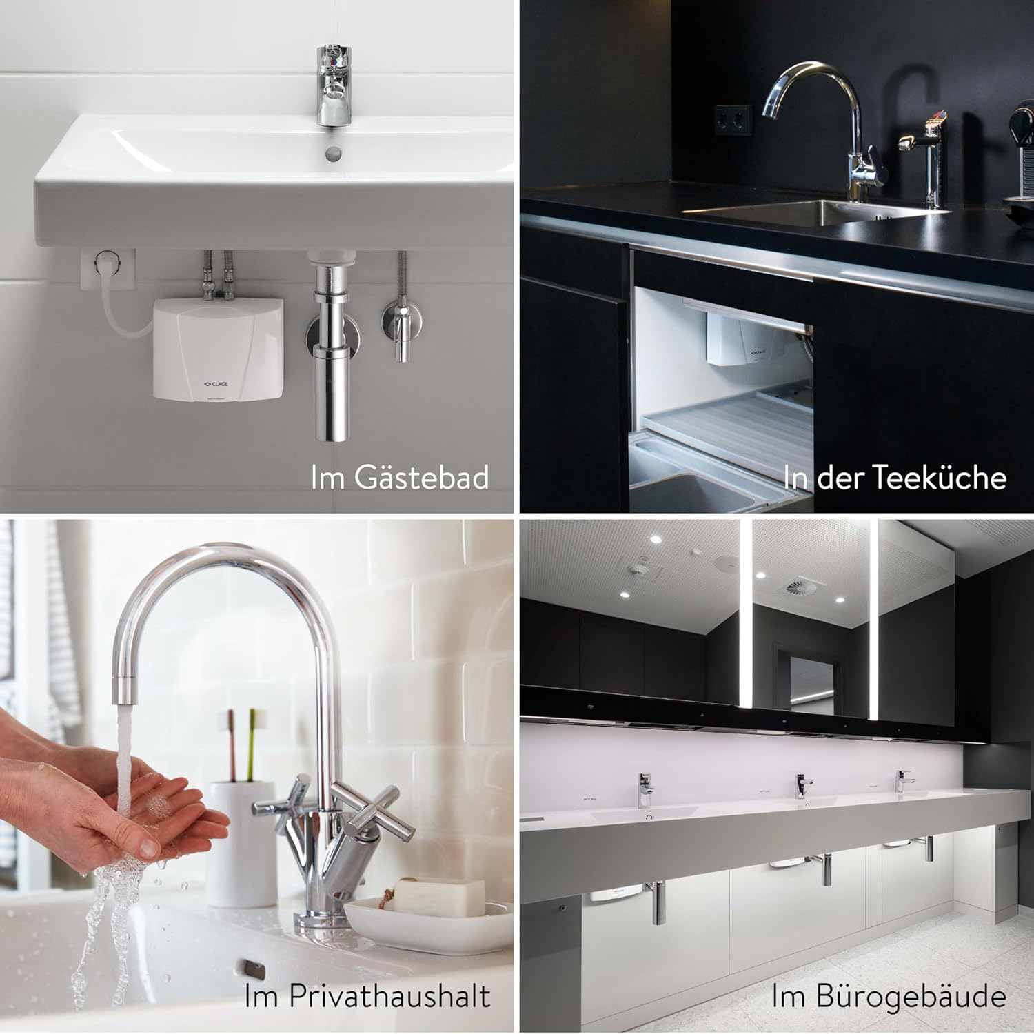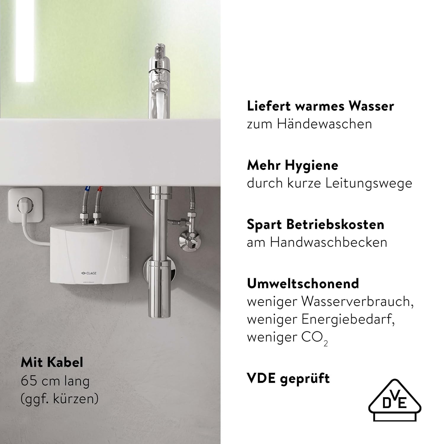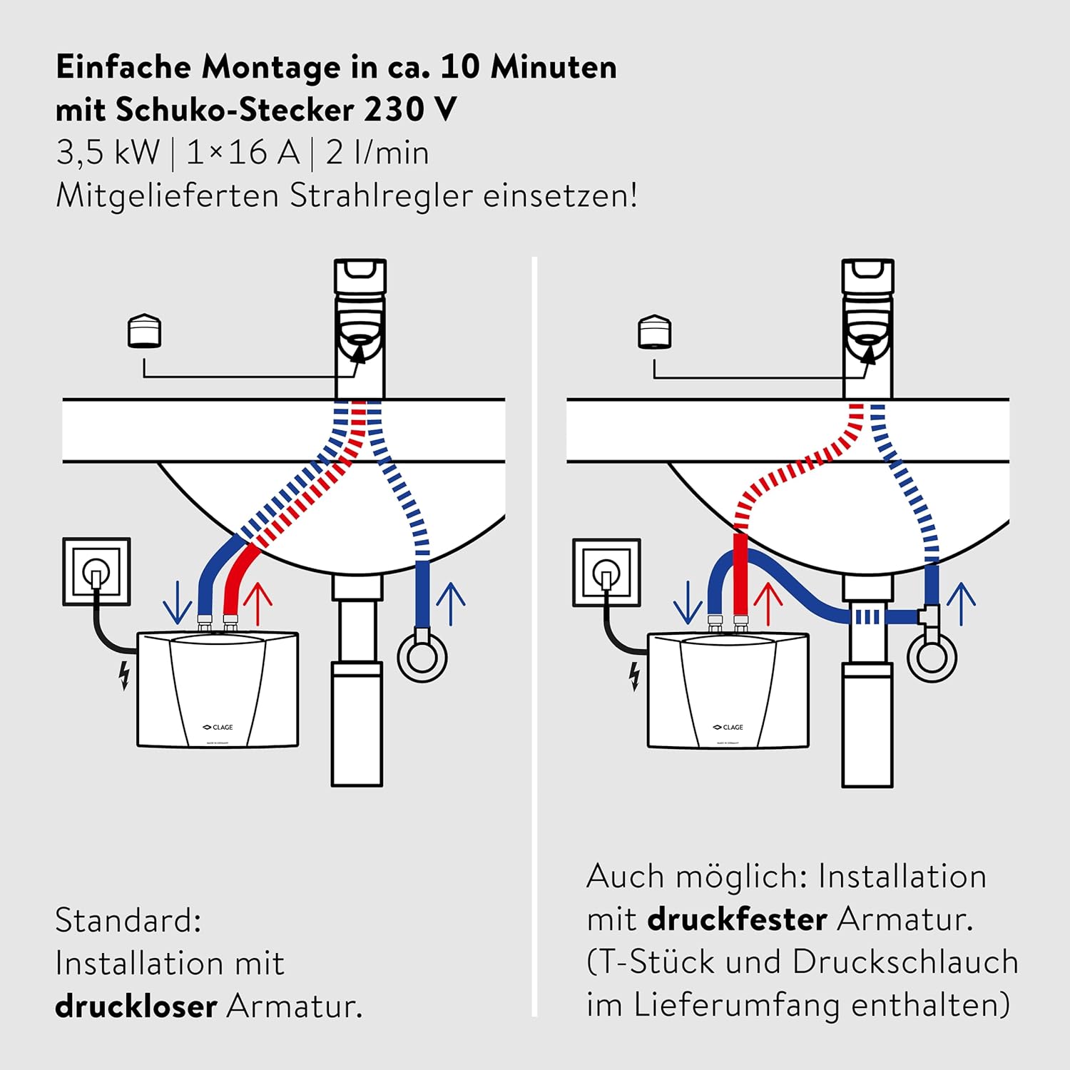 Hot water output: 15Spend to 40Spend = 2 liters/minute. Rated power: 3.5 kW, 230 volts, 16 amps, plug and play. Small hydraulically controlled recessed water heater for washbasins. Installation method: pressure-resistant, 10 bar. Application: bathroom washbasin. CLAGE Haustechnik CLAGE MBH 3 Small Instantaneous Water Heater (Pressure-Resistant) Durable, robust, and reliable.