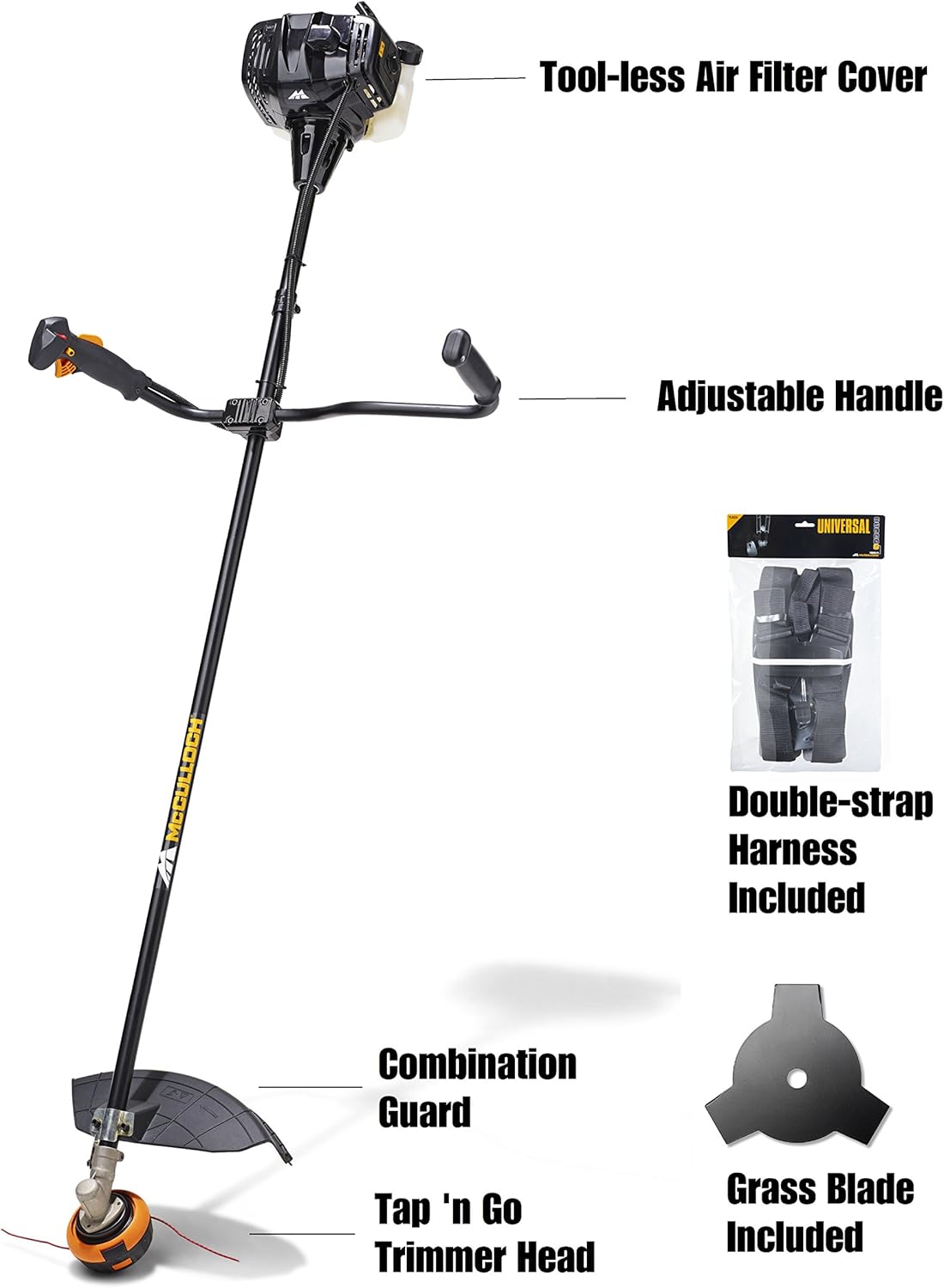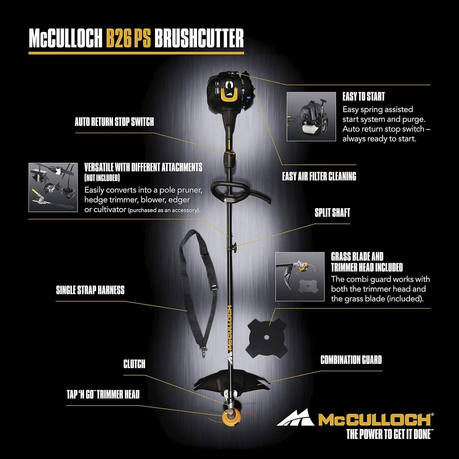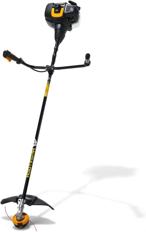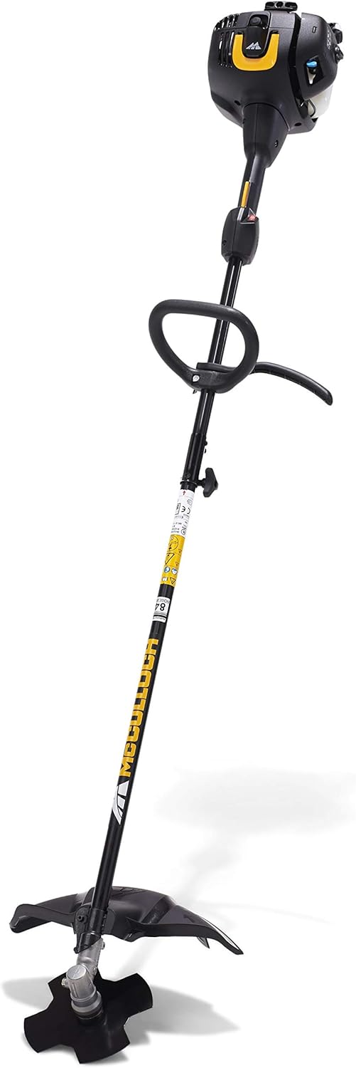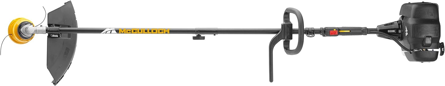 About this item Variable working width: The device has a working width of 40 cm when using a cutting line, 20 cm with the grass blade High-performance engine: The petrol brushcutter with a power of 0.75 kW and a displacement of 26 cm3 cuts dense grass with ease Easy maintenance: The air filter cover can be removed without tools, which greatly facilitates maintenance For longer working hours: Thanks to the strap, the weight is evenly distributed across your shoulders. The adjustable P-shaped handle ensures optimal ergonomics. The scope of delivery includes: 1 McCulloch B26 PS petrol brushcutter, 1 cutting head, 1 grass blade, 1 single strap (Art. No. 00096-72.078.01). McCulloch B26 PS Brushcutter: With the McCulloch B26 PS brushcutter, you can complete any job in no time. This powerful two-stroke brushcutter is easy to start thanks to the manual fuel pump. All pending tasks can be tackled immediately. Soft Start technology reduces starting effort by 40%, making it even easier to start the brushcutter. McCulloch's unique Tap'n Go dual line feed system ensures fewer interruptions. The line is automatically extended as soon as the cutting head is tapped on the ground. The handle is also adjustable, allowing you to find a comfortable working position. Thanks to its features and high quality standards, the B26 PS brushcutter delivers "the power to get it done." Technical specifications: Soft Start Primer Fuel Pump, Dual Line Feed System (Tap'n Go), Safety Device, Two-Part Guide Tube, Adjustable Handle, Automatic On Off Switch, Tool-Free Air Filter Cover