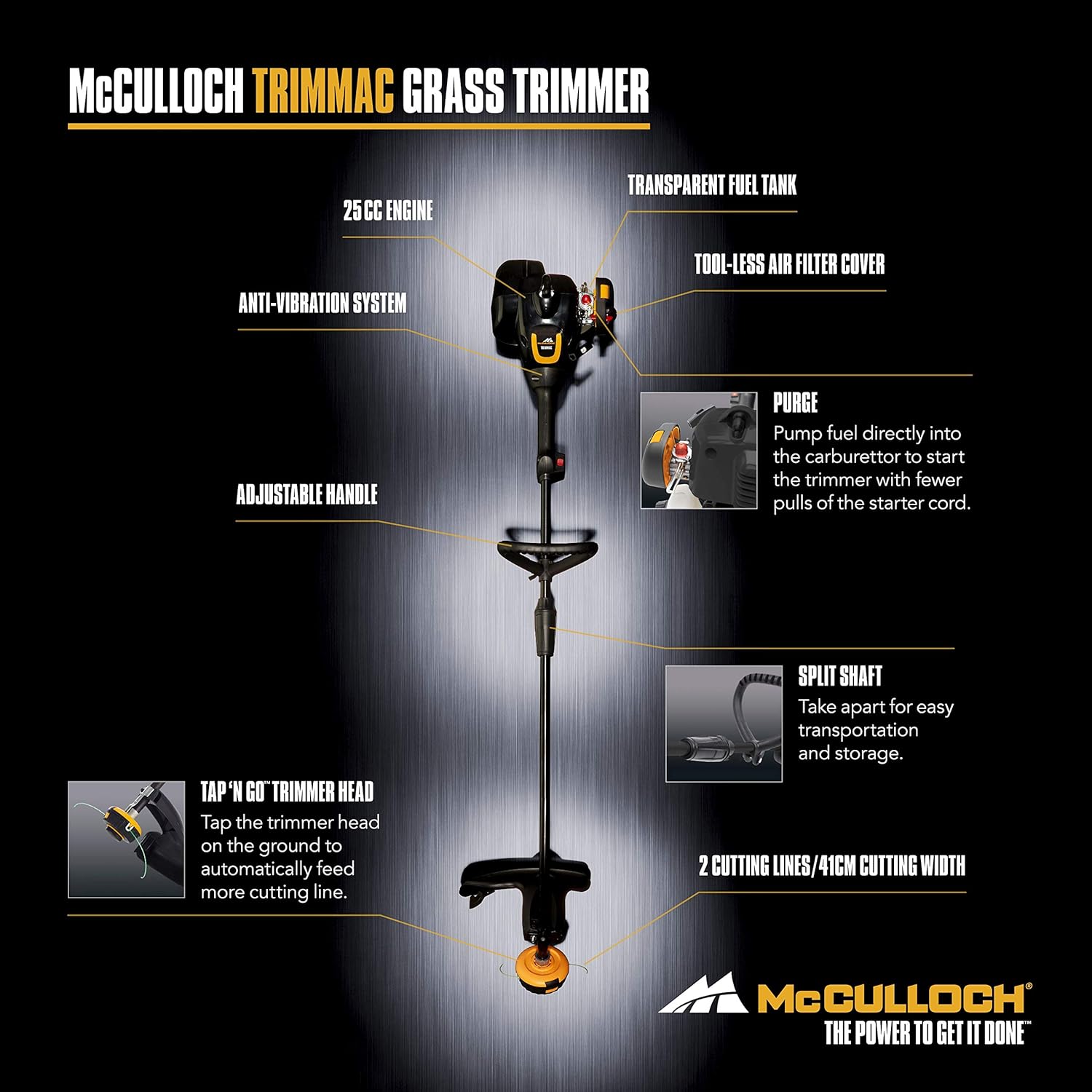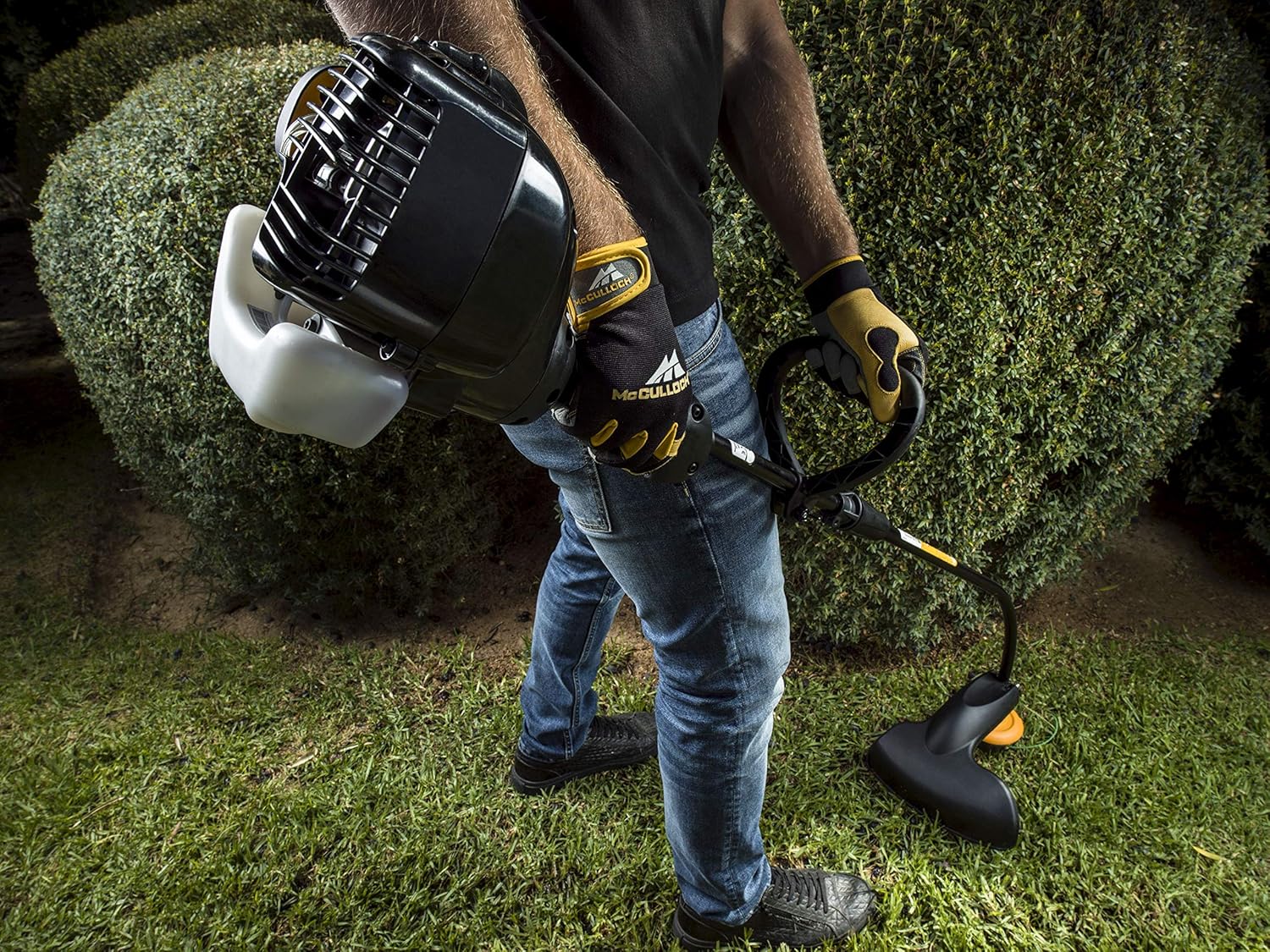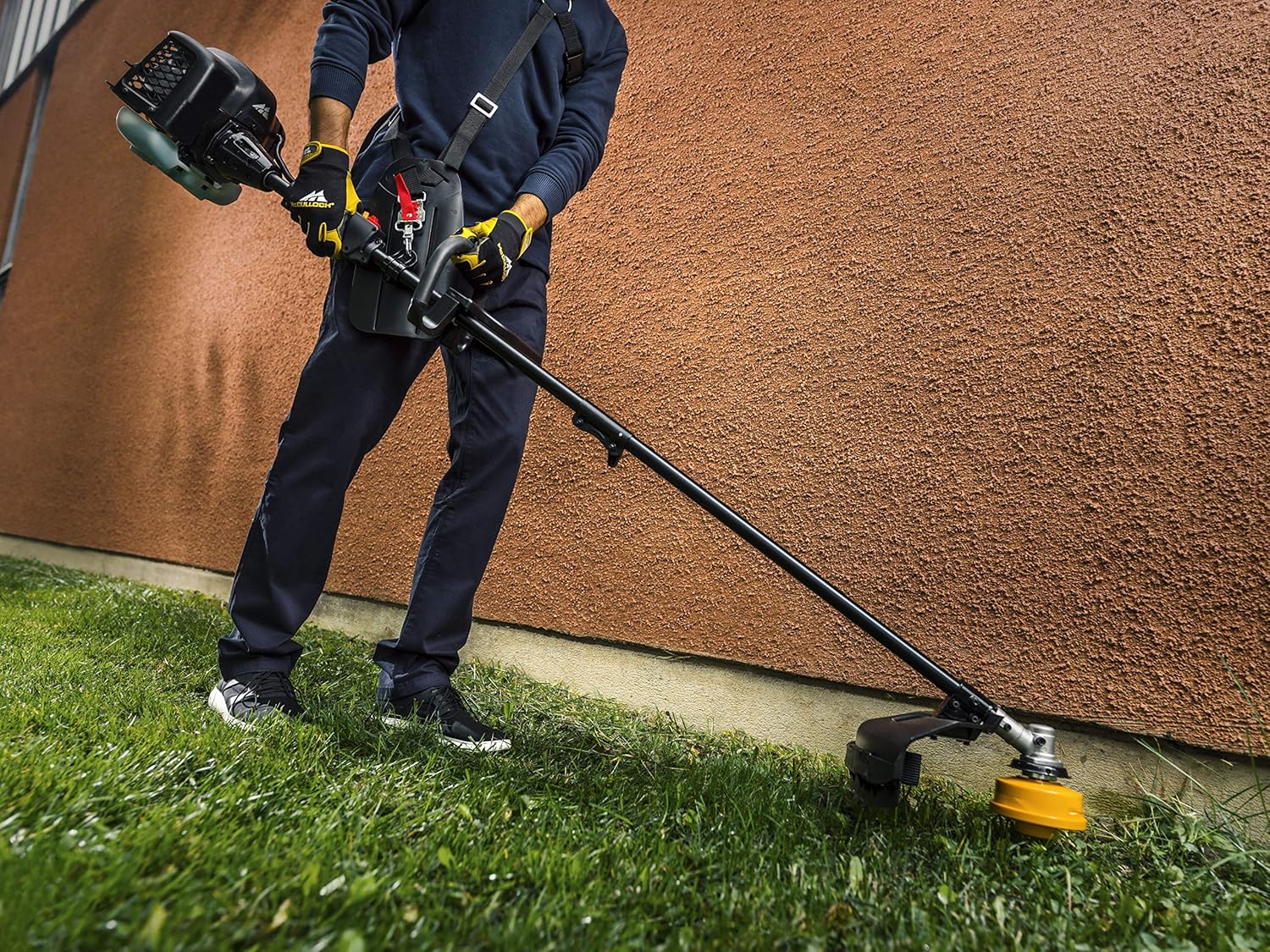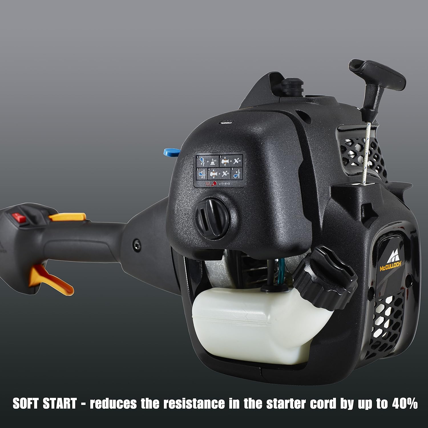 About this item Variable working width: The device has a working width of 40 cm when using a cutting line, 20 cm with the grass blade High-performance engine: The petrol brushcutter with a power of 0.75 kW and a displacement of 26 cm3 cuts dense grass with ease Easy maintenance: The air filter cover can be removed without tools, which greatly facilitates maintenance For longer working hours: Thanks to the strap, the weight is evenly distributed across your shoulders. The adjustable P-shaped handle ensures optimal ergonomics. The scope of delivery includes: 1 McCulloch B26 PS petrol brushcutter, 1 cutting head, 1 grass blade, 1 single strap (Art. No. 00096-72.078.01). McCulloch B26 PS Brushcutter: With the McCulloch B26 PS brushcutter, you can complete any job in no time. This powerful two-stroke brushcutter is easy to start thanks to the manual fuel pump. All pending tasks can be tackled immediately. Soft Start technology reduces starting effort by 40%, making it even easier to start the brushcutter. McCulloch's unique Tap'n Go dual line feed system ensures fewer interruptions. The line is automatically extended as soon as the cutting head is tapped on the ground. The handle is also adjustable, allowing you to find a comfortable working position. Thanks to its features and high quality standards, the B26 PS brushcutter delivers "the power to get it done." Technical specifications: Soft Start Primer Fuel Pump, Dual Line Feed System (Tap'n Go), Safety Device, Two-Part Guide Tube, Adjustable Handle, Automatic On Off Switch, Tool-Free Air Filter Cover