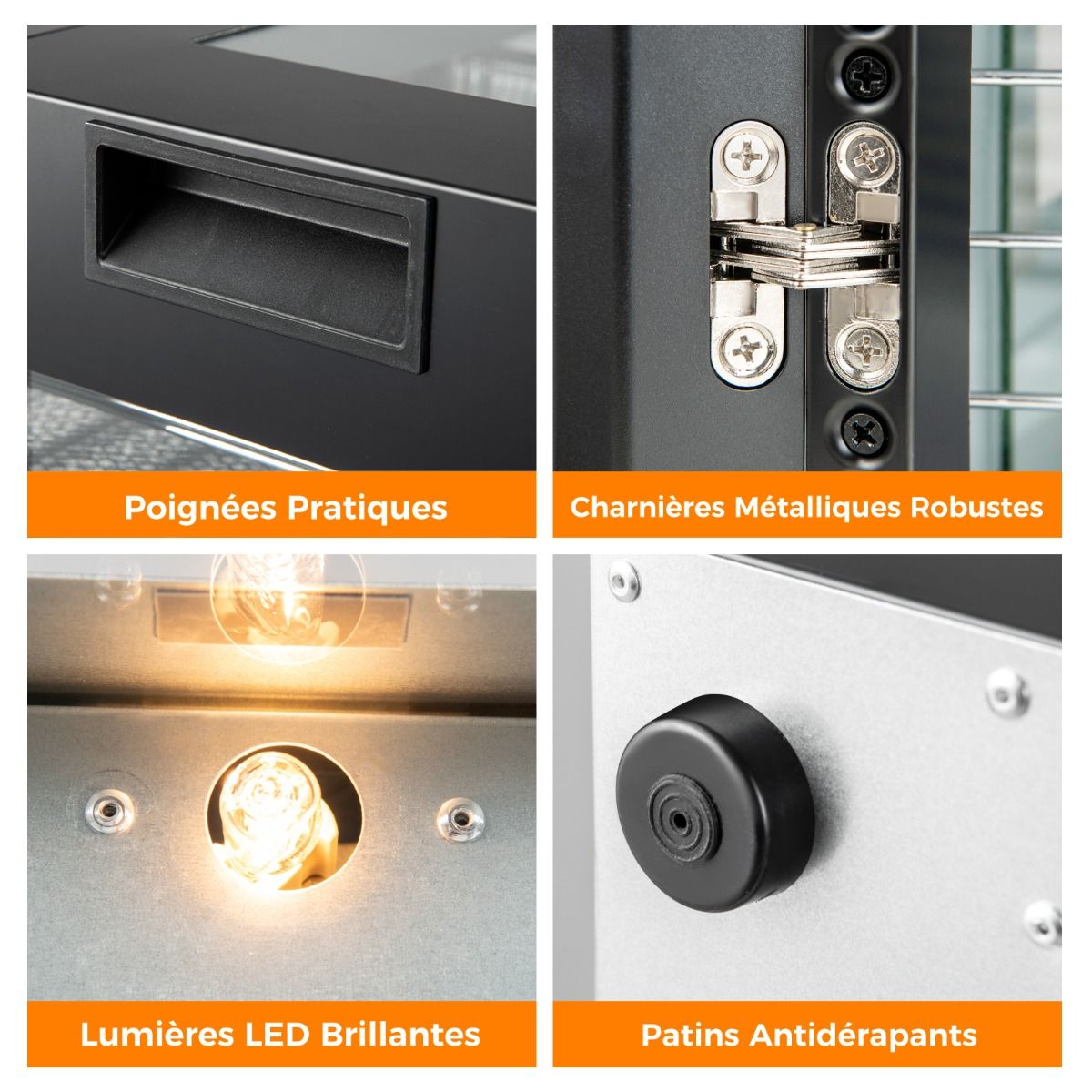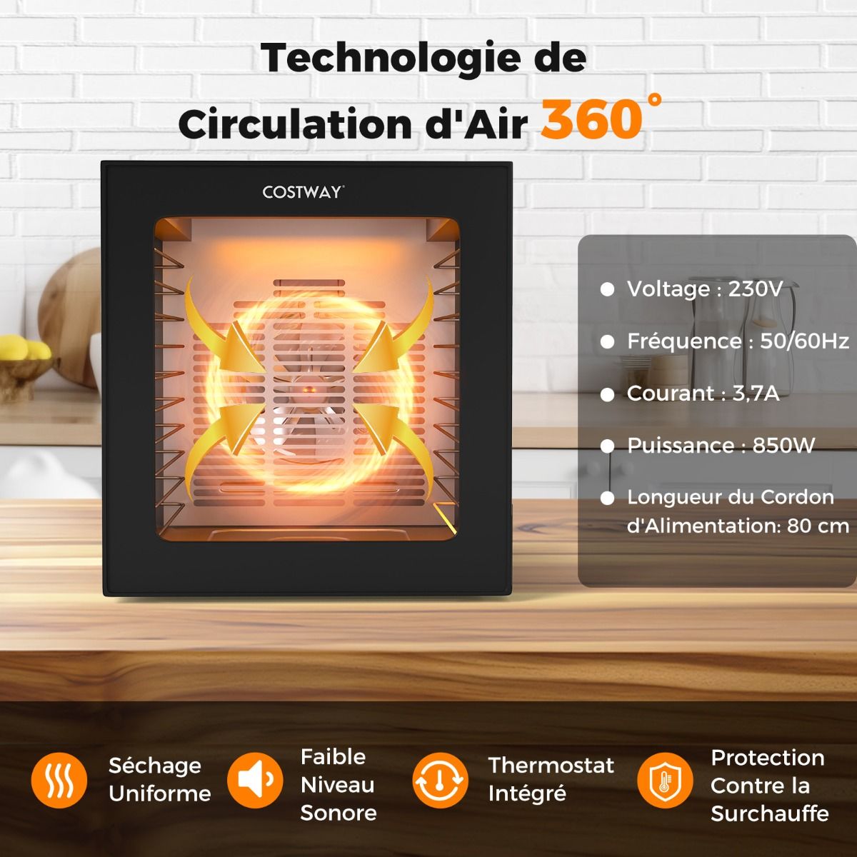 Create personalized dehydrated foods with our food dehydrator! This food dehydrator uses 360Spend air circulation technology to ensure your favorite snacks are dried evenly. Four transparent windows and bright LED lights allow you to clearly observe the drying process. The intuitive control panel offers 10 preset programs, as well as customizable temperature and time settings to meet your different needs. Furthermore, sturdy metal hinges, a convenient handle, and a thermostat with built-in overheat protection ensure safe and smooth operation. This food dehydrator comes with 10 stainless steel trays, a mesh strainer, and a drip tray that doubles as a fruit roller, making your cooking process easier and more convenient. Product Features: Improved Design for Better Visibility: The food dehydrator has windows on all four sides, allowing you to observe the drying process from the top, front, left, and right. Bright internal LED lights make it easier to monitor the drying progress. Advanced Air Circulation Technology: Thanks to 360Spend air circulation technology, this food dehydrator ensures even and thorough drying. Whether you're making fruits, vegetables, jerky, spices, or pet treats, this dehydrator ensures perfect dehydration of every food item, all at a noise level of only 48 decibels. 10 preset programs and adjustments: This dehydrator's intelligent control panel features a digital LED display and backlit buttons, allowing you to choose from 10 preset programs: apple, kiwi, banana, pear, lemon, mushroom, tomato, chicken, fish, and pork. Additionally, you can adjust the temperature (35-75Spend) and time (1-48 hours) as needed. Convenient and reliable: The sturdy metal hinges ensure a secure door closure and better temperature control. Handles on both sides make it easy to move. Furthermore, a built-in thermostat and overheat protection make this dehydrator even more reliable. This dehydrator is easy to clean and comes with a variety of accessories. It includes 10 stainless steel trays for various foods; a mesh strainer for small items; and a drip tray that can also be used as a fruit rolling mat. Each component is carefully designed for easy, efficient use and cleaning, simplifying your cooking process. Powerful features: Four-sided visual design and bright LED lights facilitate monitoring; 360Spend air circulation technology ensures even and thorough drying; built-in thermostat and overheat protection enhance reliability; equipped with a digital LED display and backlit buttons for easy operation; temperature range of 35-75Spend, timer from 1 to 48 hours, suitable for various foods; 10 preset programs for ultimate convenience; sturdy metal hinges and non-slip base ensure safety and stability; convenient handles on both sides facilitate movement; equipped with cooking accessories for simple operation. Specifications: Color: Black; Material: Stainless steel, galvanized metal, PP; Product dimensions: 33 x 40 x 35.5 cm (L x W x H); Stainless steel tray dimensions: 30.3 x 28.4 cm (L x W); Mesh screen dimensions: 26 x 26 cm (L x W); Collection tray dimensions: 29 x 28 cm (L x W); Power cord length: 80 cm; Voltage: 230V; Frequency: 50Hz; Current: 7.1A/3.7A; Power: 850W; Net weight: 9.4 kg; Package list: 1 x Food dehydrator; 10 x Stainless steel trays; 1 x Mesh screen; 1 x Drip tray; 1 x Instruction manual