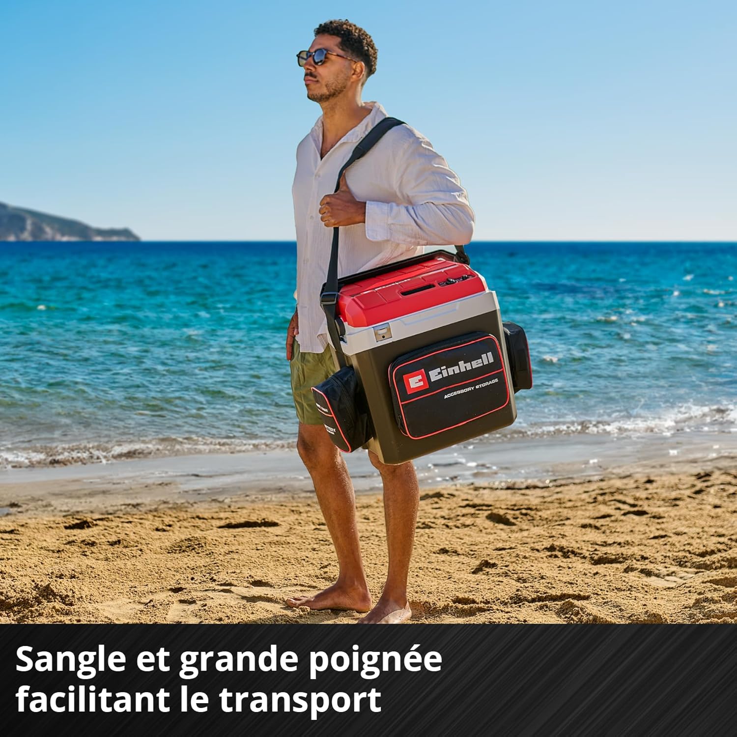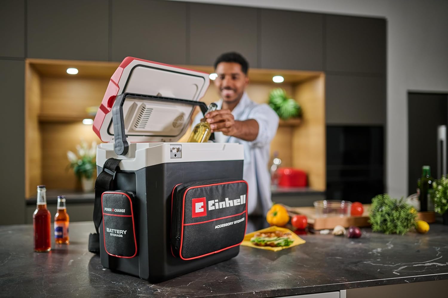 Power Conversion The TE-COL 18/27 Li-Solo cordless portable cooler is part of Einhell's power conversion series, which allows for flexible combination of batteries, chargers, and the device. Hybrid Power Automatic power mode selection: Connect to a 230V power outlet or 12V car cigarette lighter via the included cable, or use an 18V battery. Capacity This portable cooler has a 27-liter capacity, accommodating 36 0.33-liter cans of beverages, 20 0.5-liter bottles of beverages, or 6 1.5-liter large bottles of beverages. It also features a practical divider grid. Functionality A rotary knob and function selector allow for continuous temperature adjustment of the cooler, up to 20Spend or 60Spend below ambient temperature, for switching between hot and cold foods. Pockets Equipped with a large accessory pocket, a side pocket with an integrated battery compartment, and a pocket for storing spare batteries to extend battery life. Portability This portable cooler features a wide handle and shoulder strap for easy carrying. The cooler also integrates a bottle opener for added practicality. Batteries sold separately The Einhell TE-COL 18/27 Li-Solo cordless portable cooler does not include Power X-Change batteries or a charger. Note: This product contains fragrance ingredients that may cause allergies. Note: Wear protective gear when using. Do not use on public roads. The Einhell TE-COL18/27Li-Solo cordless portable cooler is an indispensable appliance in your daily life. Whether carrying chilled drinks or hot food in the summer, this portable cordless cooler is ideal for leisure trips and lunch breaks at construction sites. It belongs to the Einhell PowerX-Change series and is compatible with all applicable batteries. The product also includes one 230V power cord and one 12V power cord. The system automatically selects the operating mode based on available power. You can plug this product into a standard household power outlet to start cooling and continue using your vehicle's cigarette lighter socket. When operating on a 12V power supply, this portable cooler features a vehicle battery protection system to prevent deep discharge. In this case, the vehicle's battery can be used to cool the items inside. With a 27-liter capacity, it can hold 36 cans of 0.33-liter beverages, 20 bottles of 0.5-liter beverages, or 6 large bottles of 1.5-liter beverages. Internal dividers allow for flexible partitioning of the refrigerated space, and a bottle opener is integrated into the cabinet. Additionally, the cooler includes a large accessory pocket, a side pocket with a battery compartment, and a side pocket for storing spare batteries to extend operating time. This portable cooler has an energy efficiency rating of D, resulting in extremely low power consumption.