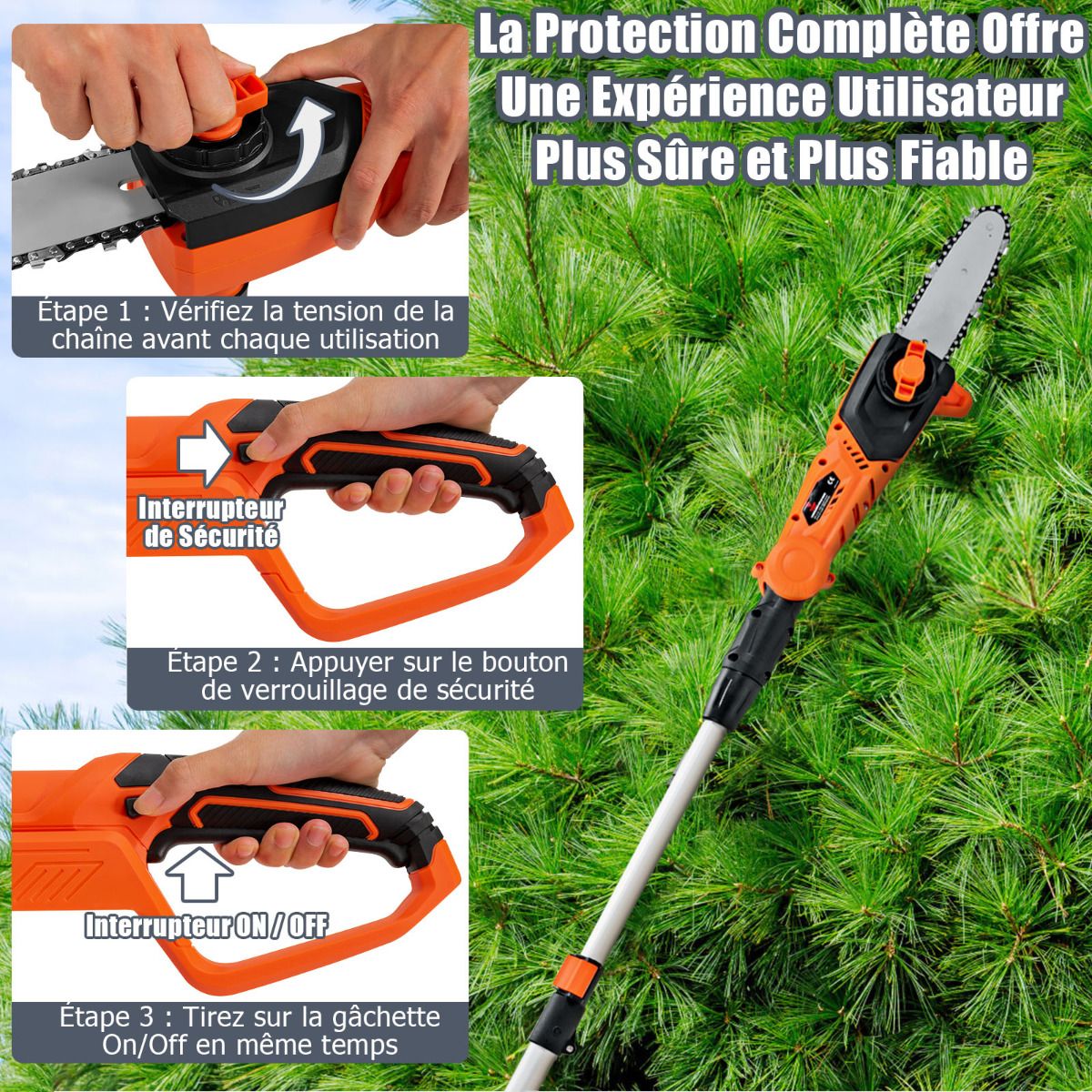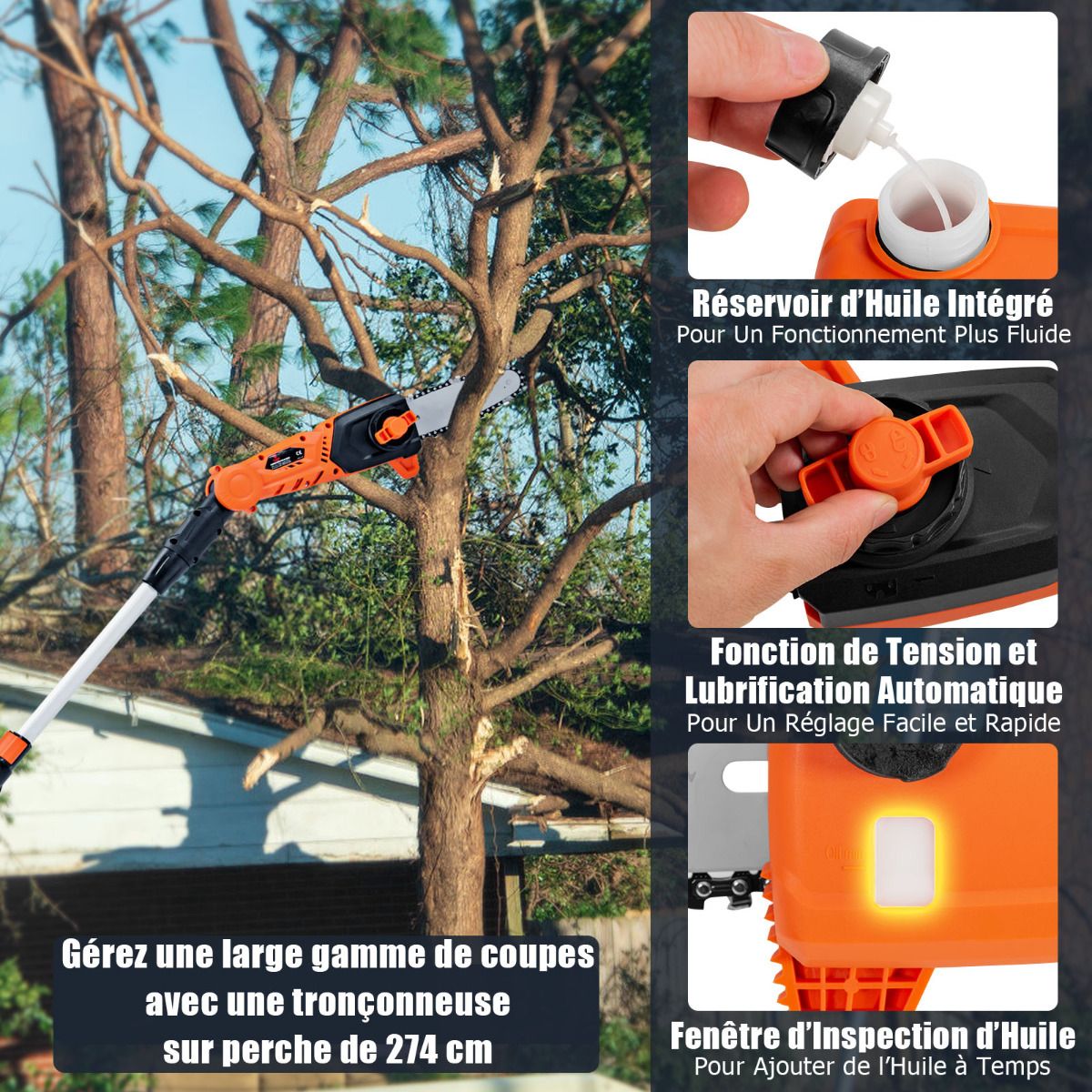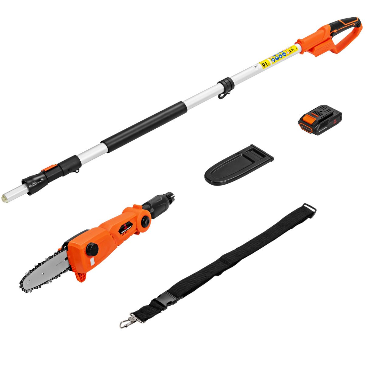 These telescopic chain pruning shears allow you to easily trim hard-to-reach branches. Simply stand firmly on solid ground and adjust the length by rotating the shackle on the telescopic bar, up to a maximum of 274 cm. The 20 cm guide plate can trim branches up to 20 cm in diameter or cut fallen branches up to 35 cm in diameter. The chain operates at a constant speed of 4.5 m/s with a 1 cm pitch. The oil tank has a capacity of 103 ml. A powerful motor drives the multi-angle shear head, easily handling even the thickest branches. Furthermore, the stainless steel chain features an automatic lubrication system, ensuring the guide plate and chain remain adequately lubricated during use, extending its lifespan. Unlike gasoline-powered tools, these telescopic chain pruning shears are battery-powered: you don't need to worry about exhaust fumes, tailpipes, accidental starts, or expensive repairs. It's an ideal tool for lawn care, mowing, gardening, and other projects. Product Features: 274cm Telescopic Pruning ShearsThese pruning shears feature a telescopic design with a locking clip, allowing for quick and easy length adjustment to prune trees of varying heights. Weighing only 3.7 kg, they are ideal for trimming messy branches and other gardening DIY projects. Powerful MotorThese cordless pruning shears are equipped with a high-quality stainless steel chain and a powerful motor, providing a vibration-free cutting speed of 4.5 m/s for easy garden maintenance. A detachable shoulder strap and easy-to-use auxiliary handle further enhance the user experience. Automatic Lubrication and Tension AdjustmentThis high-pole saw features an automatic chain lubrication system for smoother, more precise cuts and extended tool life. A tool-free tension adjustment knob ensures you always have the correct tension for the task at hand. Four Cutting AnglesSimply press the angle adjustment knob to tilt the saw head to four different cutting angles. These pruning shears easily trim bent branches, and locking in the desired position when the knob is released. A safety switch on the handle prevents accidental activation, and a protective cap facilitates storage. [Wireless Operation, Effortless and Worry-Free] This 20V battery-powered pruning shears features a non-slip handle for enhanced user comfort and an anti-rotation bar design for increased stability. The wireless design eliminates the hassle of plugging in and expands the cutting range. It's an ideal tool for lawn care, mowing, gardening, and other projects. Product Features: Barrel length extends from 198cm to 274cm. An automatic lubrication system ensures the chain is always lubricated. A tool-free adjustable tension knob allows for quick and easy adjustment of chain tension between cuts. The included shoulder strap reduces fatigue during use. The 20V rechargeable battery provides ample power for extended use. A built-in safety switch prevents accidental activation and avoids danger. The wraparound handle makes vertical and horizontal operation easier. This tool is suitable for lawn care, mowing, gardening, and other projects. Specifications: Color: Orange + Black; Material: Stainless Steel, ABS, Nylon; Motor: Brushed Motor; Chain Speed: 4.5 m/s; Cutting Diameter: 20 cm; Guide Plate Length: 20 cm; Chain Pitch: 1 cm; Chain Gauge: 1.3 mm; Dimensions: 13 cm x 13.5 cm x 198 cm - 274 cm; Oil Tank Capacity: 103 ml; Net Weight (including battery): 3.7 kg; Lubrication System/Chain Tension: Automatic; Input Power: 220-240 V (AC); Output Voltage: 20 V (DC); Battery Nominal Voltage: 20 V; Battery Capacity: 2.0 Ah; Charging Time: Approx. 3-5 hours; Delivery Includes: 1 x Cordless Pruning Shears, 1 x 20 V Lithium-ion Battery, 1 x Battery Charger, 1 x Blade Case, 1 x Instruction Manual