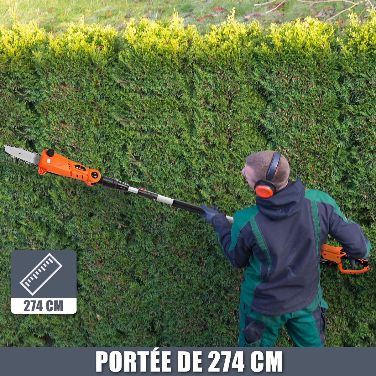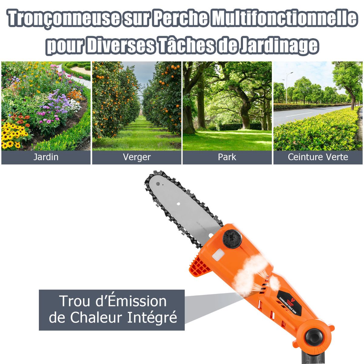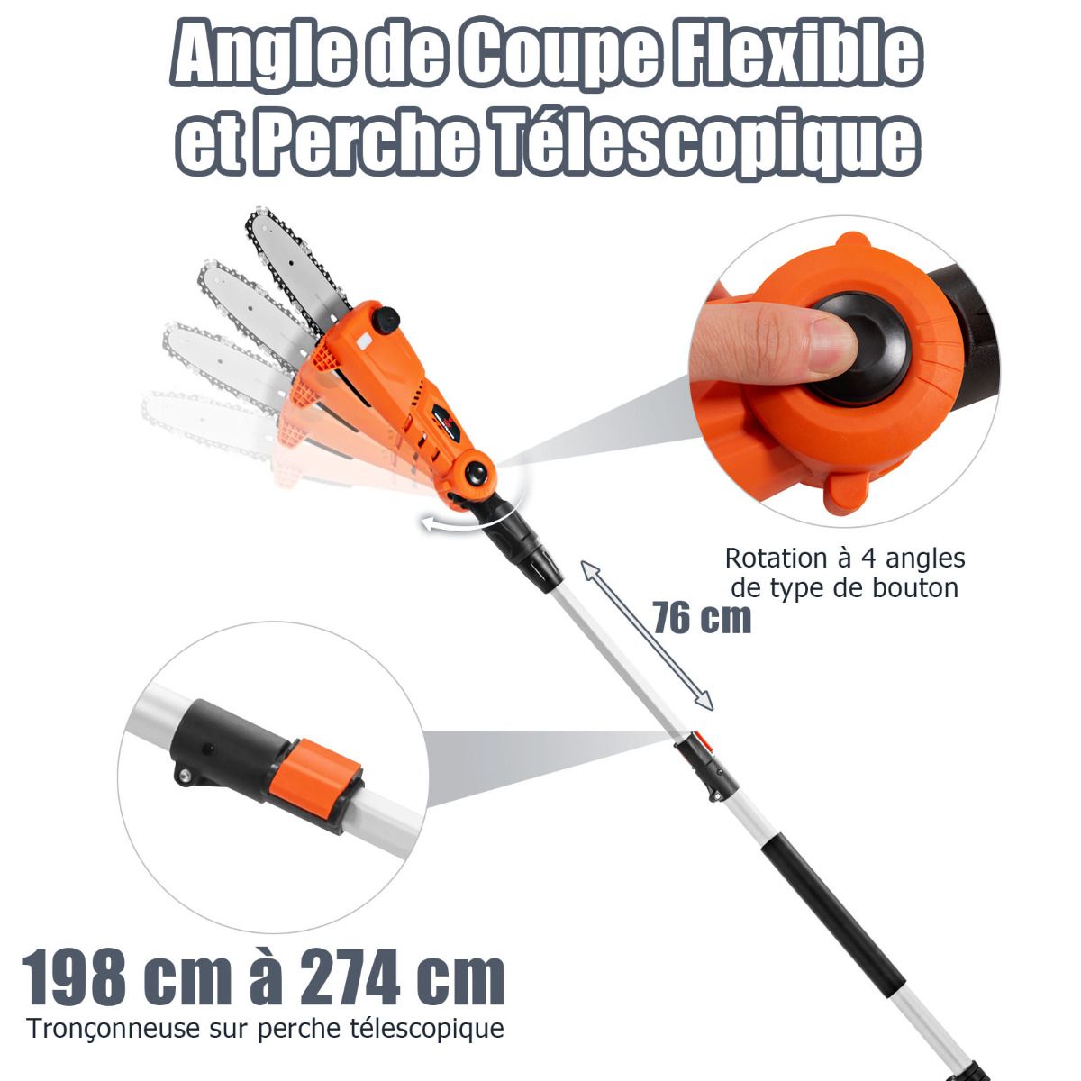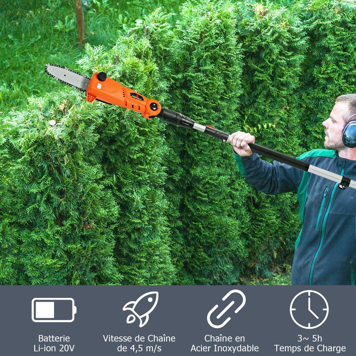 These telescopic chain pruning shears allow you to easily trim hard-to-reach branches. Simply stand firmly on solid ground and adjust the length by rotating the shackle on the telescopic bar, up to a maximum of 274 cm. The 20 cm guide plate can trim branches up to 20 cm in diameter or cut fallen branches up to 35 cm in diameter. The chain operates at a constant speed of 4.5 m/s with a 1 cm pitch. The oil tank has a capacity of 103 ml. A powerful motor drives the multi-angle shear head, easily handling even the thickest branches. Furthermore, the stainless steel chain features an automatic lubrication system, ensuring the guide plate and chain remain adequately lubricated during use, extending its lifespan. Unlike gasoline-powered tools, these telescopic chain pruning shears are battery-powered: you don't need to worry about exhaust fumes, tailpipes, accidental starts, or expensive repairs. It's an ideal tool for lawn care, mowing, gardening, and other projects. Product Features: 274cm Telescopic Pruning ShearsThese pruning shears feature a telescopic design with a locking clip, allowing for quick and easy length adjustment to prune trees of varying heights. Weighing only 3.7 kg, they are ideal for trimming messy branches and other gardening DIY projects. Powerful MotorThese cordless pruning shears are equipped with a high-quality stainless steel chain and a powerful motor, providing a vibration-free cutting speed of 4.5 m/s for easy garden maintenance. A detachable shoulder strap and easy-to-use auxiliary handle further enhance the user experience. Automatic Lubrication and Tension AdjustmentThis high-pole saw features an automatic chain lubrication system for smoother, more precise cuts and extended tool life. A tool-free tension adjustment knob ensures you always have the correct tension for the task at hand. Four Cutting AnglesSimply press the angle adjustment knob to tilt the saw head to four different cutting angles. These pruning shears easily trim bent branches, and locking in the desired position when the knob is released. A safety switch on the handle prevents accidental activation, and a protective cap facilitates storage. [Wireless Operation, Effortless and Worry-Free] This 20V battery-powered pruning shears features a non-slip handle for enhanced user comfort and an anti-rotation bar design for increased stability. The wireless design eliminates the hassle of plugging in and expands the cutting range. It's an ideal tool for lawn care, mowing, gardening, and other projects. Product Features: Barrel length extends from 198cm to 274cm. An automatic lubrication system ensures the chain is always lubricated. A tool-free adjustable tension knob allows for quick and easy adjustment of chain tension between cuts. The included shoulder strap reduces fatigue during use. The 20V rechargeable battery provides ample power for extended use. A built-in safety switch prevents accidental activation and avoids danger. The wraparound handle makes vertical and horizontal operation easier. This tool is suitable for lawn care, mowing, gardening, and other projects. Specifications: Color: Orange + Black; Material: Stainless Steel, ABS, Nylon; Motor: Brushed Motor; Chain Speed: 4.5 m/s; Cutting Diameter: 20 cm; Guide Plate Length: 20 cm; Chain Pitch: 1 cm; Chain Gauge: 1.3 mm; Dimensions: 13 cm x 13.5 cm x 198 cm - 274 cm; Oil Tank Capacity: 103 ml; Net Weight (including battery): 3.7 kg; Lubrication System/Chain Tension: Automatic; Input Power: 220-240 V (AC); Output Voltage: 20 V (DC); Battery Nominal Voltage: 20 V; Battery Capacity: 2.0 Ah; Charging Time: Approx. 3-5 hours; Delivery Includes: 1 x Cordless Pruning Shears, 1 x 20 V Lithium-ion Battery, 1 x Battery Charger, 1 x Blade Case, 1 x Instruction Manual