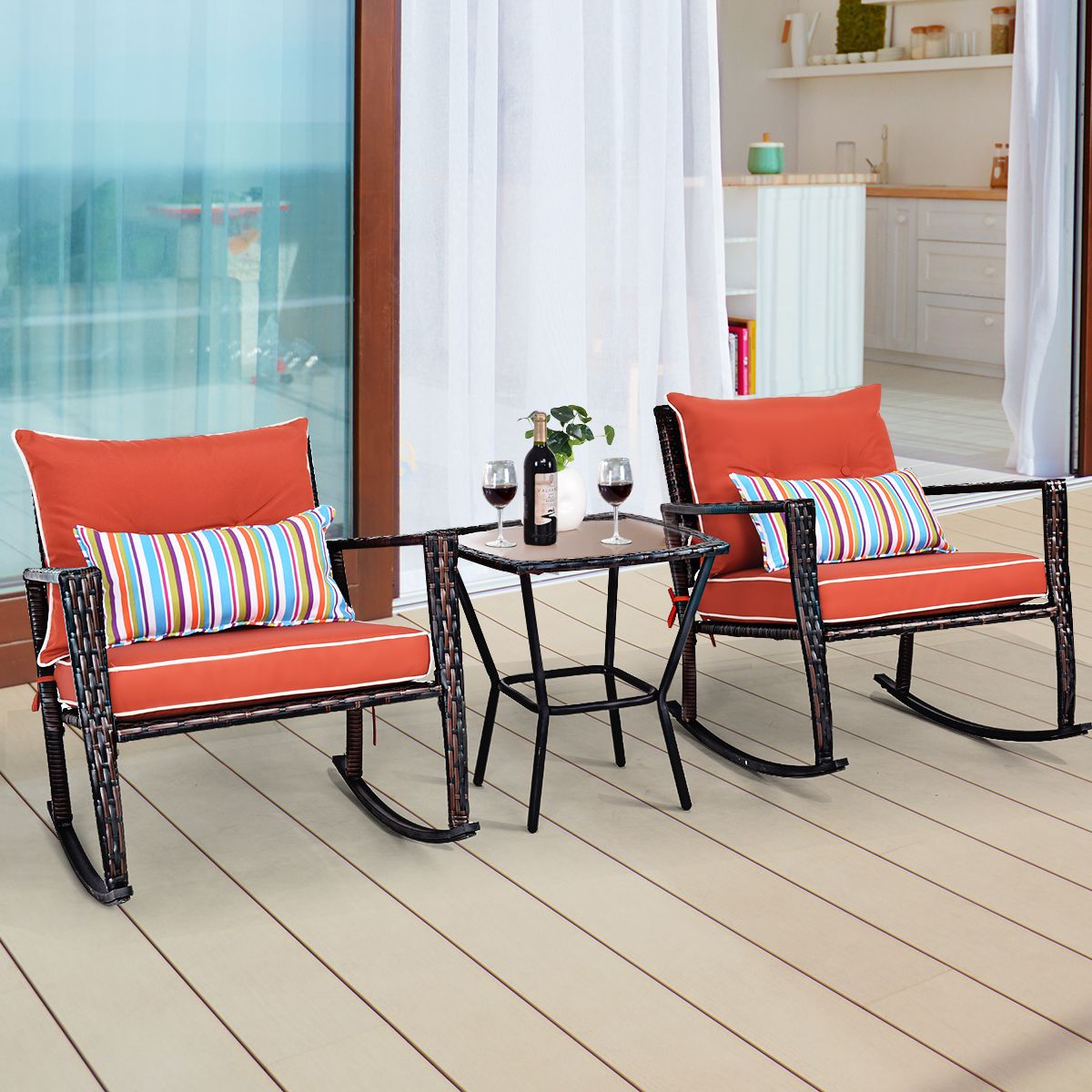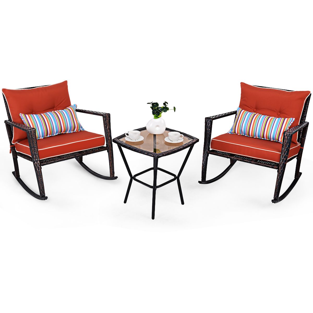 Garden Set with 2 Rocking Chairs and 1 Tempered Glass Coffee Table, All Cushions Included in PE Rattan -
