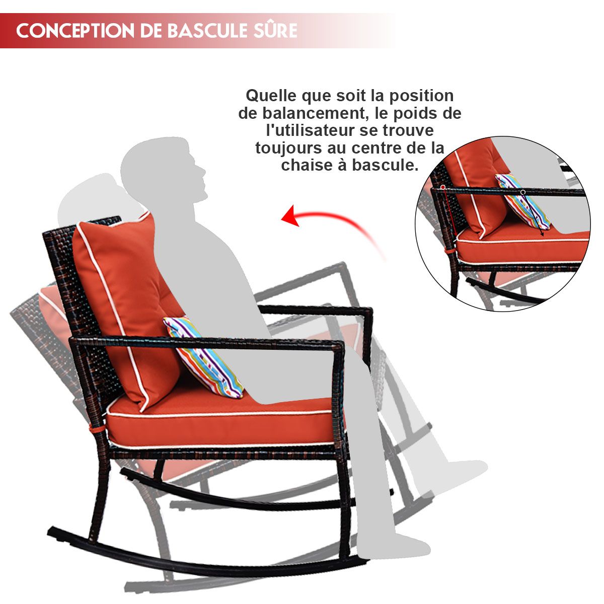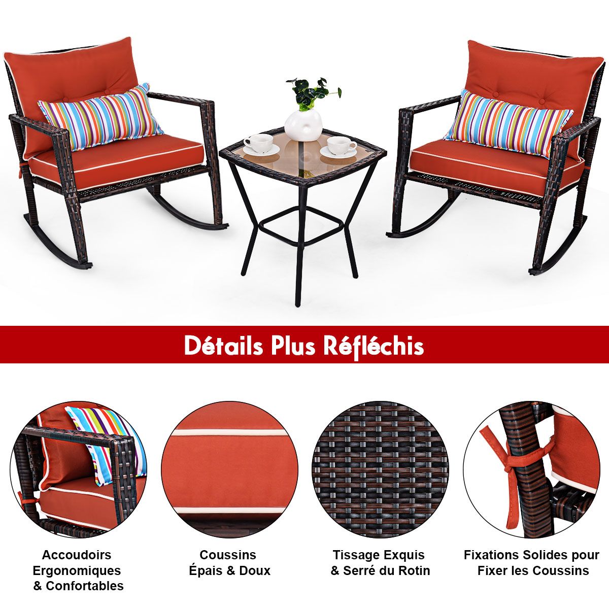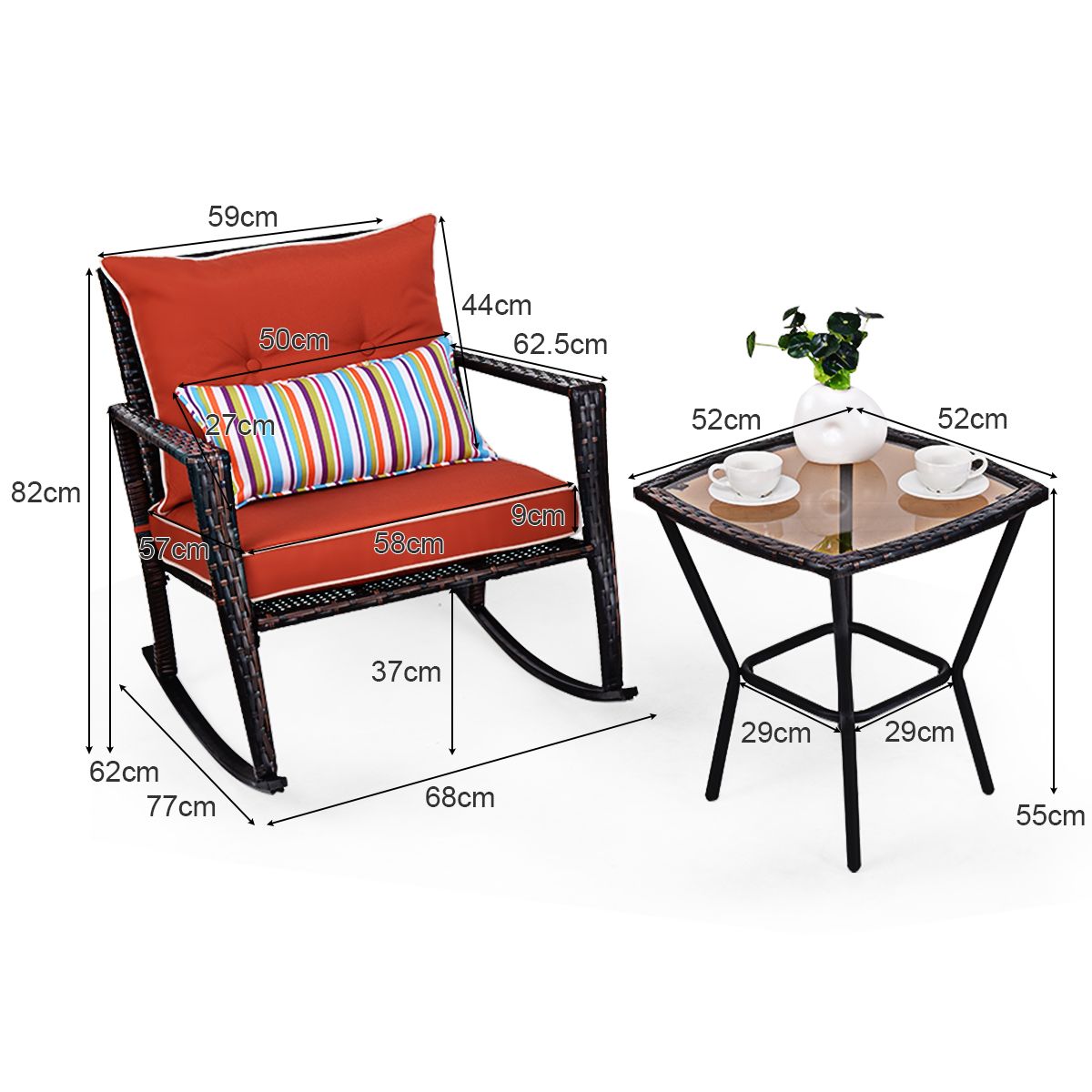 Enjoy a drink with friends and relax in this rattan chair set. A three-piece patio rocking chair set. This set of three rattan chairs is an excellent choice for outdoor relaxation, durable and crack-resistant, suitable for various locations such as patios, gardens, patios, and poolside. This three-piece dining table and chair set is made of high-quality PE plastic with a rattan-like appearance and a steel frame to ensure the seats are sturdy and durable for long-term use. The furniture set also includes a glass side table for convenient placement of food, drinks, and decorative items. Furthermore, these ergonomically designed rocking chairs feature thick foam cushions and backrests for comfortable seating and relaxation. The chair covers are removable for easy cleaning and replacement. The rustic appearance adds a touch of elegance, adding a unique charm to your living space. Features: This three-piece rustic outdoor relaxation set features soft and comfortable cushions, adding country charm to any living space. Paired with a tempered glass coffee table, it adds a touch of casual style. This outdoor relaxation set is ideal for creating a comfortable and relaxing space, perfect for chatting with family and friends, and especially suitable for balconies, poolside, backyards, and patios. Premium materials and a sturdy frame: Made from high-quality hand-woven faux rattan PE plastic, it adds an elegant touch to your space. This durable dining chair set is sturdy and durable enough to withstand various weather conditions and is resistant to fading. Furthermore, the robust steel frame and non-slip footpads ensure the seats are stable and won't wobble. A comfortable rocking chair with a soft cushion: The rocking chair provides ideal balance and a smooth sway, allowing you to relax and drift off to sleep. There's no risk of falling, allowing you to rock back and forth easily. The 8cm thick foam-filled cushion provides extra comfort, allowing you to enjoy naps, reading, or knitting during your outdoor leisure time. Ergonomic design and lumbar support cushion: These rattan rocking chairs feature an ergonomic backrest design that conforms to your body's curves, relieving fatigue. The widened seat and armrests allow you to relax comfortably for hours. In addition, two extra pillows provide protective support, making the chair even more comfortable. Easy to Assemble and Maintain: This three-piece dining table and chair set is easy to assemble in your outdoor living space. The set includes two rocking chairs, one coffee table, four seat cushions, and two throw pillows. The single chair measures 68 x 77 x 82 cm (L x W x H) and has a weight capacity of 90 kg. The coffee table measures 52 x 52 x 55 cm (L x W x H) and has a weight capacity of 15 kg. Additionally, the removable fabric covers on the seat cushions are waterproof and easy to clean. Benefits: Made of high-quality rattan-textured PE plastic, it is weather-resistant and does not easily fade or deform. The sturdy steel frame structure ensures stability, and the non-slip foot pads reduce scratches on the floor. The glass tabletop and removable seat cushion covers make cleaning easy. The thick, soft seat cushions and throw pillows provide exceptional comfort. The rocking chair function allows you to relax comfortably. The backrest and seat perfectly conform to the curves of the human body, effectively reducing pressure. The glass coffee table can be used to store drinks, wine, snacks, or display decorative items. The side armrests provide excellent support for your arms, ensuring comfort. The simple lines and rustic look add a touch of style to your home. Ideal for outdoor use, such as balconies, gardens, patios, porches, and patios. All necessary tools and detailed instructions are included for easy assembly. Specifications: Color: Red; Material: PE plastic + sponge + steel + glass; Chair dimensions: 68 x 77 x 82 cm (L x W x H); Table dimensions: 52 x 52 x 55 cm (L x W x H); Single chair load capacity: 90 kg; Table load capacity: 15 kg; Package includes: 2 rocking chairs, 1 coffee table, 4 cushions, 2 pillows, and 1 assembly instruction booklet.