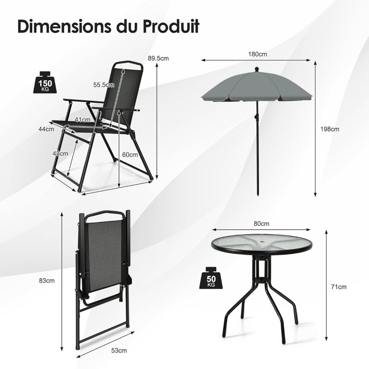 This six-piece outdoor table and chair set will bring you the most comfortable and convenient dining experience! The folding outdoor chairs feature high backs and ergonomic armrests for optimal comfort. The tempered glass tabletop is easy to clean. The large parasol, made of waterproof fabric, features a 45Spend tilt design to provide shade for your outdoor dining. Furthermore, the smooth surface and rounded corners help prevent injuries during use. This six-piece outdoor table and chair set (including parasol) will help you unwind after a long day. Product Features: Four Folding Chair Set This lightweight outdoor chair set allows you to arrange it however you like. The folding design also makes it easy to store, saving space. Our chairs are made of high-quality powder-coated steel and breathable fabric, making them weather-resistant, rust-proof, and durable. Stylish Coffee Table This practical outdoor table features a tempered glass tabletop with a water ripple design, combining functionality and elegance, and providing ample space for your drinks and snacks. The 4cm diameter umbrella opening is compatible with most parasols on the market. Practical Patio Sunshade This 180cm patio sunshade provides ample shade for your family and friends, allowing you to fully enjoy your outdoor leisure time. It can be easily disassembled when not in use. The 45Spend angled umbrella shaft effectively blocks sunlight from all angles. Suitable for Multiple Locations This patio furniture set is ideal for chatting or dining with family and friends, perfect for outdoor leisure areas such as gardens, porches, poolside, or backyards. This all-in-one table and chair set helps you unwind after a long day! Set Includes This six-piece patio furniture set includes a round coffee table, a sunshade, and four folding chairs to meet your daily needs. Easy assembly with clear instructions. Please note that the sunshade requires a counterweight base (not included) for stability. Features: Durable tempered glass tabletop with a water ripple design, stylish and practical. Detachable angled sunshade provides shade on sunny days. 4 folding chairs for easy storage and transport. Ergonomic design and breathable fabric for superior comfort. Sturdy steel frame, rust-resistant surface, suitable for outdoor use. Ideal for patios, gardens, poolsides, terraces, and other similar locations. A large patio sunshade effectively blocks direct sunlight. Clear assembly instructions for quick and easy setup. Smooth surface for easy cleaning. H4 Specifications H4 Color: Gray + Black Material: Steel, Fabric, Tempered Glass Umbrella Dimensions: 180 x 198 cm (Diameter x Height) Table Dimensions: 80 x 71 cm (Width x Height) Chair Dimensions When Unfolded: 53 x 62 x 89.5 cm (Length x Width x Height) Chair Dimensions When Folded: 53 x 10 x 83 cm (Length x Width x Height) Seat Height from Ground: 43 cm Total Net Weight: 24 kg Weight Capacity per Chair: 150 kg Weight Capacity per Table: 50 kg Package Includes: 1 x Umbrella 1 x Table 4 x Chairs 1 x Assembly Instructions