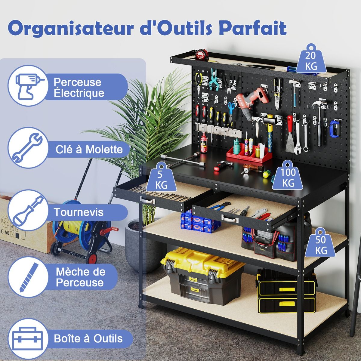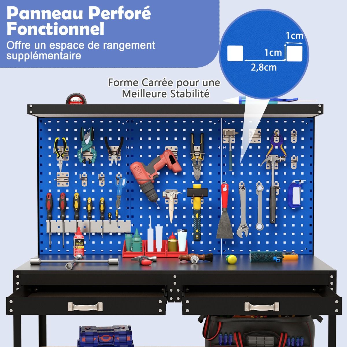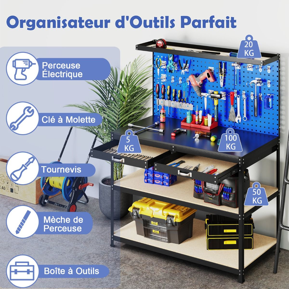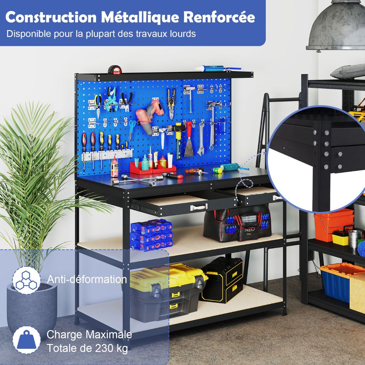 This rugged and durable multi-functional workbench measures 121 x 61 cm and offers a variety of storage options, including a top shelf, three pegboards, a desktop, two large drawers, and a double shelf. Constructed from wrought-earth metal, it can withstand the weight required for most tasks. Square holes on the pegboard enhance tool stability, and it comes with 24 different hanging accessories for optimal organization. This workbench is suitable for both professional and home environments, designed to meet a variety of needs. Features: Rugged and durable heavy-duty workbench. This 121 x 61 cm workbench features a reinforced metal structure with a total load capacity of 230 kg, effectively handling most heavy-duty tasks and ensuring stability and durability in any harsh workshop environment. Perfect tool storage solution. This workbench, equipped with a top shelf, three pegboards, a spacious desktop, two large drawers, and a double shelf, keeps your workspace organized and efficient. All your tools, such as drills, drill bits, and toolboxes, will be neatly organized, making every task easier, more convenient, and saving time. [Anti-slip pads enhance stability] Each leg is equipped with an anti-slip pad, making the workbench more stable. Additionally, the anti-slip pads protect the floor from scratches. [Base with 24 accessories] This workbench comes with 3 fully functional pegboards, providing extra storage space. The neatly arranged hanging holes on the pegboards feature a precise square design, enhancing stability. It also includes a screwdriver holder and 23 hooks of different shapes (single hook, double hook, square, round) and tilt angles (90Spend, 45Spend, right angle). [Versatile] This well-designed workbench is suitable not only for professional workshops but also for home and garage use. Whether you are doing handicrafts, repairs, or DIY projects, this workbench can meet your various needs and improve your work efficiency. Robust and durable, fully functional: A sturdy metal frame with a maximum load capacity of 230 kg. Equipped with a top shelf, 3 pegboards, a desktop, 2 drawers, and a double shelf. The 3 pegboards provide additional storage space. Square hanging holes can support heavier items. Includes a screwdriver holder and 23 hooks of different shapes. Drawers slide smoothly, and convenient drawer handles make opening and closing easy. Anti-slip mats protect floors from scratches. Suitable for homes, garages, studios, and other locations. Specifications: Color: Black/Navy Blue. Material: Metal, MDF. Overall Dimensions: 121 x 61 x 156 cm (L x W x H). Drawer Internal Dimensions: 58 x 50 x 5 cm (L x W x H). Desktop Height: 91 cm. Desktop Load Capacity: 100 kg. Drawer Load Capacity: 5 kg. Top Shelf Load Capacity: 20 kg. Bottom shelf load-bearing capacity: Base load-bearing capacity: 50 kg; Net weight: 46 kg; Package list: 1 workbench with hanging board; 4 x 90Spend double hooks; 4 x 45Spend double hooks; 4 x 90Spend single hooks; 4 x 45Spend single hooks; 3 x straight single hooks; 1 x straight double hook; 2 x square hooks; 1 x round hook; 1 x screwdriver holder; 1 x instruction manual