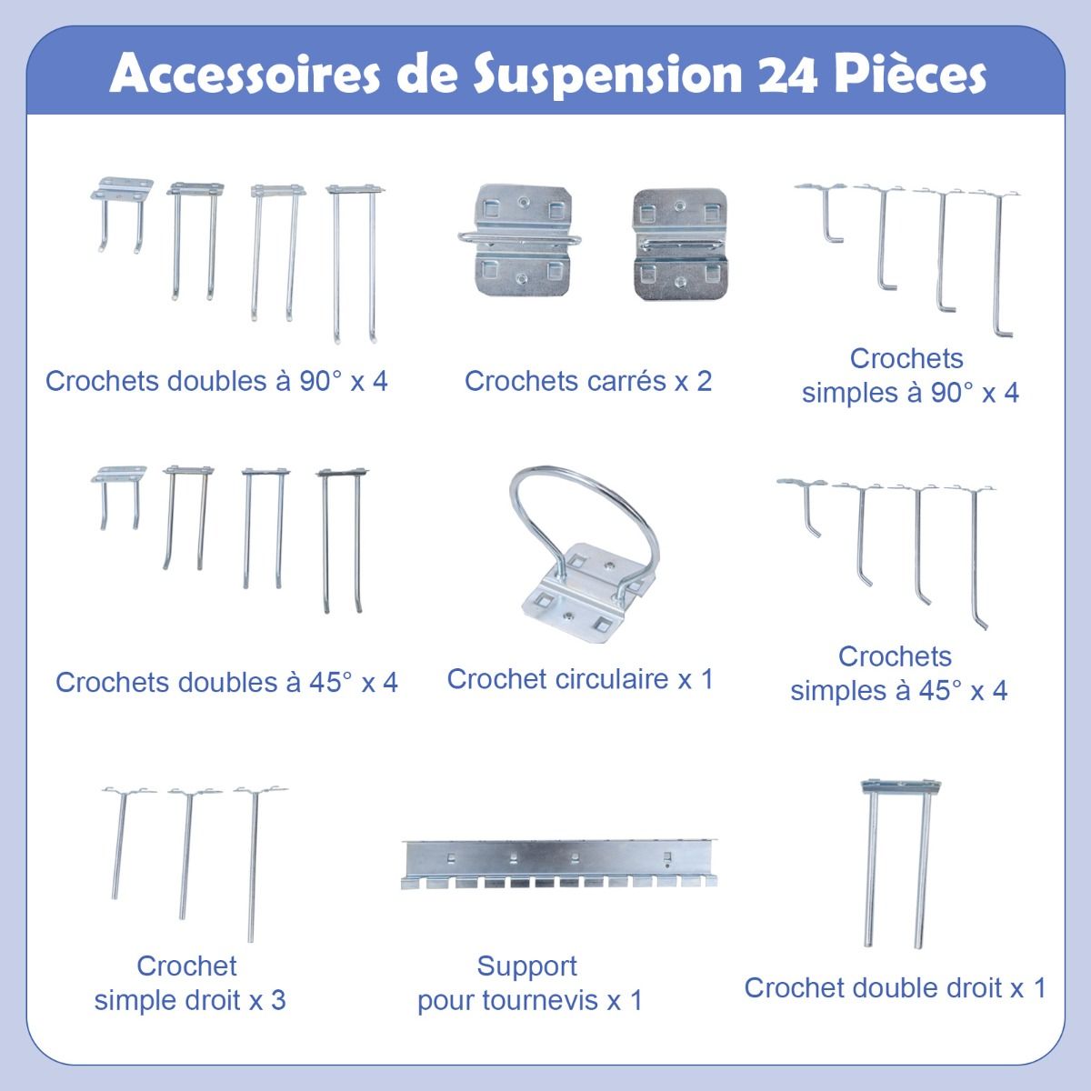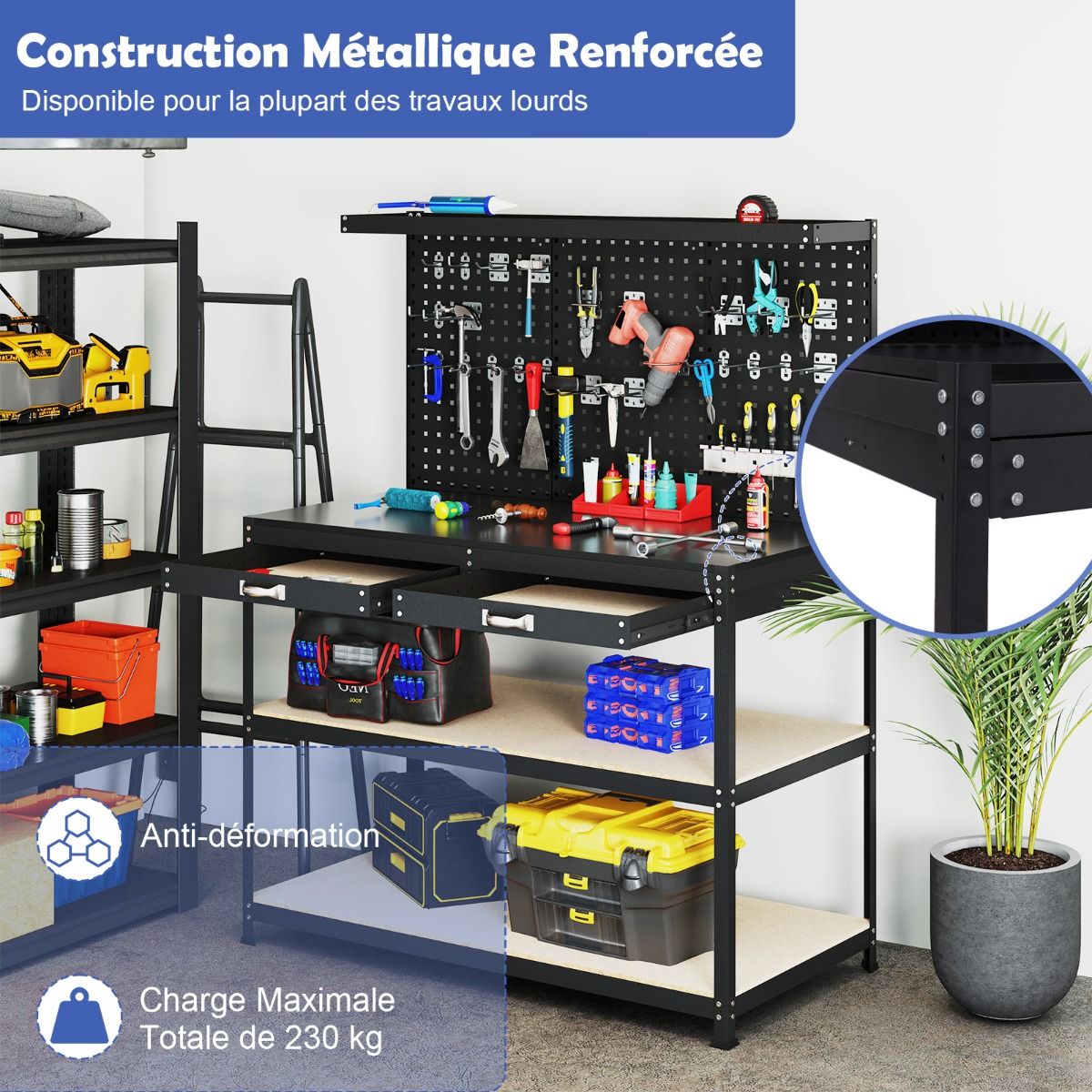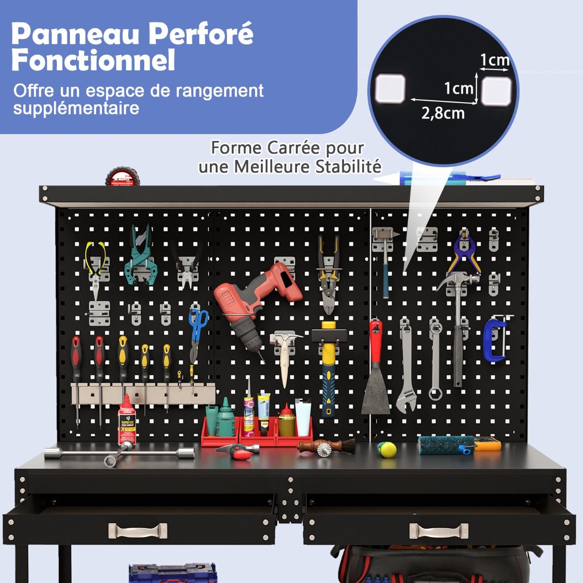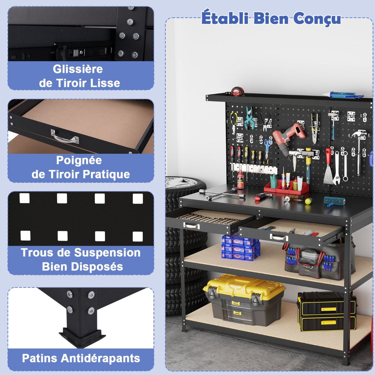This rugged and durable multi-functional workbench measures 121 x 61 cm and offers a variety of storage options, including a top shelf, three pegboards, a desktop, two large drawers, and a double shelf. Constructed from wrought-earth metal, it can withstand the weight required for most tasks. Square holes on the pegboard enhance tool stability, and it comes with 24 different hanging accessories for optimal organization. This workbench is suitable for both professional and home environments, designed to meet a variety of needs. Features: Rugged and durable heavy-duty workbench. This 121 x 61 cm workbench features a reinforced metal structure with a total load capacity of 230 kg, effectively handling most heavy-duty tasks and ensuring stability and durability in any harsh workshop environment. Perfect tool storage solution. This workbench, equipped with a top shelf, three pegboards, a spacious desktop, two large drawers, and a double shelf, keeps your workspace organized and efficient. All your tools, such as drills, drill bits, and toolboxes, will be neatly organized, making every task easier, more convenient, and saving time. [Anti-slip pads enhance stability] Each leg is equipped with an anti-slip pad, making the workbench more stable. Additionally, the anti-slip pads protect the floor from scratches. [Base with 24 accessories] This workbench comes with 3 fully functional pegboards, providing extra storage space. The neatly arranged hanging holes on the pegboards feature a precise square design, enhancing stability. It also includes a screwdriver holder and 23 hooks of different shapes (single hook, double hook, square, round) and tilt angles (90Spend, 45Spend, right angle). [Versatile] This well-designed workbench is suitable not only for professional workshops but also for home and garage use. Whether you are doing handicrafts, repairs, or DIY projects, this workbench can meet your various needs and improve your work efficiency. Robust and durable, fully functional: A sturdy metal frame with a maximum load capacity of 230 kg. Equipped with a top shelf, 3 pegboards, a desktop, 2 drawers, and a double shelf. The 3 pegboards provide additional storage space. Square hanging holes can support heavier items. Includes a screwdriver holder and 23 hooks of different shapes. Drawers slide smoothly, and convenient drawer handles make opening and closing easy. Anti-slip mats protect floors from scratches. Suitable for homes, garages, studios, and other locations. Specifications: Color: Black/Navy Blue. Material: Metal, MDF. Overall Dimensions: 121 x 61 x 156 cm (L x W x H). Drawer Internal Dimensions: 58 x 50 x 5 cm (L x W x H). Desktop Height: 91 cm. Desktop Load Capacity: 100 kg. Drawer Load Capacity: 5 kg. Top Shelf Load Capacity: 20 kg. Bottom shelf load-bearing capacity: Base load-bearing capacity: 50 kg; Net weight: 46 kg; Package list: 1 workbench with hanging board; 4 x 90Spend double hooks; 4 x 45Spend double hooks; 4 x 90Spend single hooks; 4 x 45Spend single hooks; 3 x straight single hooks; 1 x straight double hook; 2 x square hooks; 1 x round hook; 1 x screwdriver holder; 1 x instruction manual