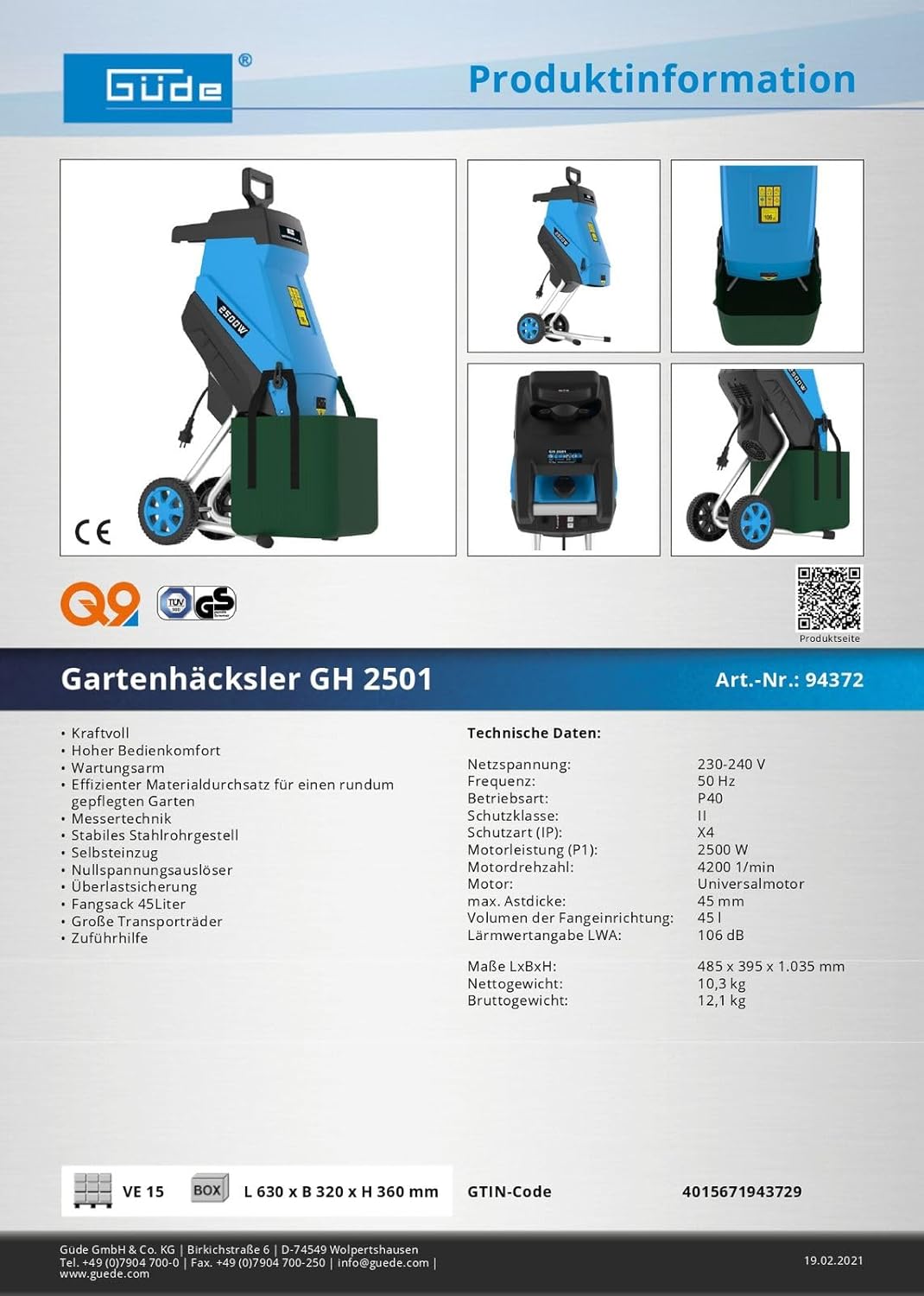 G ude 94372 GH 2501 Garden Chopper with Automatic Suspension Arm, 45 L, Blue