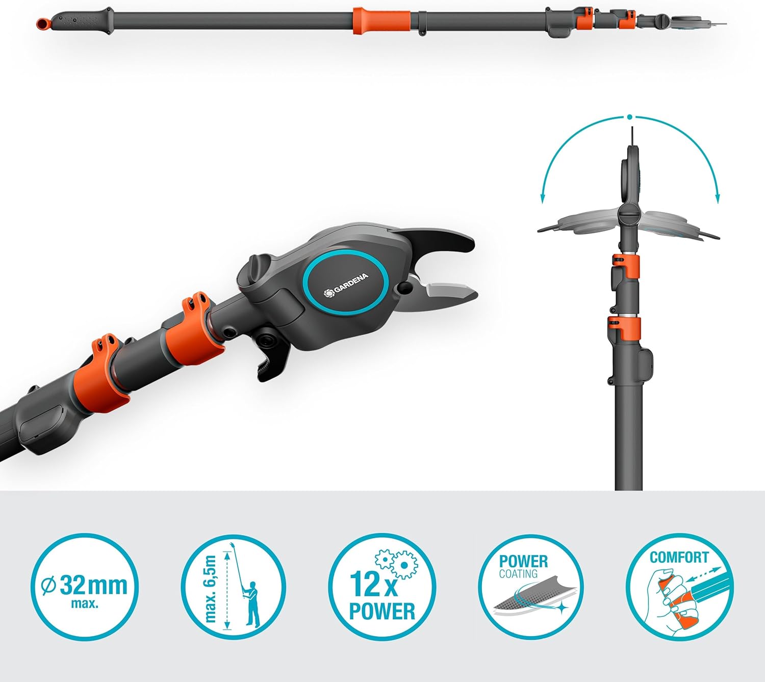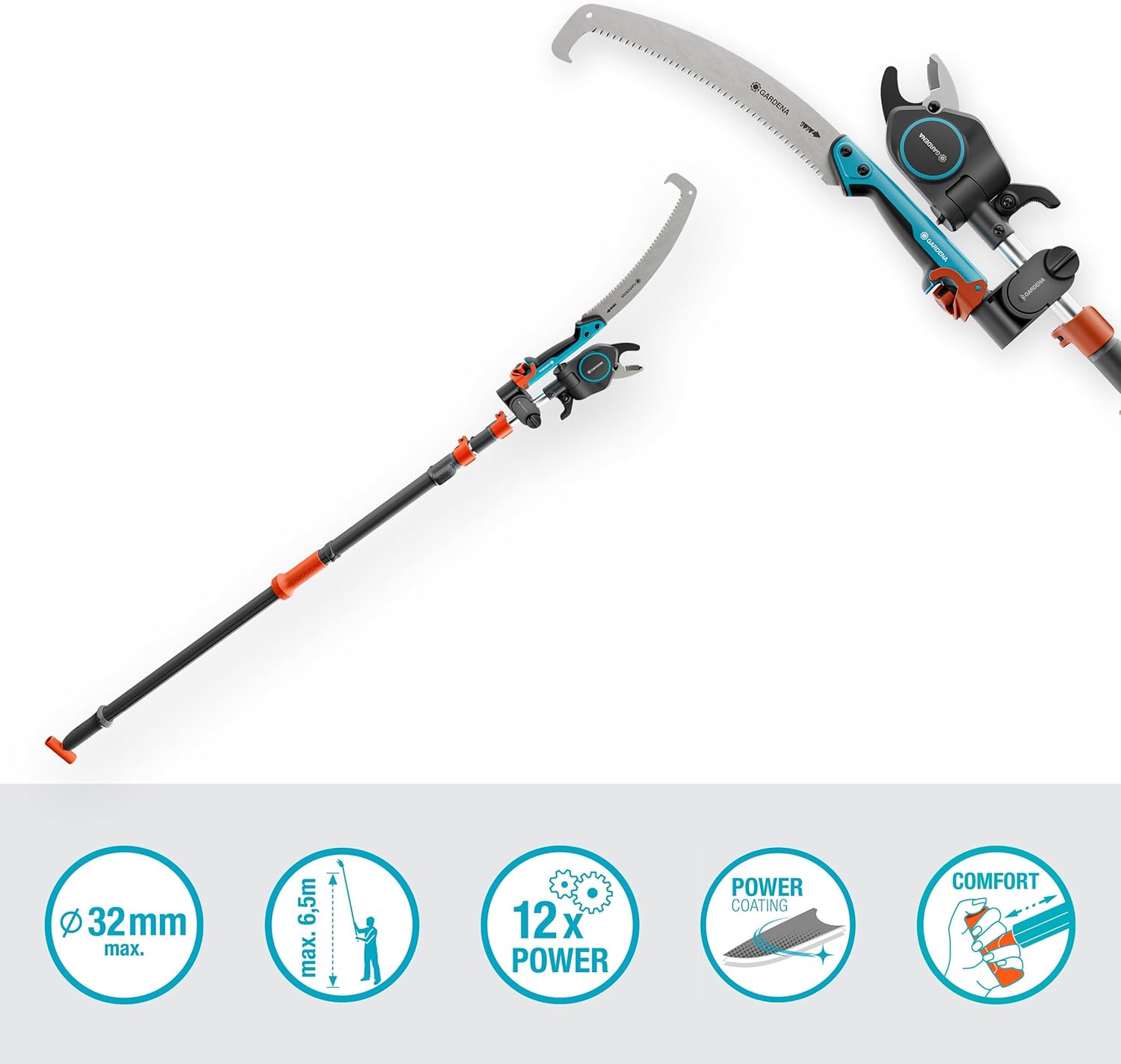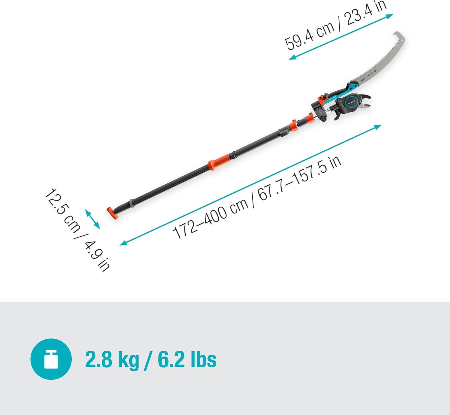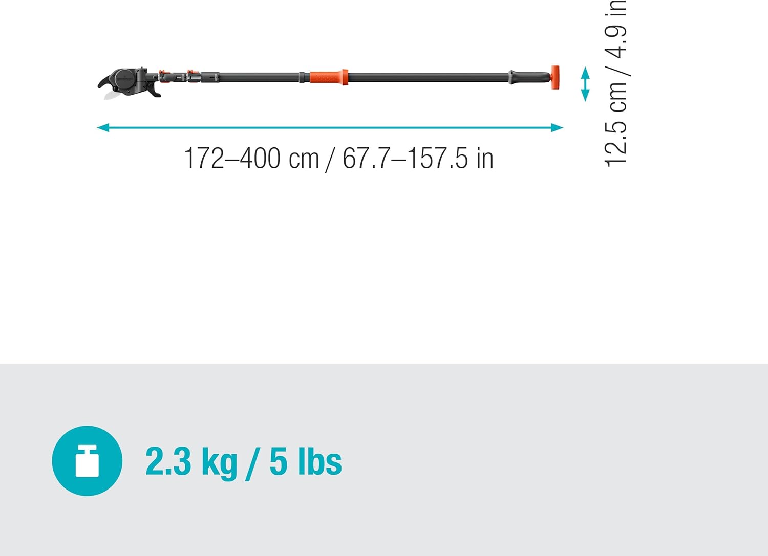 About this product: Easily adjusts from 175 cm to 400 cm, with an angled head for comfortable cutting at various heights and angles. High-quality steel blades supported by metal gears offer up to 12 times more cutting power. Sharpened blades with PowerCoating for clean, precise cuts. Durable, high-quality tool made in Germany. Includes: 1 x GARDENA StarCut Pro L saw, 1 x StarCut saw, 1 x adapter. With the StarCut Pro S, no branch is out of reach. Its 160 cm length offers a total reach of up to 3.5 m, depending on the user's height. Thanks to its maximum cutting diameter of 32 mm, it can easily cut even thick branches. StarCut Pro L - 2x more telescopic. The StarCut Pro L allows you to reach all branches, even the highest ones. Its adjustable length from 175 cm to 400 cm offers a total reach of 6.5 m. The compact cutting head and internal traction strip prevent tangling, ensuring simple and efficient cutting. Reach new heights: StarCut Pro L and saw. Ideal for working efficiently, even on the tallest trees. The included saw attaches easily thanks to a robust adapter. The combisystem solution ensures a stable connection and optimal precision when making cuts at height.