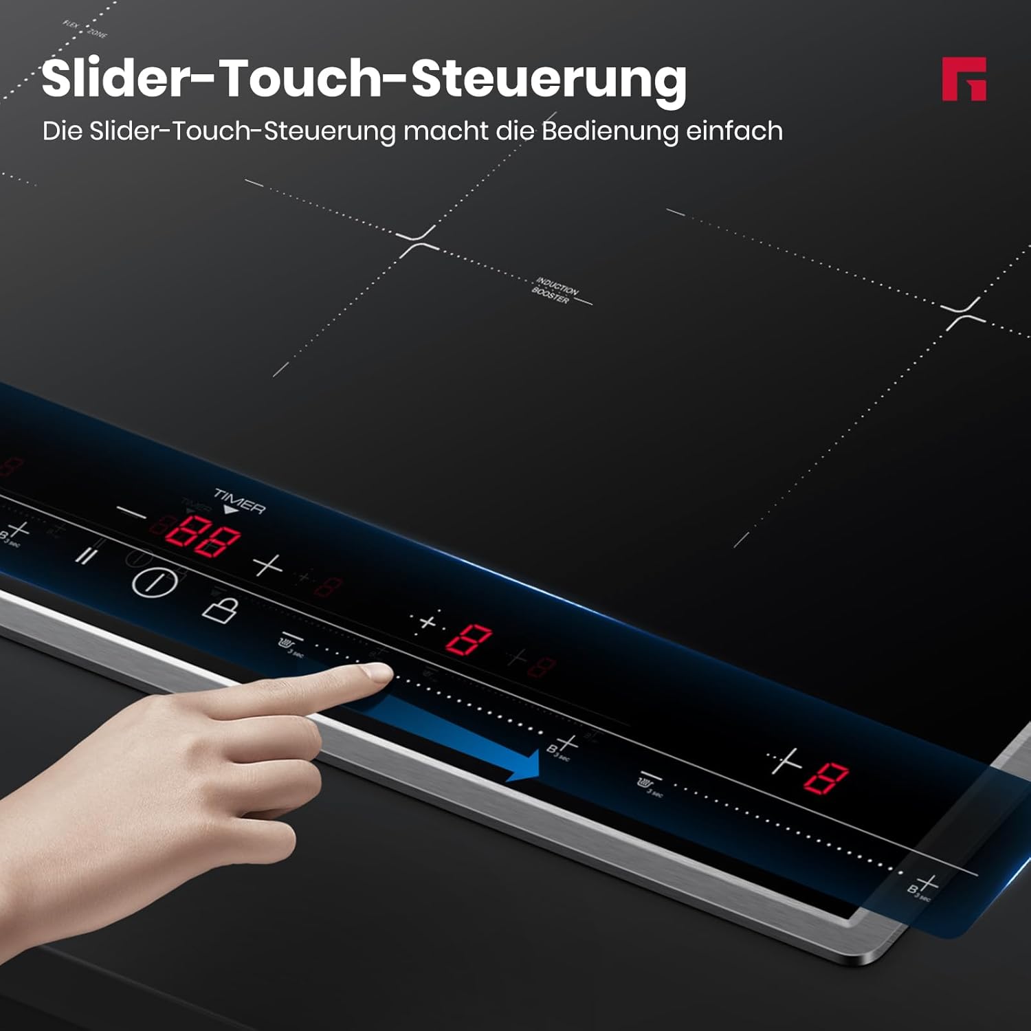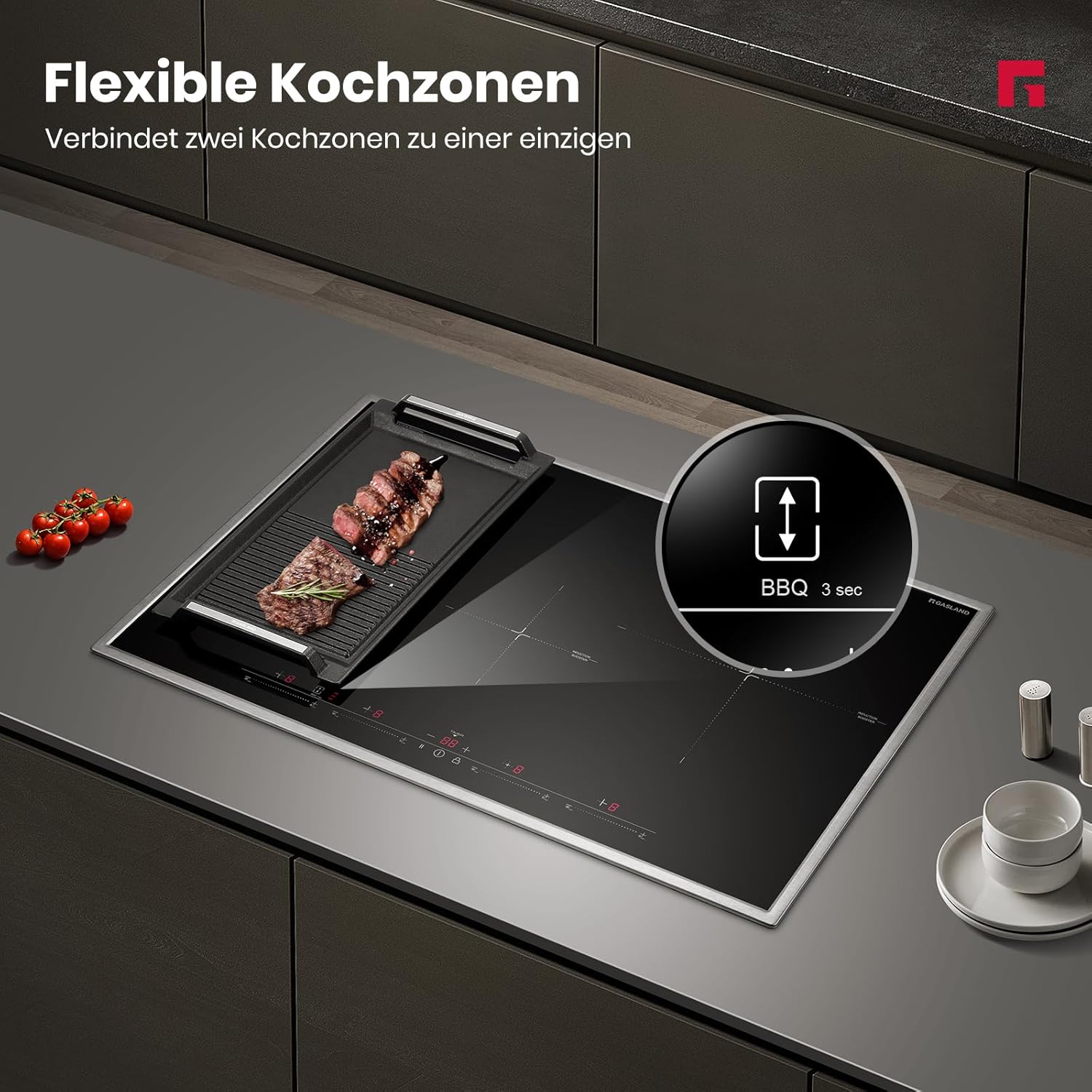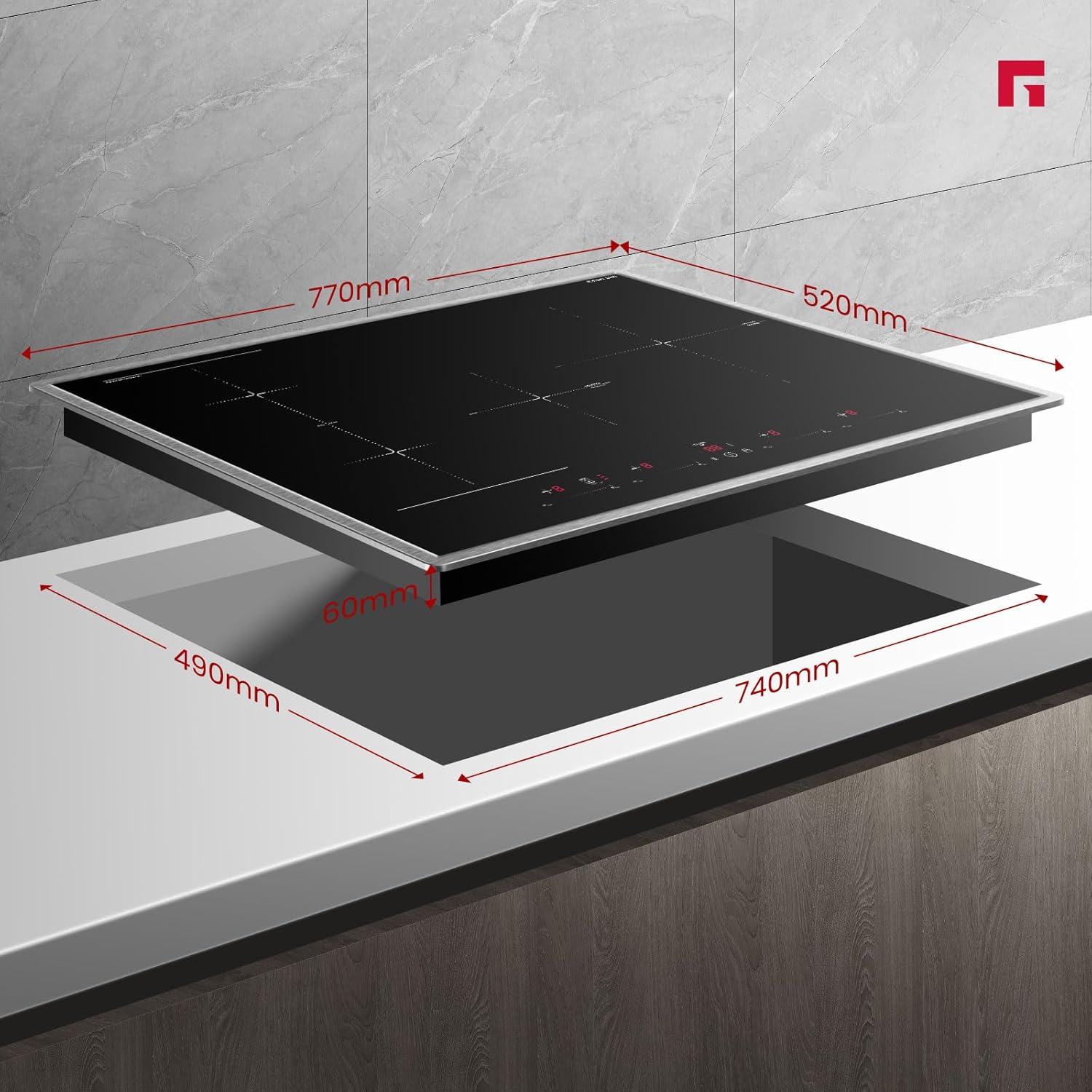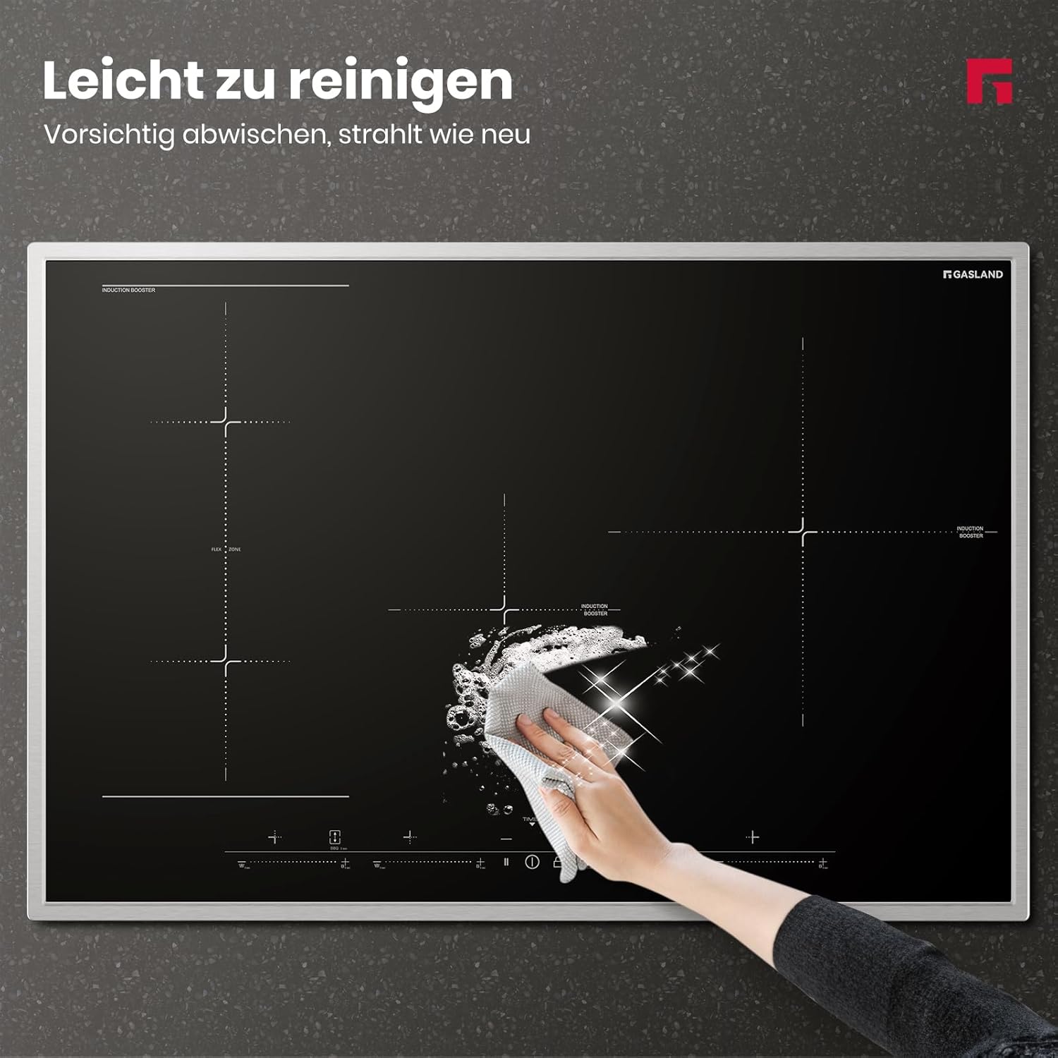 High-performance induction cooker 7000W total power, 9 power levels, sliding design. A minimum 50mm ventilation gap must be allowed. Adequate ventilation extends product lifespan. Dual voltage compatibility Can be connected to single-phase 220-240V and two-phase 380-415V (2N~) power supplies, offering flexible installation. More flexible cooking options Two vertically connected cooking zones are combined into one large rectangular cooking area. You can freely place pots and pans, making efficient use of cooking space, ideal for cooking large stews, grilled steaks, or even paella. Powerful heating function Simply press the powerful heating button for rapid heating, no long waits required. Even with a large pot of boiling water, the powerful heating function instantly boosts the heat, saving you time. Stainless steel frame The stainless steel frame typically offers excellent structural stability, providing a solid support for the induction cooker. Stainless steel is a very strong and durable material, capable of withstanding daily use and cleaning without rusting or corroding. Multiple safety features child lock, overheat protection, residual heat warning, and many others ensure cooking safety, making this cooktop an ideal choice for families. GASLAND focuses on creating cookware that fosters a simple, comfortable, warm, and joyful home atmosphere. We hope to bring this atmosphere into families, cooking and baking desserts together, and enjoying the pleasure of cooking. Compatible with our induction cooktop frying pan. (Product No.: IHGD-S23C) GASLAND 77cm Induction Cooktop: Cooking is easier, life is better. Instant control. Quick temperature switching.