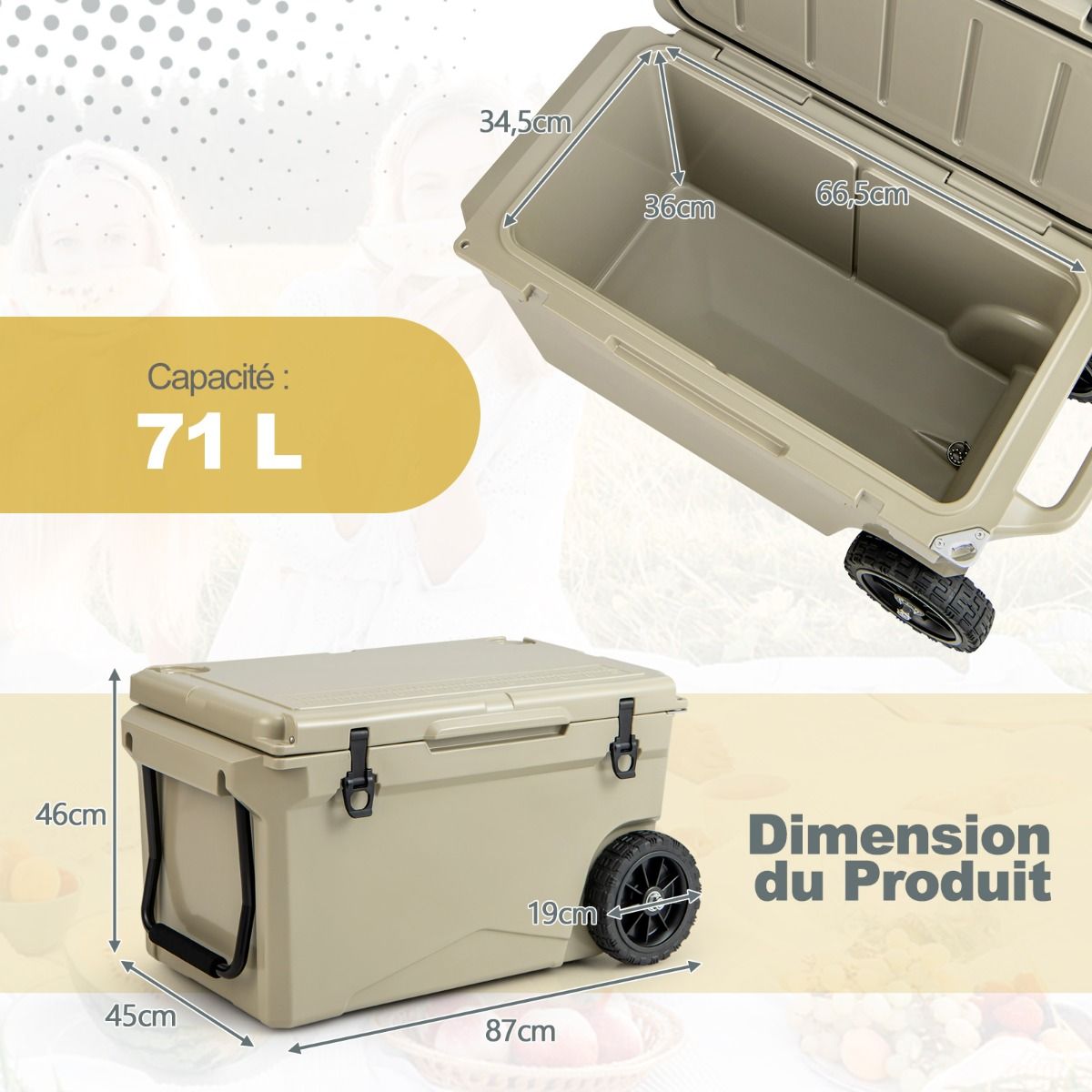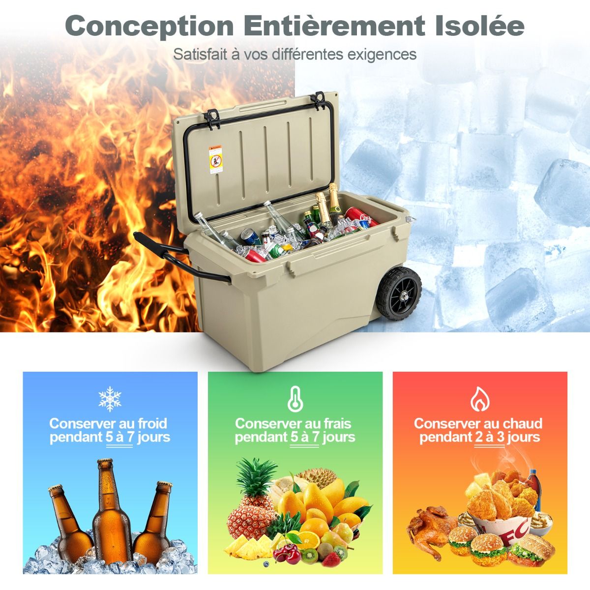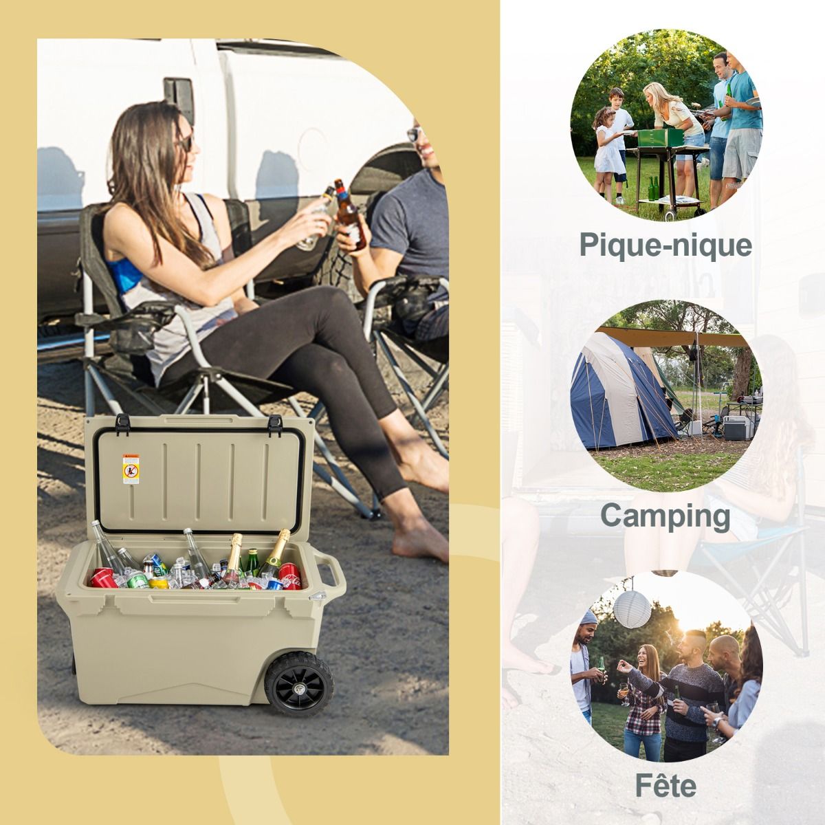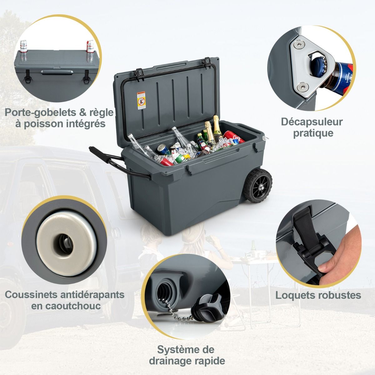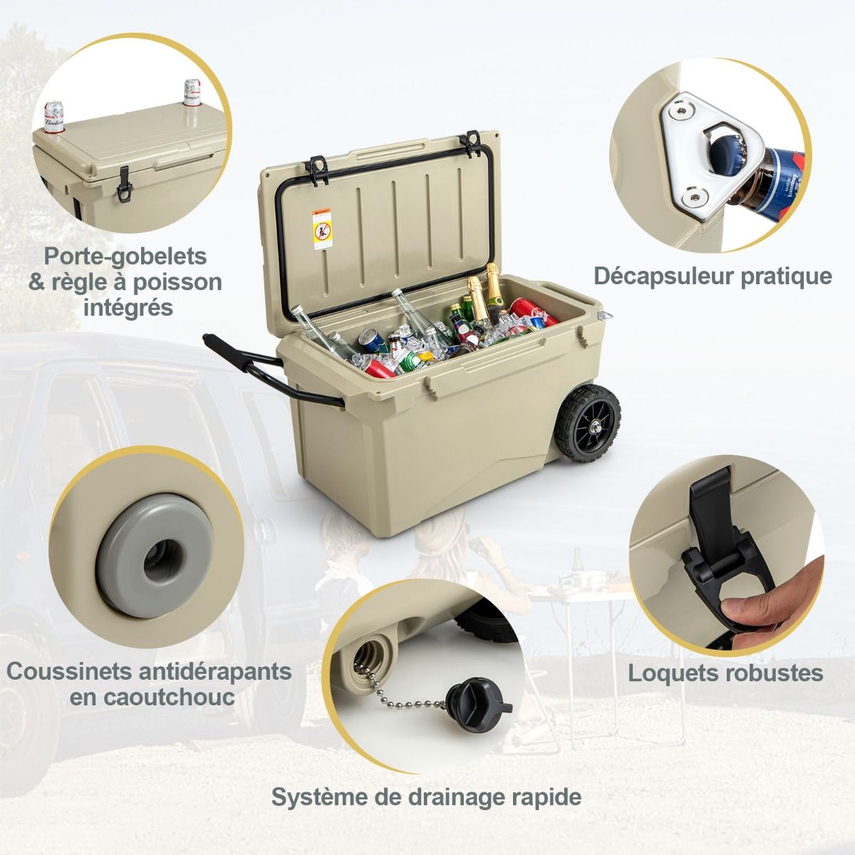 This wheeled cooler is made using a rotational molding process, ensuring durability and robust reliability. Rubber sealing rings and latches provide a tight seal, effectively locking in cold air and keeping drinks hot for 5 to 7 days. Equipped with a handle and two wheels, it's easy to move. An internal handle also offers additional carrying options. Practical accessories such as a cup holder, fish ruler, and bottle opener add convenience. It's ideal for various outdoor activities such as fishing, camping, and barbecuing. Product Features: Fully Insulated DesignThis wheeled cooler features freezer-grade sealing rings and robust latches, completely sealing the interior to prevent leaks and providing superior insulation. The rotational molding process keeps drinks cold for 5 to 7 days and hot for 2 to 3 days. Reliable ConstructionMade from thick, durable LLDPE and polyurethane materials, this cooler is long-lasting. The rotational molding process ensures overall sturdiness, while non-slip rubber feet prevent slippage, keeping the cooler stable. Easy to TransportThanks to its aluminum pull rod with soft foam and heavy-duty all-terrain wheels, you can easily move this insulated cooler wherever you need it. Convenient side handles and an integrated carrying handle offer even more transport options. Thoughtful DetailsA built-in cup holder makes it easy to store your cups. A fish gauge lets you measure your catch immediately. A convenient side bottle opener makes it easy to enjoy chilled drinks. In addition, the drainage system is quick and easy to use. Versatile UseBesides picnics, this wheeled portable cooler is also suitable for camping, fishing, and road trips. When you feel tired, you can close the lid and sit down to rest. Furthermore, this wheeled cooler can also be used as a picnic table when needed. Product Features: Rotational molding process, sturdy and durable; thickened walls and rubber buckles, keeping food cold for 5-7 days; freezer-grade sealing ring effectively blocks heat and locks in cold air; equipped with handles and high-quality casters for easy movement; built-in extra handles provide multiple carrying options; non-slip base enhances safety and stability; unique drainage system for quick and easy emptying of water; built-in cup holders, fish ruler, and bottle opener for convenient use; can be used as a picnic table and chairs, supporting up to 100 kg; ideal for fishing, camping, picnics, barbecues, and other outdoor activities. Specifications: Color: Charcoal Black/Khaki; Material: LLDPE, Polyurethane, Aluminum, Rubber; Product Dimensions: 87 x 45 x 46 cm (Length x Width x Height). Internal dimensions: 66.5 x 34.5 cm x 36 cm (L x W x H) Wheel diameter: 19 cm Capacity: 71 liters Weight capacity: 100 kg Net weight: 15 kg Package includes: 1 x Wheeled refrigerator, 1 x Instruction manual