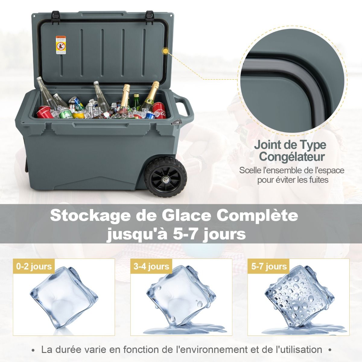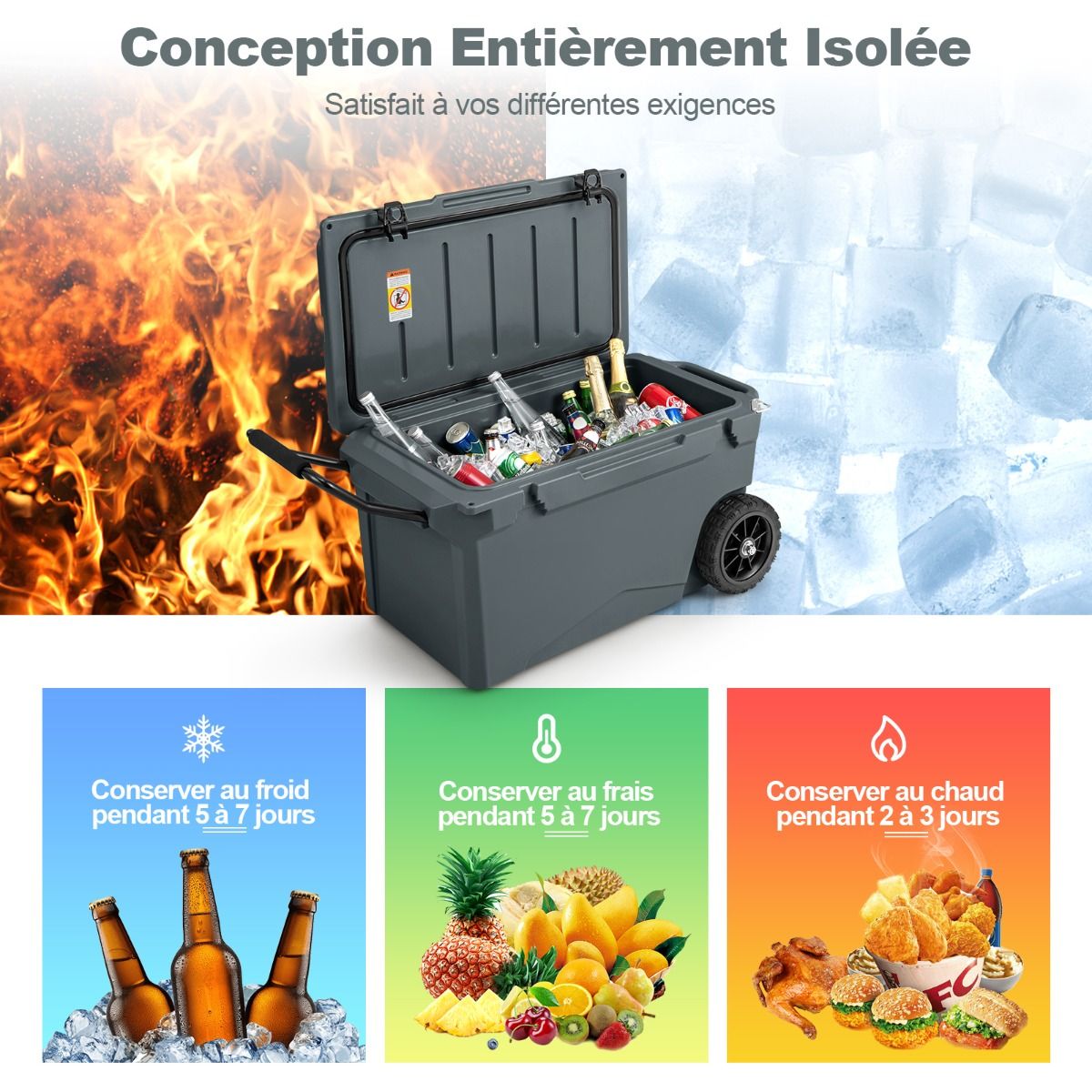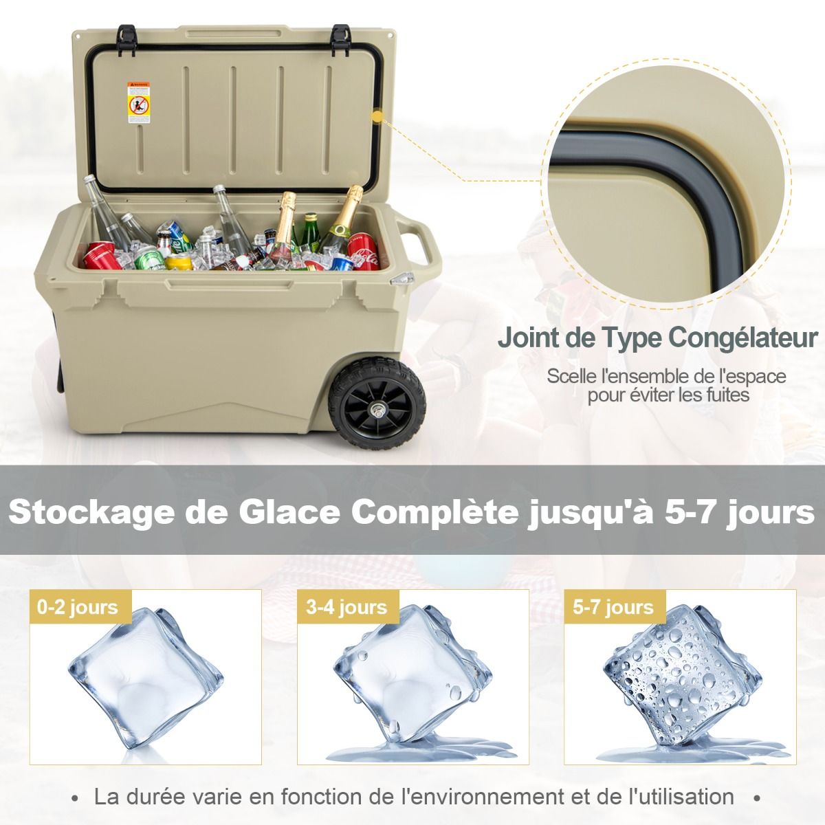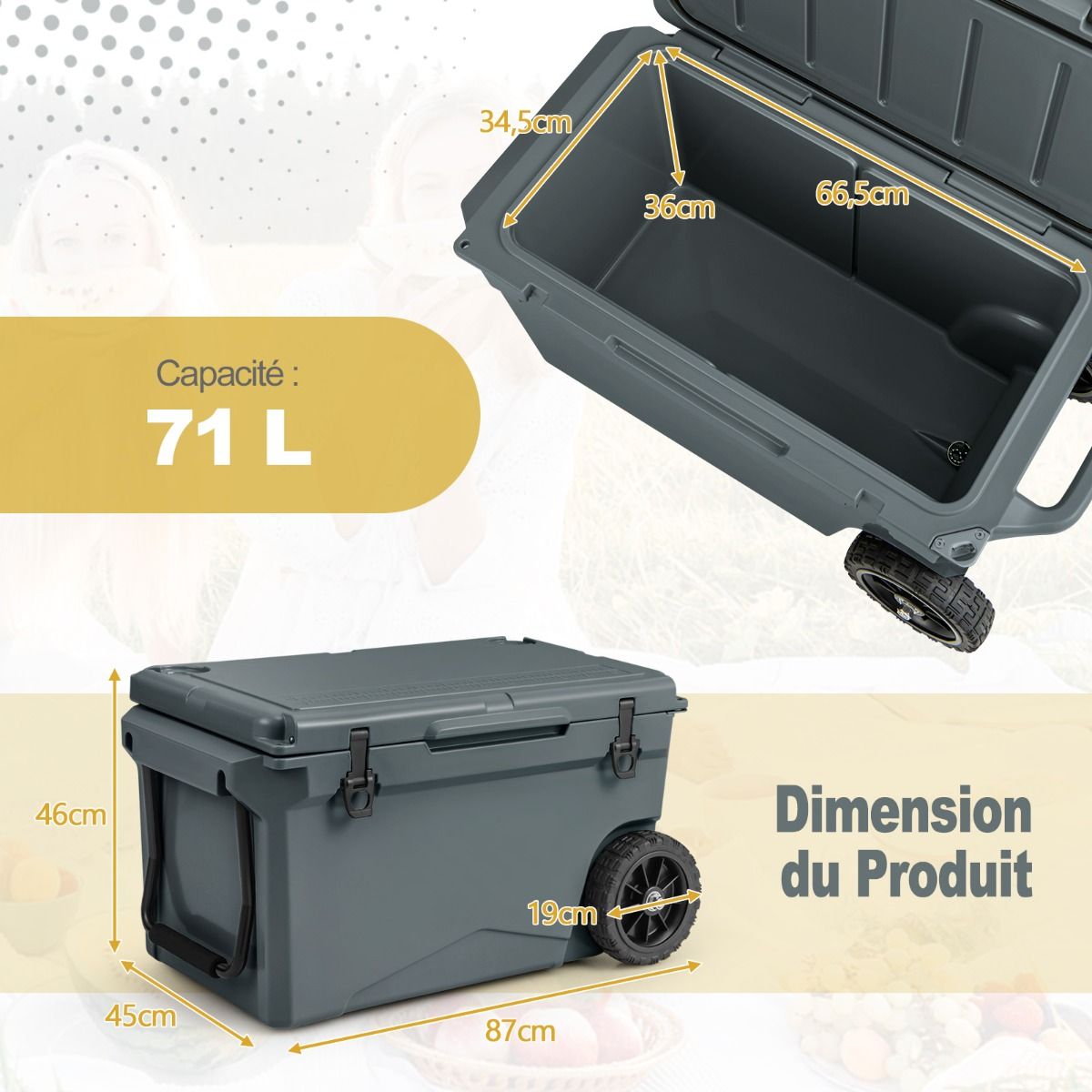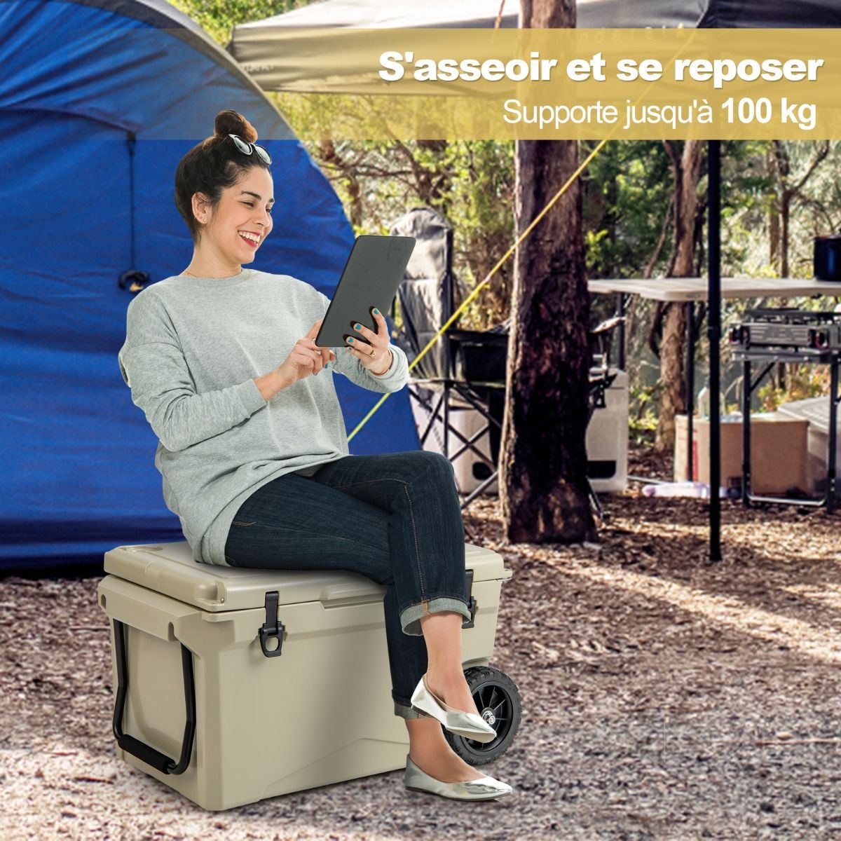 This wheeled cooler is made using a rotational molding process, ensuring durability and robust reliability. Rubber sealing rings and latches provide a tight seal, effectively locking in cold air and keeping drinks hot for 5 to 7 days. Equipped with a handle and two wheels, it's easy to move. An internal handle also offers additional carrying options. Practical accessories such as a cup holder, fish ruler, and bottle opener add convenience. It's ideal for various outdoor activities such as fishing, camping, and barbecuing. Product Features: Fully Insulated DesignThis wheeled cooler features freezer-grade sealing rings and robust latches, completely sealing the interior to prevent leaks and providing superior insulation. The rotational molding process keeps drinks cold for 5 to 7 days and hot for 2 to 3 days. Reliable ConstructionMade from thick, durable LLDPE and polyurethane materials, this cooler is long-lasting. The rotational molding process ensures overall sturdiness, while non-slip rubber feet prevent slippage, keeping the cooler stable. Easy to TransportThanks to its aluminum pull rod with soft foam and heavy-duty all-terrain wheels, you can easily move this insulated cooler wherever you need it. Convenient side handles and an integrated carrying handle offer even more transport options. Thoughtful DetailsA built-in cup holder makes it easy to store your cups. A fish gauge lets you measure your catch immediately. A convenient side bottle opener makes it easy to enjoy chilled drinks. In addition, the drainage system is quick and easy to use. Versatile UseBesides picnics, this wheeled portable cooler is also suitable for camping, fishing, and road trips. When you feel tired, you can close the lid and sit down to rest. Furthermore, this wheeled cooler can also be used as a picnic table when needed. Product Features: Rotational molding process, sturdy and durable; thickened walls and rubber buckles, keeping food cold for 5-7 days; freezer-grade sealing ring effectively blocks heat and locks in cold air; equipped with handles and high-quality casters for easy movement; built-in extra handles provide multiple carrying options; non-slip base enhances safety and stability; unique drainage system for quick and easy emptying of water; built-in cup holders, fish ruler, and bottle opener for convenient use; can be used as a picnic table and chairs, supporting up to 100 kg; ideal for fishing, camping, picnics, barbecues, and other outdoor activities. Specifications: Color: Charcoal Black/Khaki; Material: LLDPE, Polyurethane, Aluminum, Rubber; Product Dimensions: 87 x 45 x 46 cm (Length x Width x Height). Internal dimensions: 66.5 x 34.5 cm x 36 cm (L x W x H) Wheel diameter: 19 cm Capacity: 71 liters Weight capacity: 100 kg Net weight: 15 kg Package includes: 1 x Wheeled refrigerator, 1 x Instruction manual