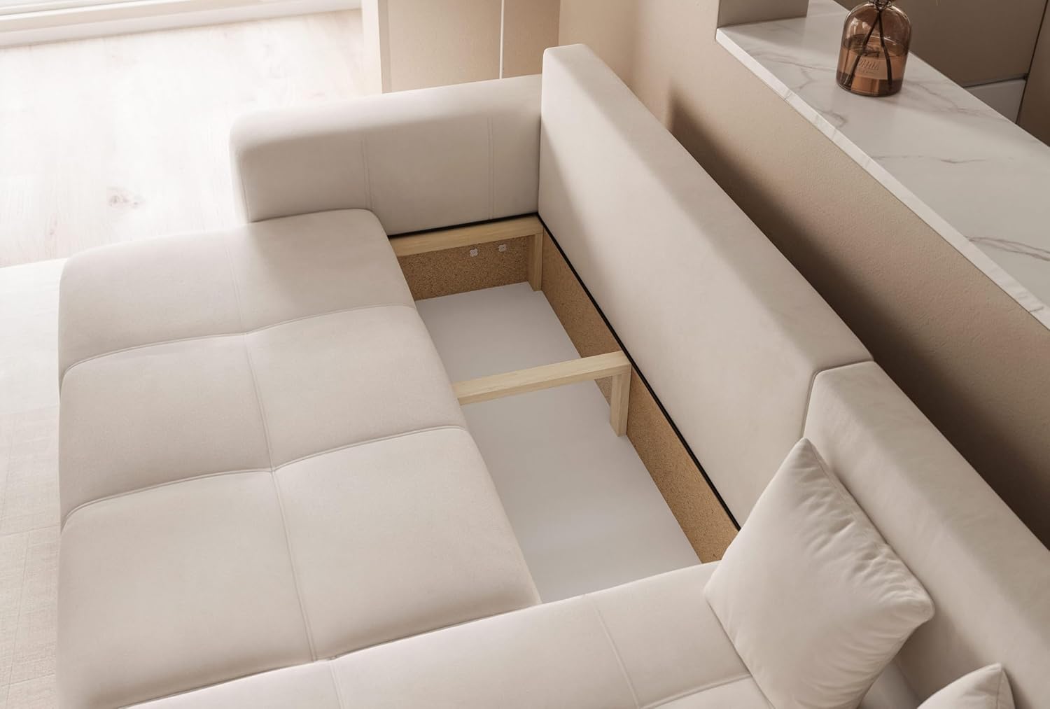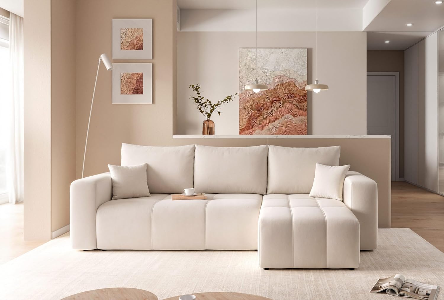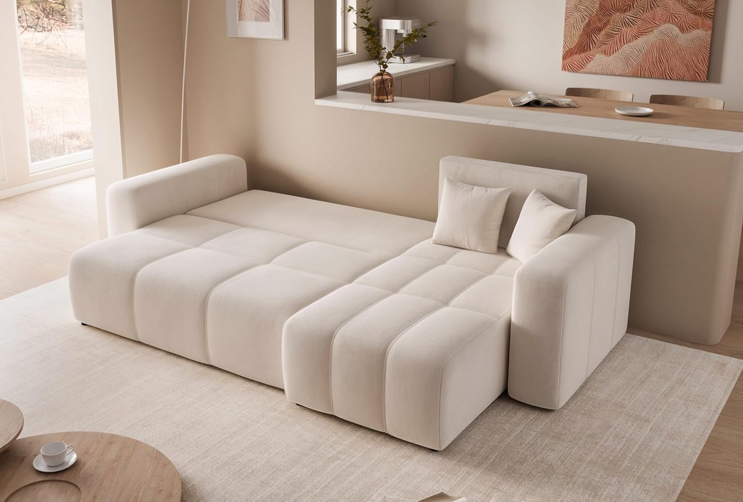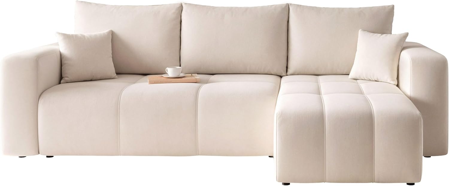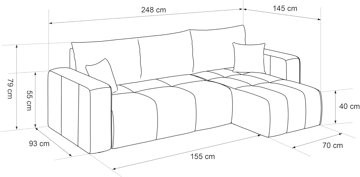 This convertible sofa is ideal for maximizing living room space. In addition to its traditional functions, it cleverly incorporates storage space. This three-seat convertible sofa easily transforms into a comfortable bed, perfect for entertaining unexpected guests. Its elegant design blends seamlessly with any modern interior decor, combining style and practicality. A living room essential! This three-seat corner sofa goes beyond the standard three-seat sofa. Its L-shaped design optimizes space utilization, making it ideal for larger living rooms. This convertible sofa offers exceptional comfort, perfect for everyday use, providing an additional sleeping solution without compromising the living room's style. Its 200x125cm sleeping surface ensures your guests enjoy unparalleled comfort. It's more than just a convertible sofa; it also boasts ample storage space. This sofa adds a touch of elegance to any interior space, combining practicality and style. This convertible corner sofa is the perfect choice for optimizing space utilization. Made with T30 high-density foam, this piece offers superior support and high elasticity, making it ideal for your living room. This convertible sofa bed is durable, incredibly comfortable, and resistant to deformation. This three-seat convertible sofa combines style and practicality, easily transforming into a comfortable bed. For those who appreciate quality and timeless design, this furniture is the perfect choice. This corner sofa features a solid wood frame, making it sturdy and durable, an elegant accent to any living room. Product Description: Do you yearn to create a living room where everyone feels comfortable and relaxed? Our PEDRO corner sofa is the ideal choice it perfectly embodies elegance and comfort, blending modern design with superior comfort. While understated, the PEDRO corner sofa's exquisite design and elegant aesthetics instantly attract attention. Its unique design makes it a focal point in any room. Furthermore, the decorative stitching on the seat surface adds an elegant touch, making it ideal for minimalist interior design. A major advantage of this sofa is its versatility; you can place the footstool on the left or right side according to your needs and preferences. Thanks to its sleeping function, this sofa can easily transform into a comfortable bed, measuring 125 x 200 cm. In addition, this corner sofa features a practical bed drawer for storing bedding, pillows, or other items, making it a more functional piece of furniture in the living room. The Pedro corner sofa's classic L-shaped design provides ample seating and relaxation space, allowing you to invite friends and family over for gatherings without worrying about space constraints. For enhanced comfort, the resilient seat surface is carefully upholstered in soft and elastic T30 polyurethane foam, ensuring sufficient support and comfort even during extended periods of sitting. Its neutral color allows it to easily blend into various decor styles, from modern to classic. Dimensions: Overall width: 248 cm, Overall depth: 145 cm, Overall height: 79 cm, Chaise lounge width: 70 cm, Seat height: 40 cm, Armrest height: 55 cm.