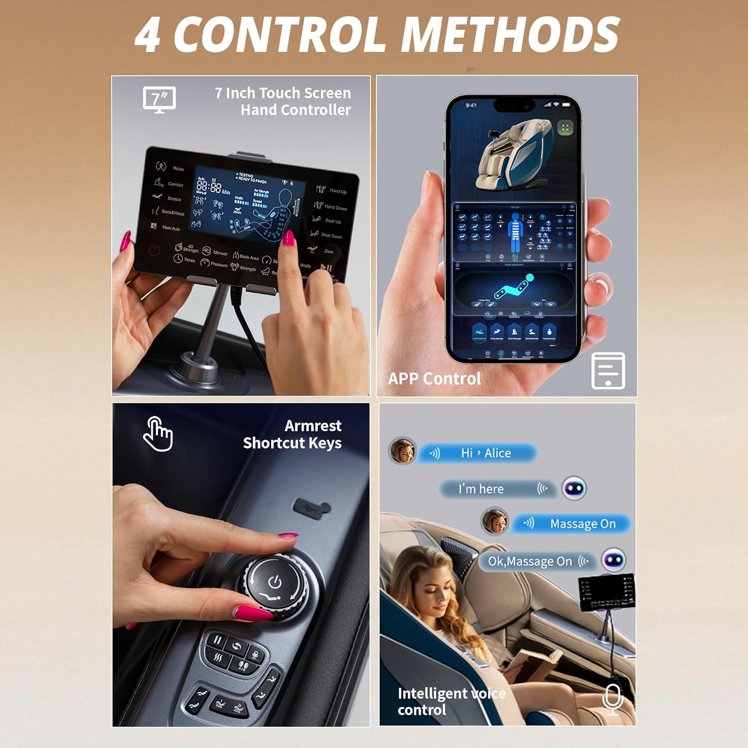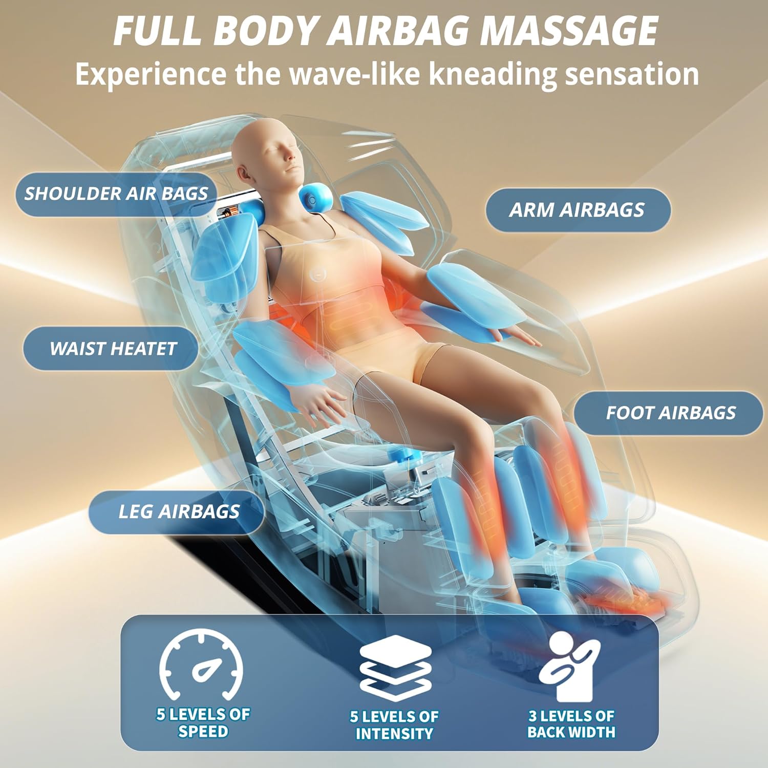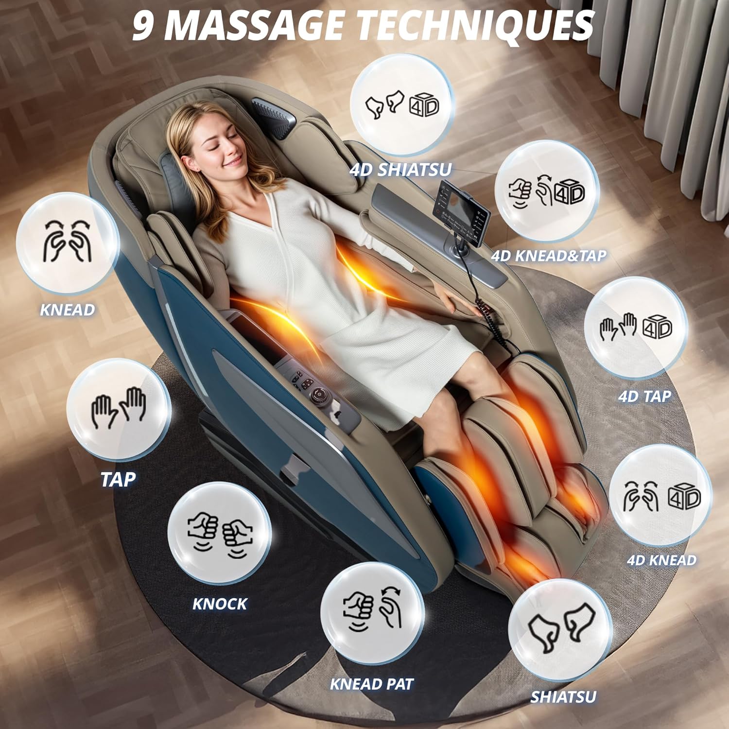 Air pressure massage and rotary acupressure massage: Cleverly distributed air cushions from shoulders to feet apply soothing, rhythmic pressure to release muscle tension and promote blood circulation. Foot and calf massages provide extra comfort, especially suitable for relaxing after long periods of standing. The combination of air pressure massage and rotary acupressure massage heads helps relax tense muscles in the calves and feet. Intelligent rocking massage chair: This massage chair features an automatic scanning system that automatically adjusts massage points according to your back (shoulder width and height). The extended SL rail allows the massage to conform to the curve of your back, relaxing the spine and soothing tense muscles. Suitable for individuals 145 to 190 cm tall, the adjustable footrest extends up to 16 cm. Zero gravity: This massage chair offers two zero-gravity tilt angles for a deeply relaxing massage experience. Simply press a button to set a comfortable tilt angle. Simultaneously, your heart and knees are aligned, effectively lowering blood pressure and promoting blood circulation. Breathing becomes gentle and deep, effectively relieving pressure on joints and the spine. Multifunctional and Convenient Controls: The right armrest panel and left armrest feature an LCD remote control. The backrest offers progressive tilt. Built-in speakers support Bluetooth music playback. Voice control ensures easy operation. Graphene Heating for Highly Effective Therapy: Our graphene heating technology provides rapid, safe, and stable heat therapy.