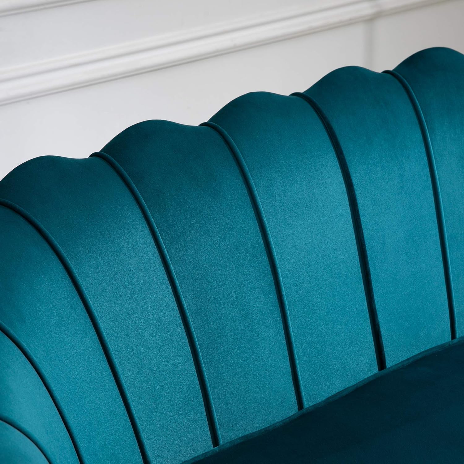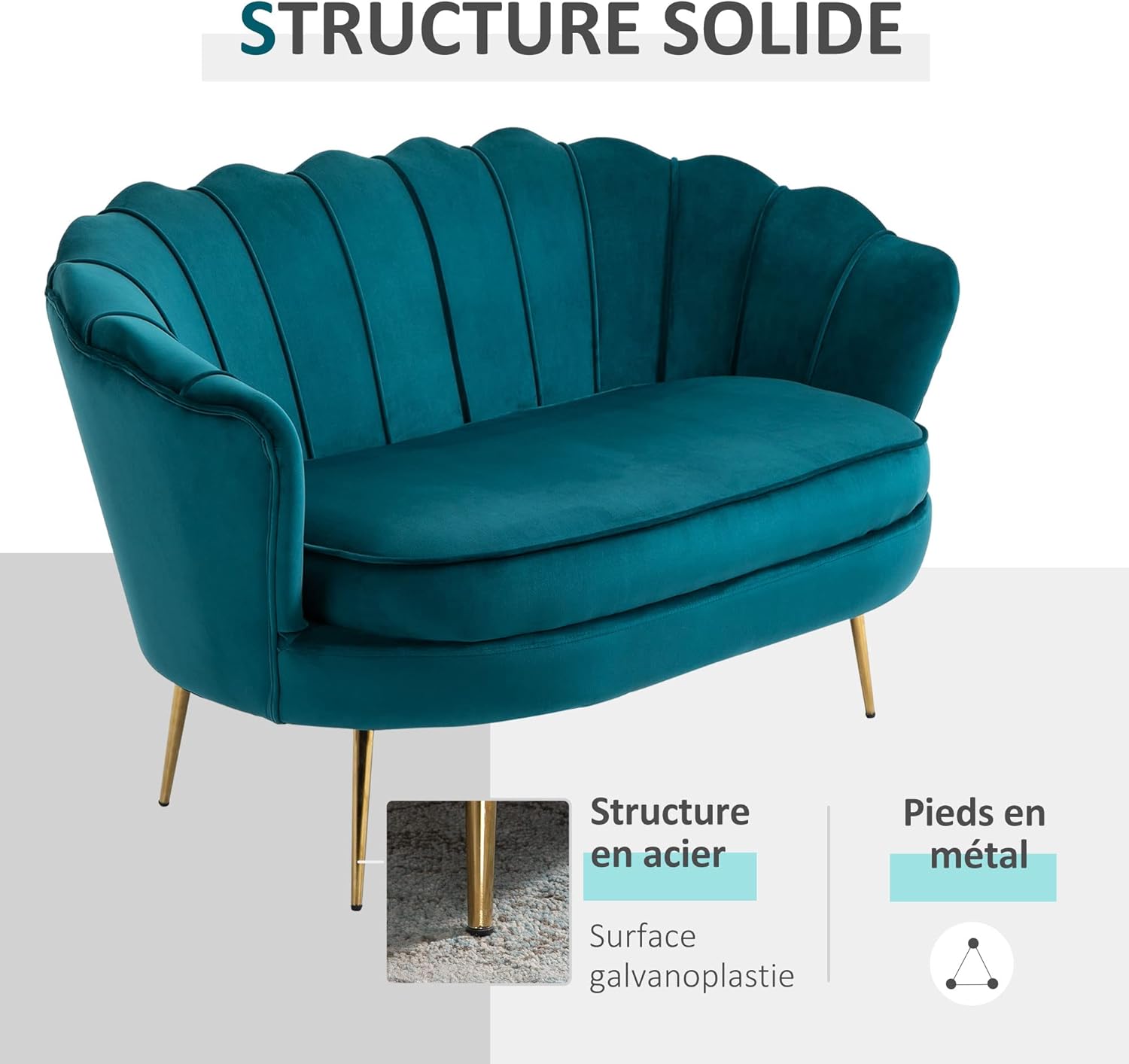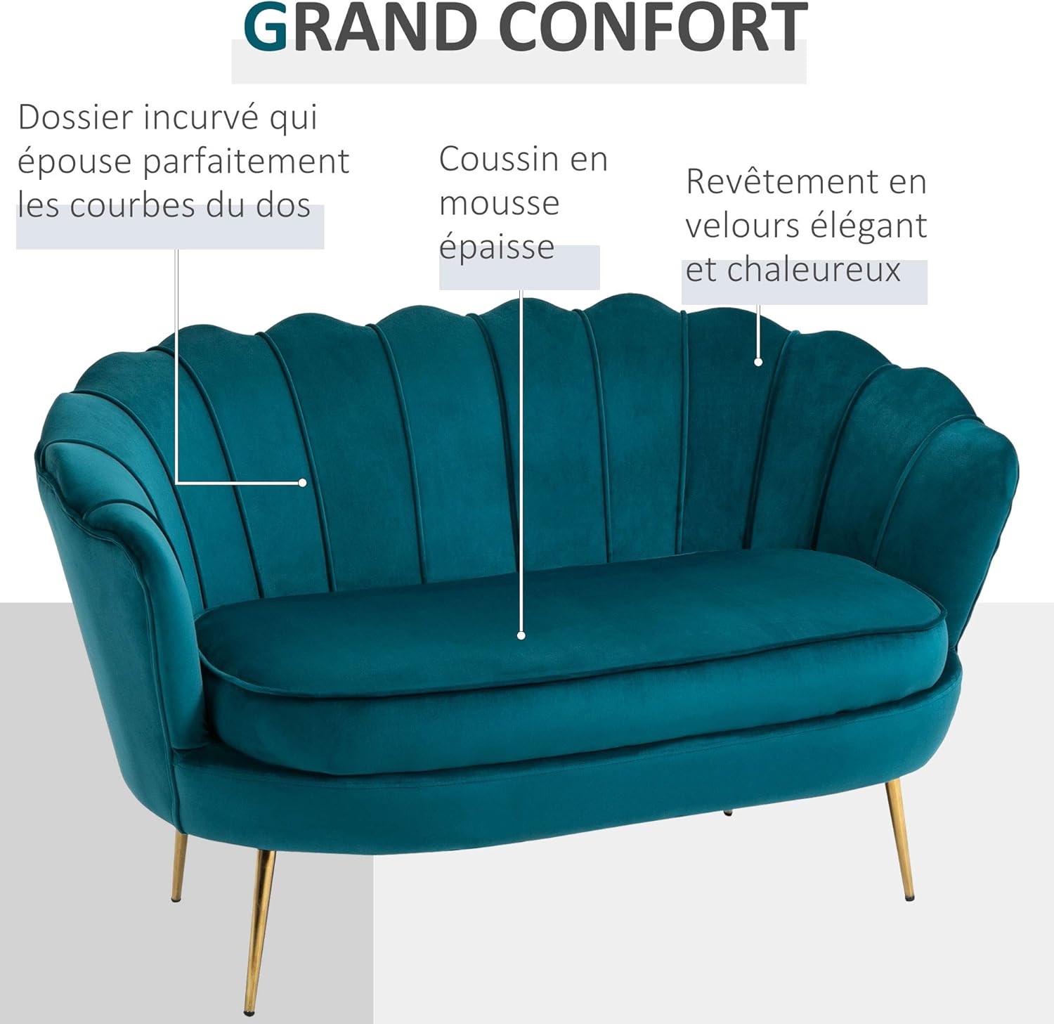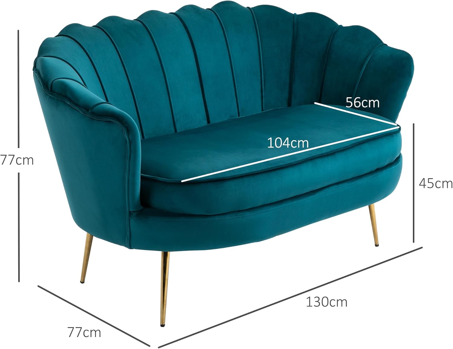 Design: This classic and stylish shell-shaped two-seater sofa adds elegance and personality to your interior space. Compact Sofa: This small sofa, measuring approximately 1 square meter, features smooth, rounded lines and curved armrests and backrest, seamlessly integrating into any interior space of your choice: living room, office, bedroom, etc. Comfort Experience: This two-seater living room sofa is upholstered in soft-touch velvet-textured polyester fabric, providing comfortable seating regardless of temperature; the seat is filled with 10cm thick high-density foam (24D density). Durable and Sturdy: Metal frame, tapered angled gold-plated metal legs with non-slip, leveling feet (5mm height adjustable): ensuring maximum stability, lasting comfort, and adding a touch of sophistication. Small Two-Seater Sofa Information: Overall Dimensions: 130cm wide x 77cm deep x 77cm high. - Seat dimensions: 104 cm wide x 56 cm deep x 45 cm high (thickness: 10 cm); - Backrest dimensions: 96 cm wide x 32 cm high (to the seat); - Armrest thickness: 10 cm; - Maximum load capacity: 150 kg; Assembly required.