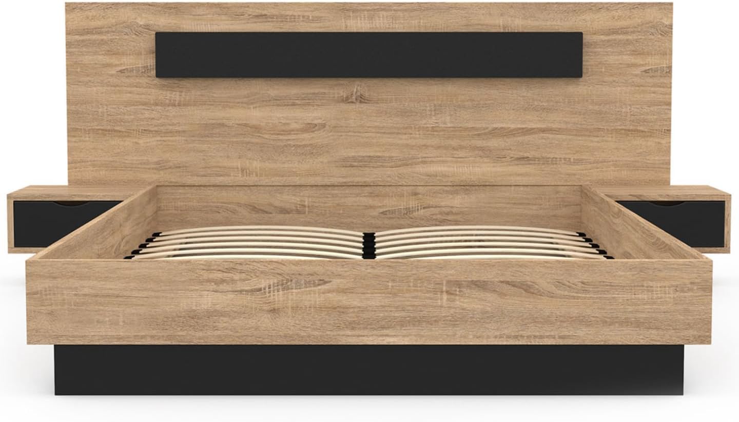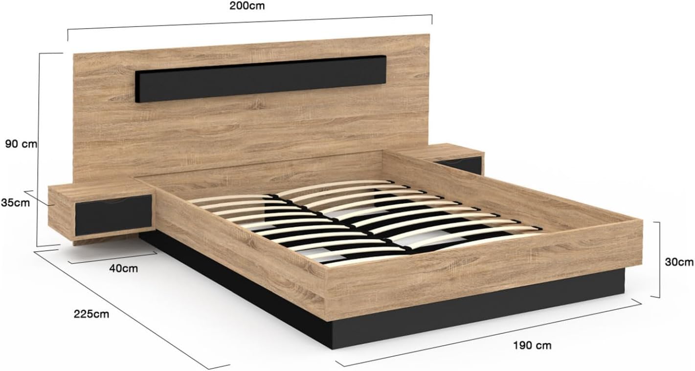 This SANTA double bed will add a touch of design and modernity to your bedroom. The clever storage space under the bed is especially suitable for storing larger bedding! It comes with two bedside tables with drawers and a headboard with a headrest. The bed frame uses 24 slats to ensure optimal sleep quality. The sturdy bed frame is made of particleboard with a wood grain and black finish. This SANTA 140 x 190 cm storage bed, with its wood grain and black finish bedside tables, combines practicality and design. The wood grain and black color scheme allows your bed to blend perfectly into your interior decor, adding a warm atmosphere to your home. This highly practical adult bed features two bedside tables with drawers for convenient storage of everyday items such as your favorite books, tissues, or anything else you want to keep within easy reach. You can also place bedside lamps, alarm clocks, or other decorative items on the bedside table surfaces. The 140 x 190 cm size perfectly fits a standard double mattress. In addition, its 24-slat bed frame provides optimal support for your mattress, enhancing sleep comfort. This bed also features a spacious and practical storage space, the same size as the bed frame, that opens and closes easily with a gentle push: thanks to a gas spring system, the bed frame can be easily lifted. The storage space is versatile, storing sheets, comforters, quilts, cushions, and heavy clothing, truly saving time and space! Say goodbye to mountains of pillows and let the SANTA bed and its built-in storage help you keep your bedroom tidy at all times. For further comfort, a headboard is also included, allowing you to relax comfortably in bed or enjoy reading time. This SANTA storage bed is made of particleboard, combining practicality and style, making it ideal for your bedroom or guest room. Don't hesitate any longer, choose this storage bed with built-in storage and a 140 x 190 cm slat bed frame today! SANTA Storage Bed (with bedside table) Dimensions: Overall dimensions: Length 225 cm x Width 199 cm x Height 90 cm