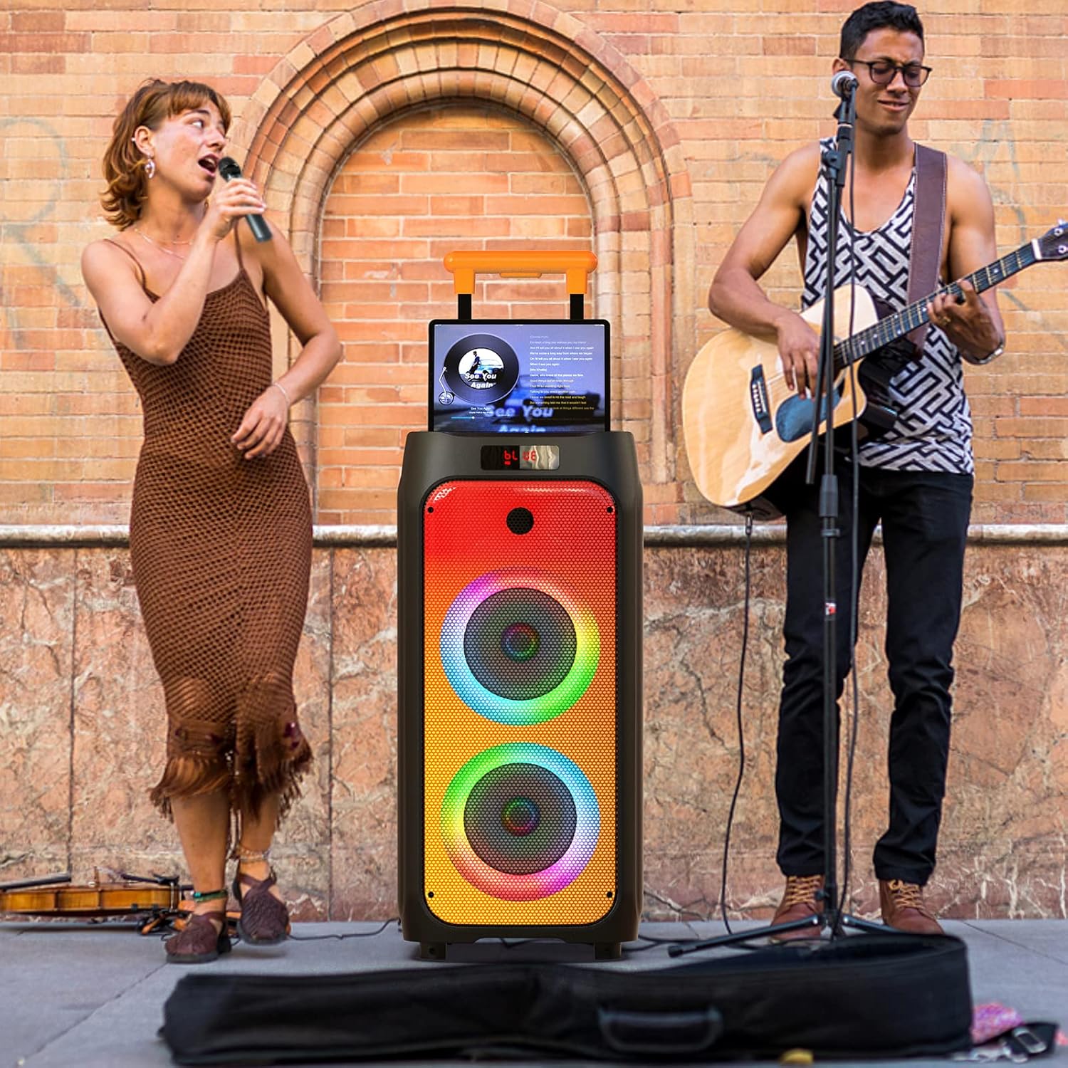 Superior Sound Quality and Deep BassEquipped with two 6.5-inch woofers and a 3-inch tweeter. Traditional speakers often require complex and bulky enclosures to achieve excellent bass effects, but our speakers utilize the advantages of a DSP digital electronic crossover to break through the limitations of traditional technology and easily deliver rich stereo effects. The bass is deep and powerful, distortion-free, and vocals are clear and bright. TWS Stereo Surround Sound and Immersive Sound EffectsDual stereo combination playback instantly transforms your living room into a home theater. Wireless stereo surround sound brings an immersive listening experience, filling the sound with vivid imagery and emotion. DJ Lights for a Karaoke ExperienceDJ lights can instantly transform any space into a rock concert, nightclub, or karaoke box. Create dynamic stage lighting effects with music. IPX4 waterproof design means you don't have to worry about splashing water on the speaker whether you're partying with friends on the terrace or enjoying drinks by the pool. Two Wireless UHF Microphones and Infrared Remote ControlEquipped with two wireless UHF microphones with noise reduction and anti-hissing functions (enjoy a karaoke party with friends without having to buy additional microphones). With a wireless transmission distance of up to 50 meters, you can break free from the constraints of cables. You can operate all the functions of the karaoke machine via remote control. [Rechargeable speaker with wheels and handle] Built-in high-capacity rechargeable battery; a full charge provides 6-8 hours of continuous music enjoyment. The FanFun karaoke machine is designed for outdoor enthusiasts, equipped with wheels and a handle for easy portability. 1. Full range of karaoke functions 2. Large capacity 3. Volume control 4. Portable design, suitable for outdoor use. This karaoke machine is an excellent gift for friends and family (birthday gift, Christmas gift, etc.).