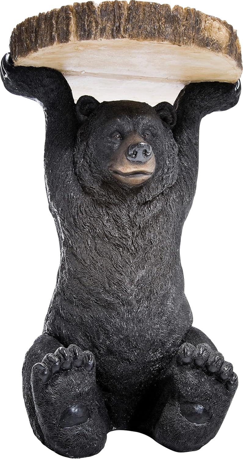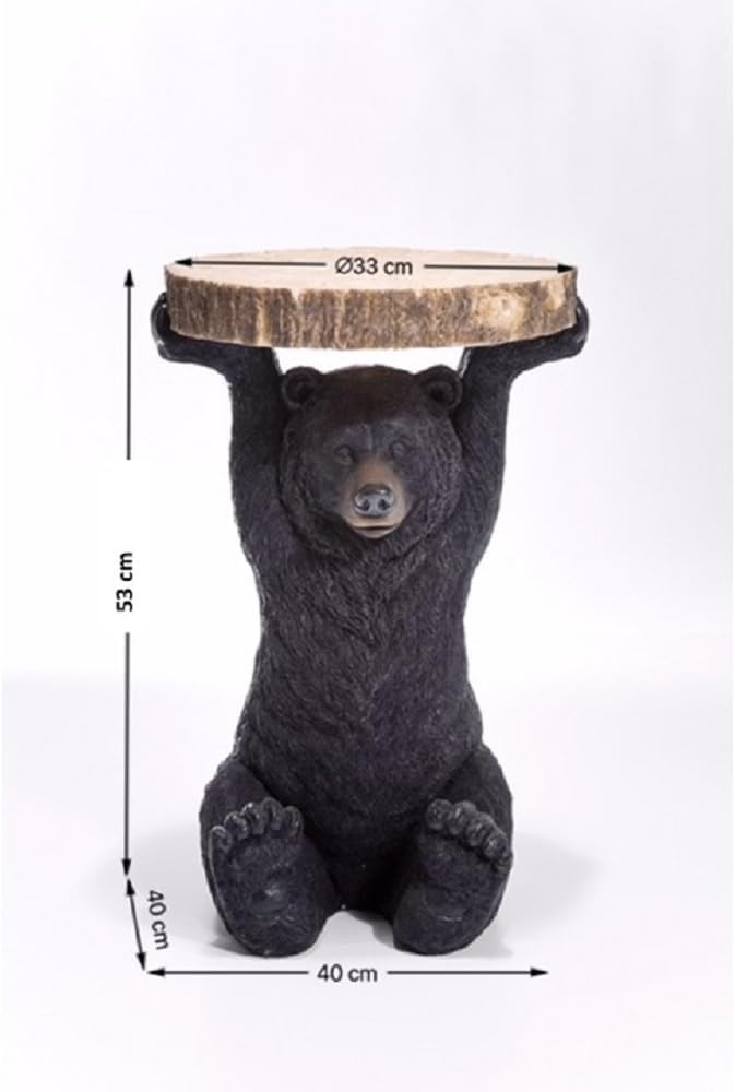 Small Side Table: Round, black and brown, dimensions 53 x 33 x 33 cm (H/W/D). KARE Original Design: The tabletop is supported by a small bear in a tree trunk shape. Versatile: Perfect for placing next to a sofa, in a hallway, or as a bedside table. Durable Material: Made of lacquered resin for long-lasting durability. Easy to Move: Weighs 6 kg, making it easy to move. Product Description: This unique bear-shaped side table will definitely become the focal point of your interior space! It's not only very practical, serving drinks or snacks, but also a true decorative piece. The side table is meticulously crafted from natural materials, showcasing exquisite details. Whether in the living room, bedroom, or office, this bear-shaped side table creates a fun and playful animal-themed atmosphere.