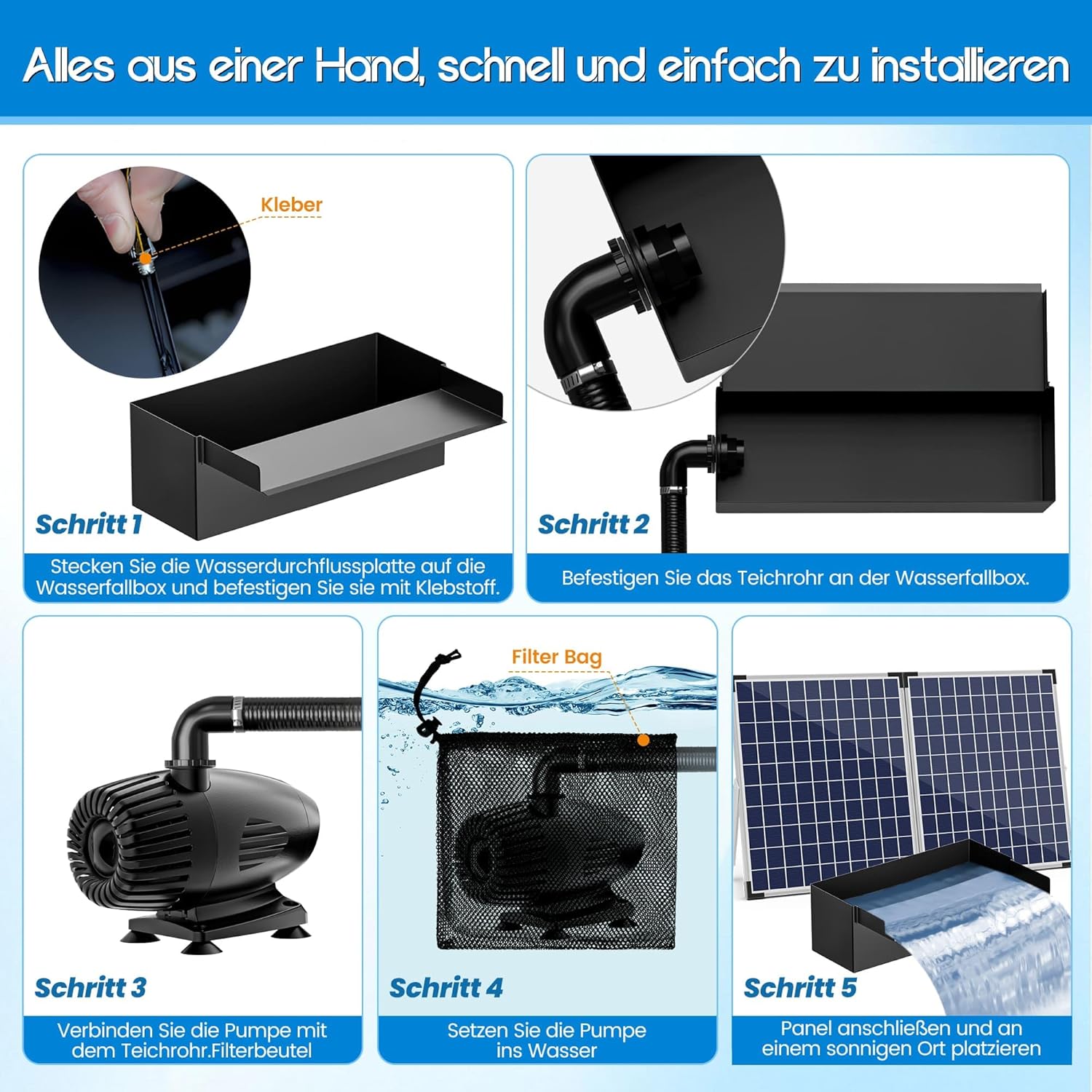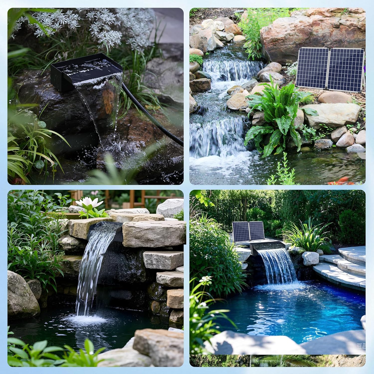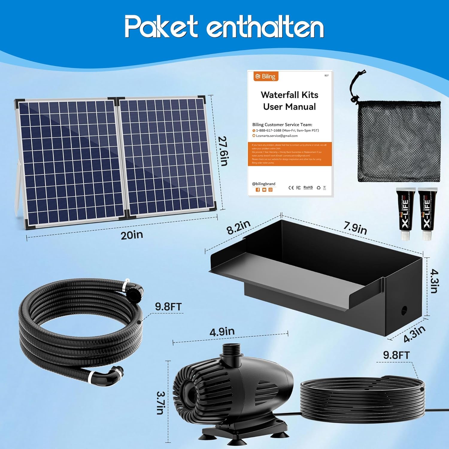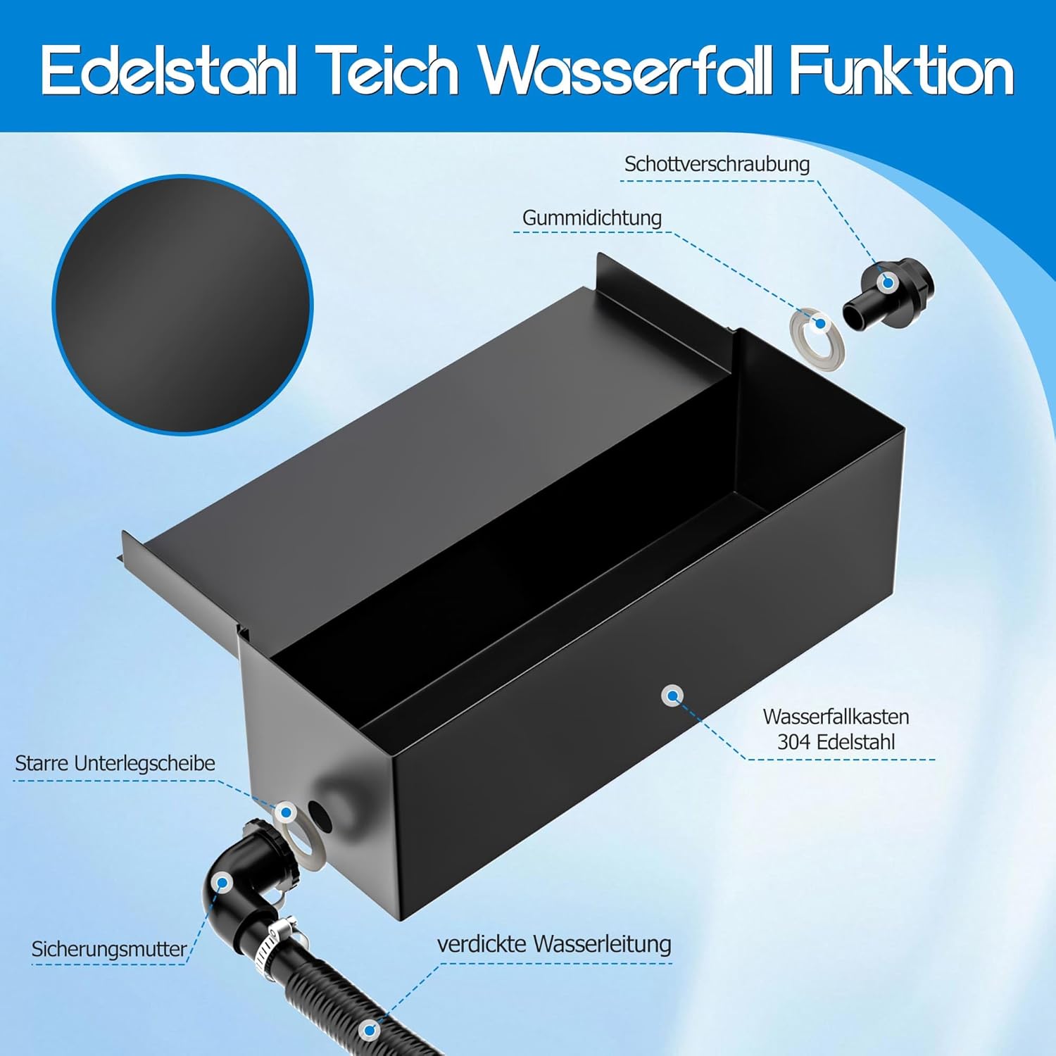 Sustainable Solar Waterfall: The high-efficiency 50W polycrystalline solar panel provides reliable and consistent power. An eco-friendly and energy-saving solution for sustainable garden design. With a 5m cable, you can easily install the solar panel in an optimal location. Adorable Waterfall Effect for Pools: The powerful pond pump with a flow rate of 2100 L H and the wide outlet ensures a consistent cascade and a soothing sound. It adds an elegant touch and enhances the natural beauty of your garden. li li class='a-spacing-mini' span class='a-list-item' PREMIUM STAINLESS STEEL GARDEN POND WATERFALL POND - This waterfall pond is made of robust 304 stainless steel and is ideal for long-term outdoor use. li It is ideal for designing an impressive water feature in ponds, swimming pools, or basins with a capacity of up to 4000 liters. Simple elegance for any setting: with a stylish black stainless steel overflow (20 x 21 x 11 cm), this pond overflow blends seamlessly into any garden, pond, or pool and adds a touch of elegance to your outdoor space. EASY INSTALLATION AND MAINTENANCE - The Biling pond waterfall comes with all the necessary accessories for easy installation and maintenance. Create an impressive cascading landscape in your garden today!