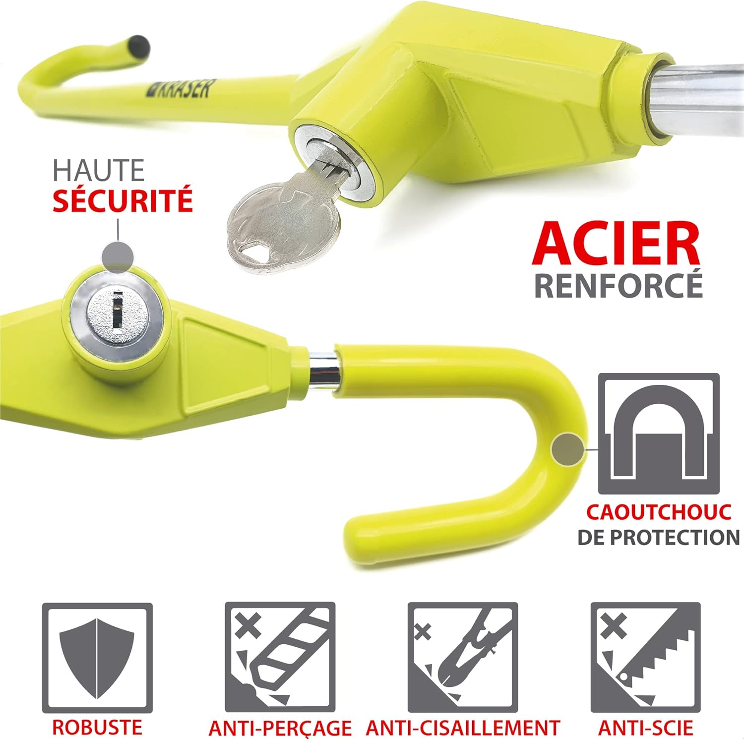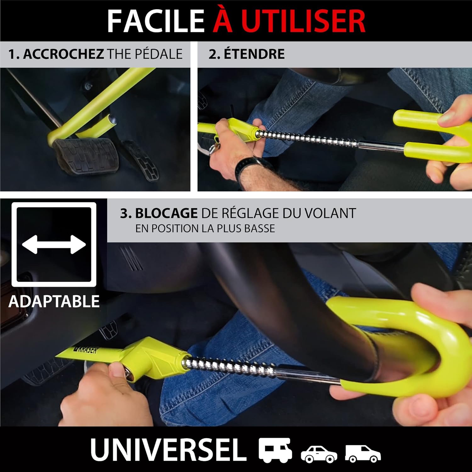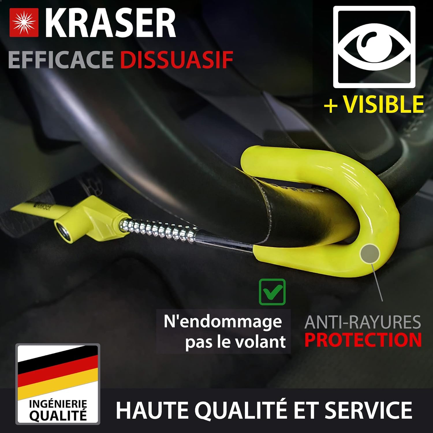 Maximum Visual Deterrence: This brightly colored car steering wheel lock is a true anti-theft steering wheel lock that effectively deters thieves in seconds. By locking the steering wheel and pedals, it enhances security even when the vehicle is parked. This steering wheel lock is designed to give you peace of mind. Reinforced Steel Structure: Made of solid steel, this steering wheel lock resists various theft methods such as sawing, prying, and drilling. It is a robust and reliable steering wheel lock that effectively resists the most common theft methods. Tested, this car lock has true mechanical protection. Quick and Adjustable Installation: The steering wheel lock can be installed on the steering wheel and pedals in seconds without tools. Its telescopic system is compatible with most car models and can be used as a steering wheel and pedal lock or a pedal lock. Simple, efficient, and suitable for everyday use. Durable and High-Quality Materials: With its fine workmanship and high-strength materials, this pedal lock boasts exceptional durability. Provides reliable long-term protection for your car. If you value security and quality, this steering wheel lock is the ideal choice. KRASER, Germany's number one trusted brand, represents superior engineering, a passion for theft prevention, and expert advice from an experienced lock manufacturer. Protect your vehicle with the best anti-theft solutions and enjoy peace of mind. Provide optimal security for your car. This hardened steel steering wheel lock features a robust and reliable locking mechanism that resists all types of attacks.