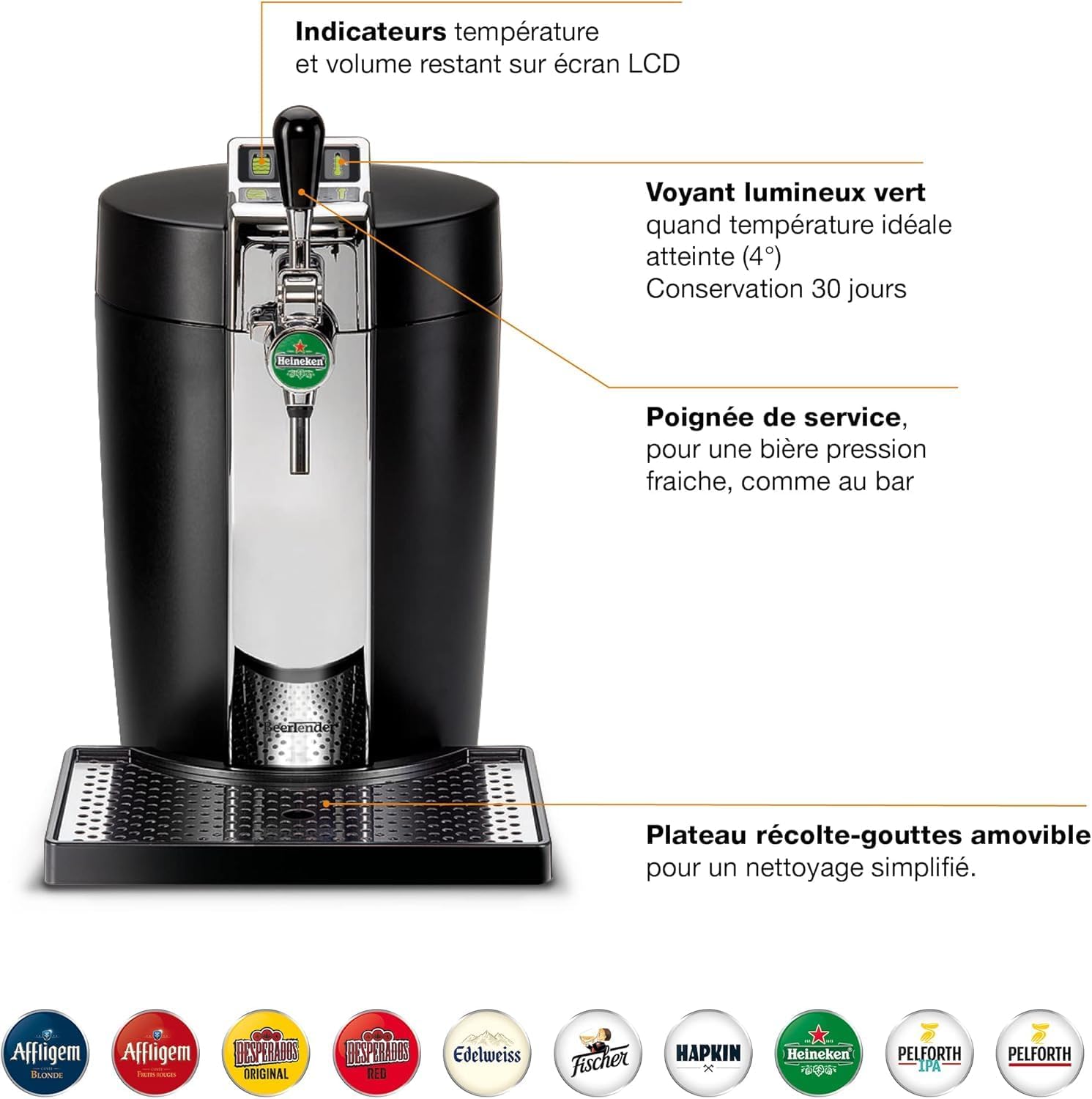 5-liter ultra-fresh draft beer. Thanks to the Bertender system, it maintains its quality for 30 days at the ideal temperature (4Spend) after opening. A variety of 5-liter beer kegs are compatible with the Bertender system, including brands such as Heineken, Desperados, Desperados Red, Pelforth Blonde, Pelforth IPA, Edelweiss, Fisher, Affligem Blonde, and Affligem Cuvee Carmin. LED indicators show remaining capacity and temperature. 15-year warranty at reasonable prices: We have 6,200 service providers worldwide, offering a 15-year warranty at reasonable prices, while also being committed to environmental protection and waste reduction. Elegant black chrome design, ergonomic, easy to use, and perfectly presented. The handle allows you to tilt the glass 45Spend first, then gradually straighten it until it reaches the desired height. Foam, removable drain tray. Enjoy draft beer at home. The BeerTender? beer dispenser system cools kegs to an ideal 4Spend temperature, maintaining beer quality for up to 30 days after opening. The KRUPS VB7008 beer pump displays the keg's cooling level and remaining beer level. The KRUPS BeerTender? dispenser is compatible with a variety of 5-liter kegs, including those from Heineken, Affligem, Affligem Carmin, Desperados, Pelforth, and Edelweiss.