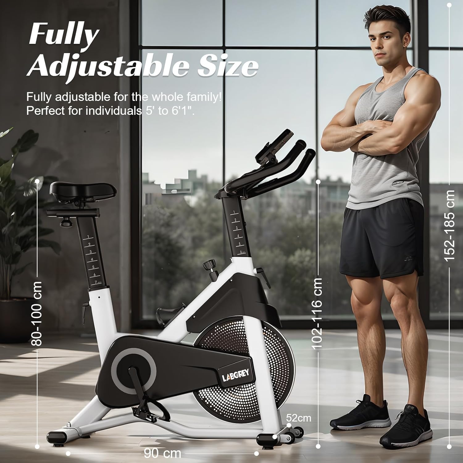 Upgraded Exercise Bike: The LABGREY exercise bike features a thickened frame, overcoming the instability issues common in most exercise bikes on the market. Its robust structure and 158kg load capacity ensure safe riding. Smooth and Quiet Exercise Bike: This exercise bike is equipped with a 15kg flywheel and a silent belt drive system, providing an extremely smooth and quiet riding experience. It won't disturb your family while you burn calories. Customizable Exercise Bike: The multi-position adjustable handlebars and adjustable seat are suitable for users from 155cm to 190cm in height. The adjustable resistance system allows this exercise bike to meet the different needs of beginners and professionals. Even if you can't go to the gym, you can boost your immunity, strengthen your cardiovascular system and muscles perfect for your and your family's health. Best Indoor Exercise Bike: The LCD screen tracks your riding time, speed, distance, mileage, pulse, and calorie consumption. The equipment holder allows you to watch fitness videos or listen to music while exercising. The convenient water bottle holder allows you to stay hydrated after your workout. Worry-Free Warranty: Online instructional videos help you assemble the bike in 30 minutes. We offer a 3-year parts replacement service. If you are not satisfied with the exercise bike in any way, please feel free to contact us; we are dedicated to serving you. You can contact us through the order details page. Stability and sturdiness: This exercise bike features a thickened frame tube design, providing excellent stability and a maximum load capacity of 130 kg, ensuring riding safety.