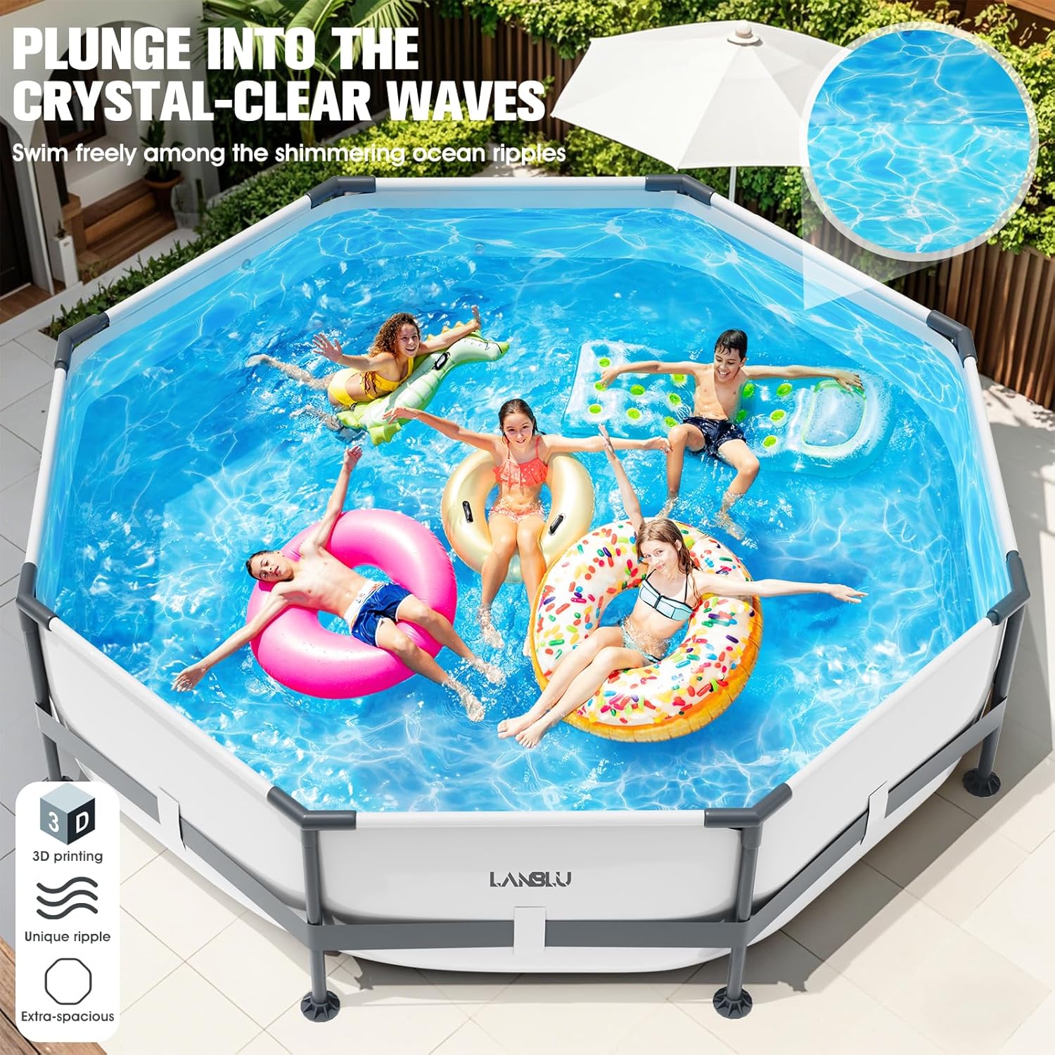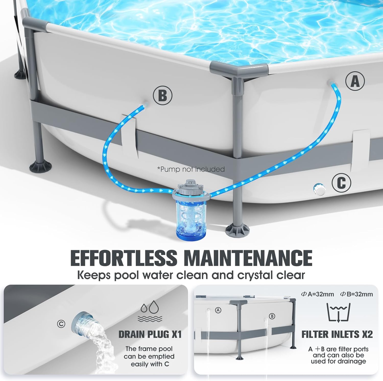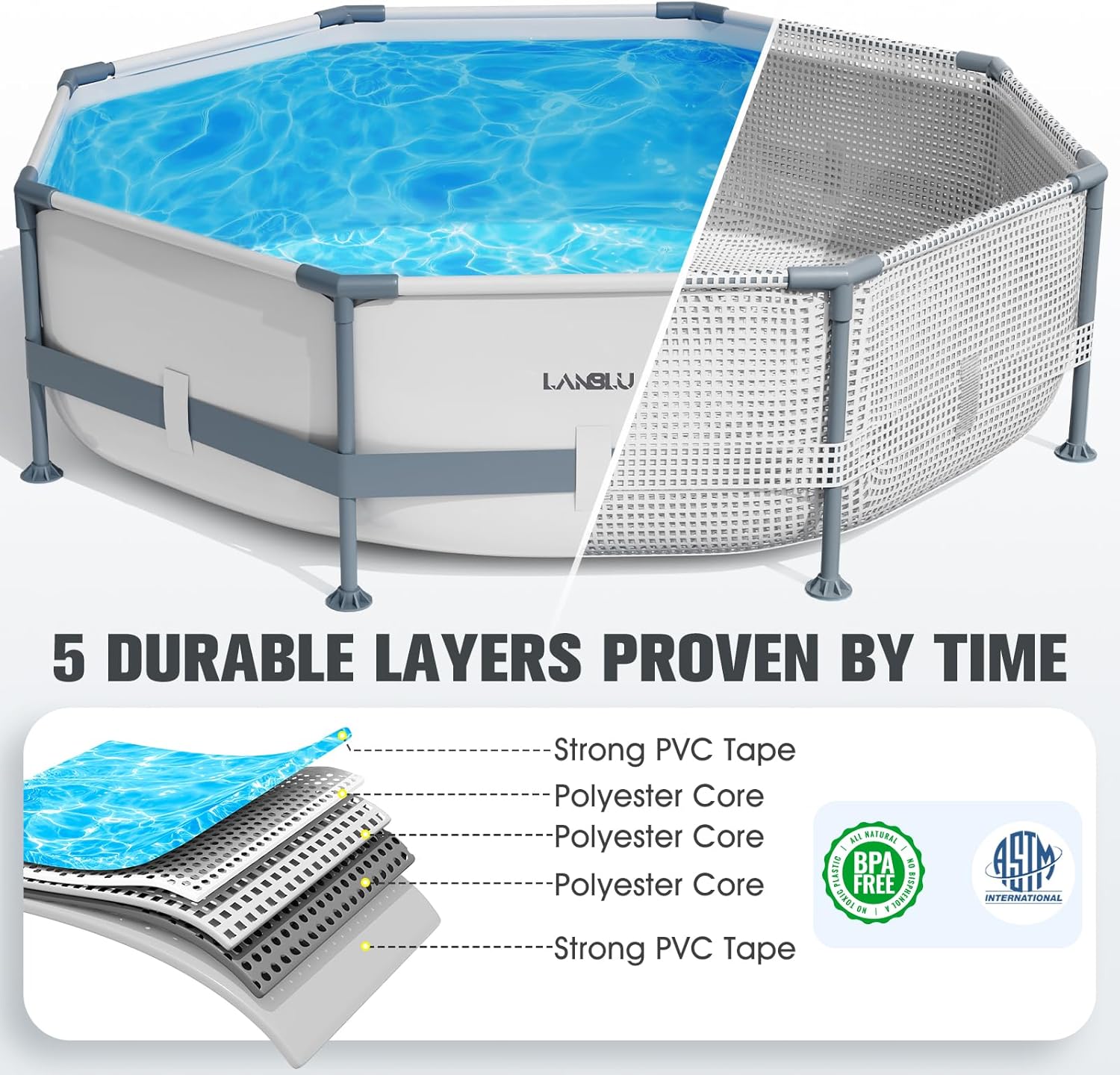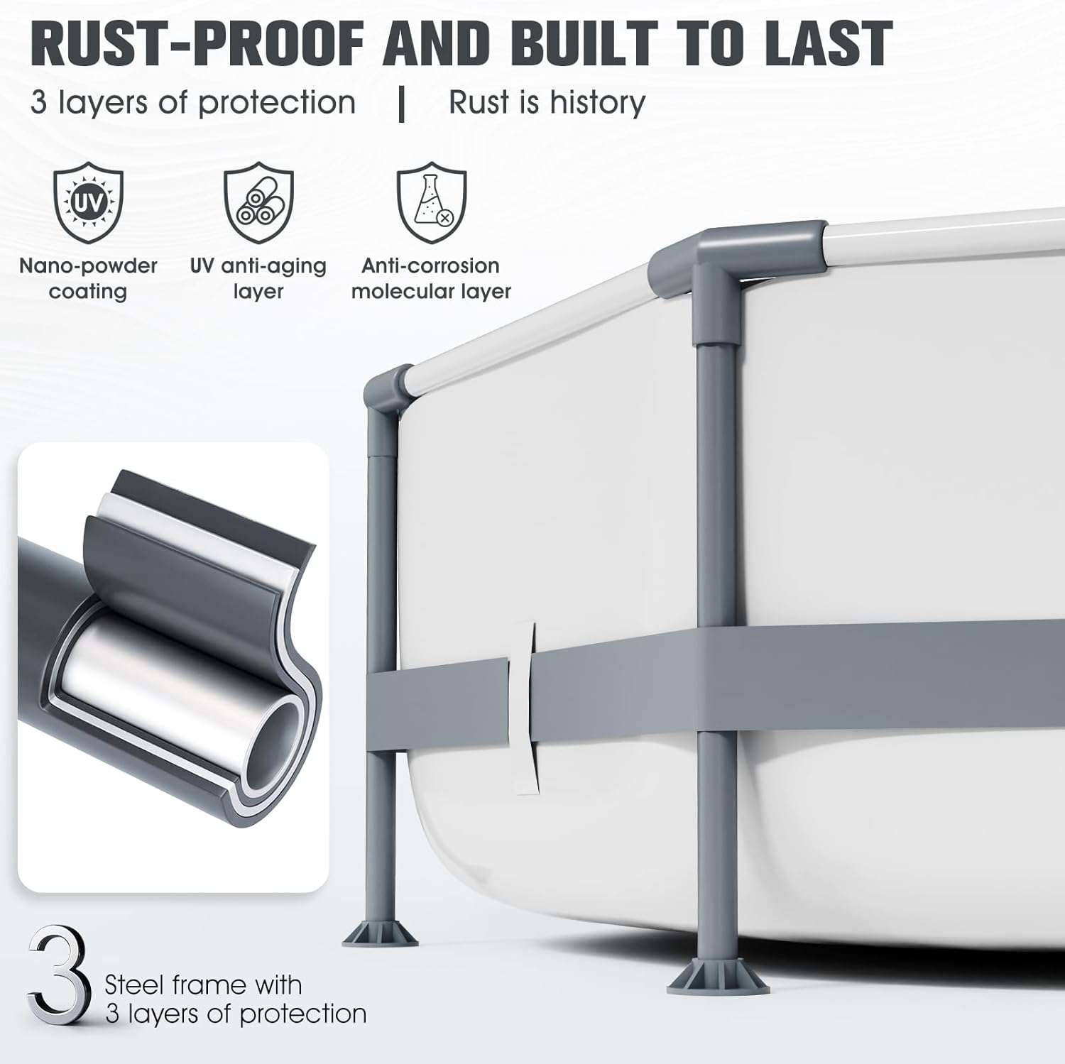 Premium Materials, Durable: This round, above-ground pool is made of high-quality three-layer PVC material, making it sturdy, durable, and resistant to breakage. Our T-joints create a seal with the pipes, effectively preventing internal rust. The pipe surface is specially treated to prevent scratches and corrosion, ensuring a longer lifespan.