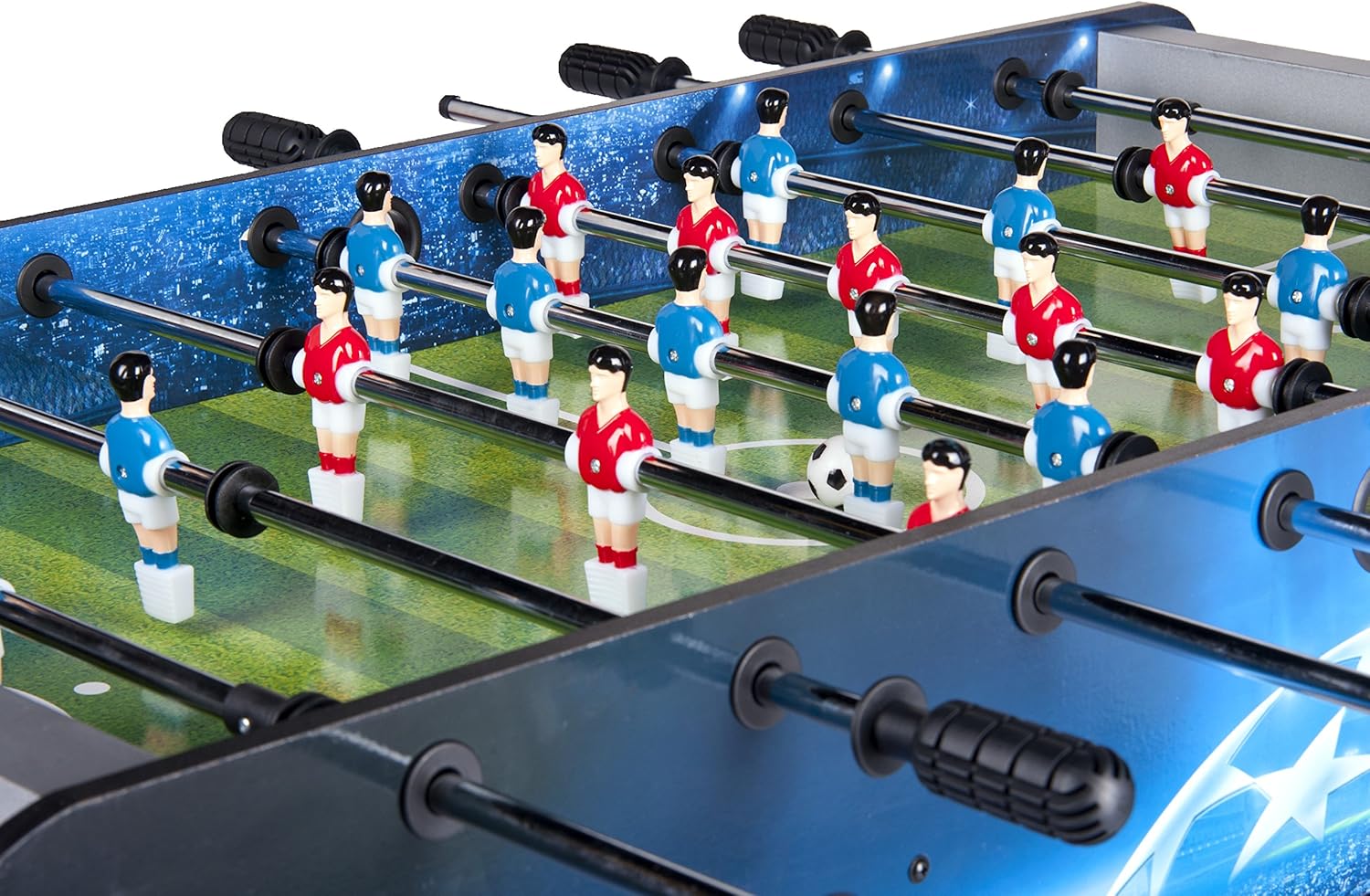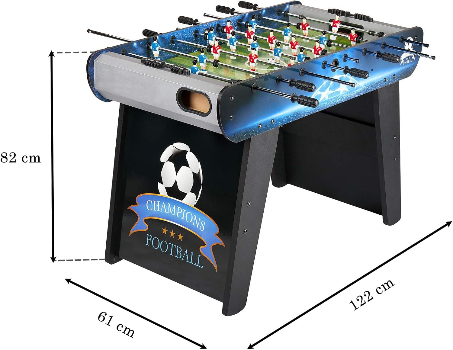 Product Features: Each team has 11 players, and the table includes 2 balls. The central circle is for the break, and includes 2 score cups and 2 balls. There is a manual scoreboard and two return holes at each end of the table. Dimensions: Table dimensions: 122 x 62 x 82 (height) cm, total weight: 25 kg. Other Information: Self-assembly required. Bolts and screws included. Warning: Not suitable for children under 10 months. Warning: Not suitable for children under 3 years. Use under adult supervision. Warning: Use under adult supervision. Your childhood dream is about to come true! You can organize a Champions League match in your own home! The table is meticulously crafted, paying attention to every detail, even the smallest. The metal cues are coated with special rubber to absorb impact and prevent noise when players are playing. The handles are made of rubber and comfortably fit any player's hand shape. It's more than just a toy; it provides an unforgettable entertainment experience for the whole family!