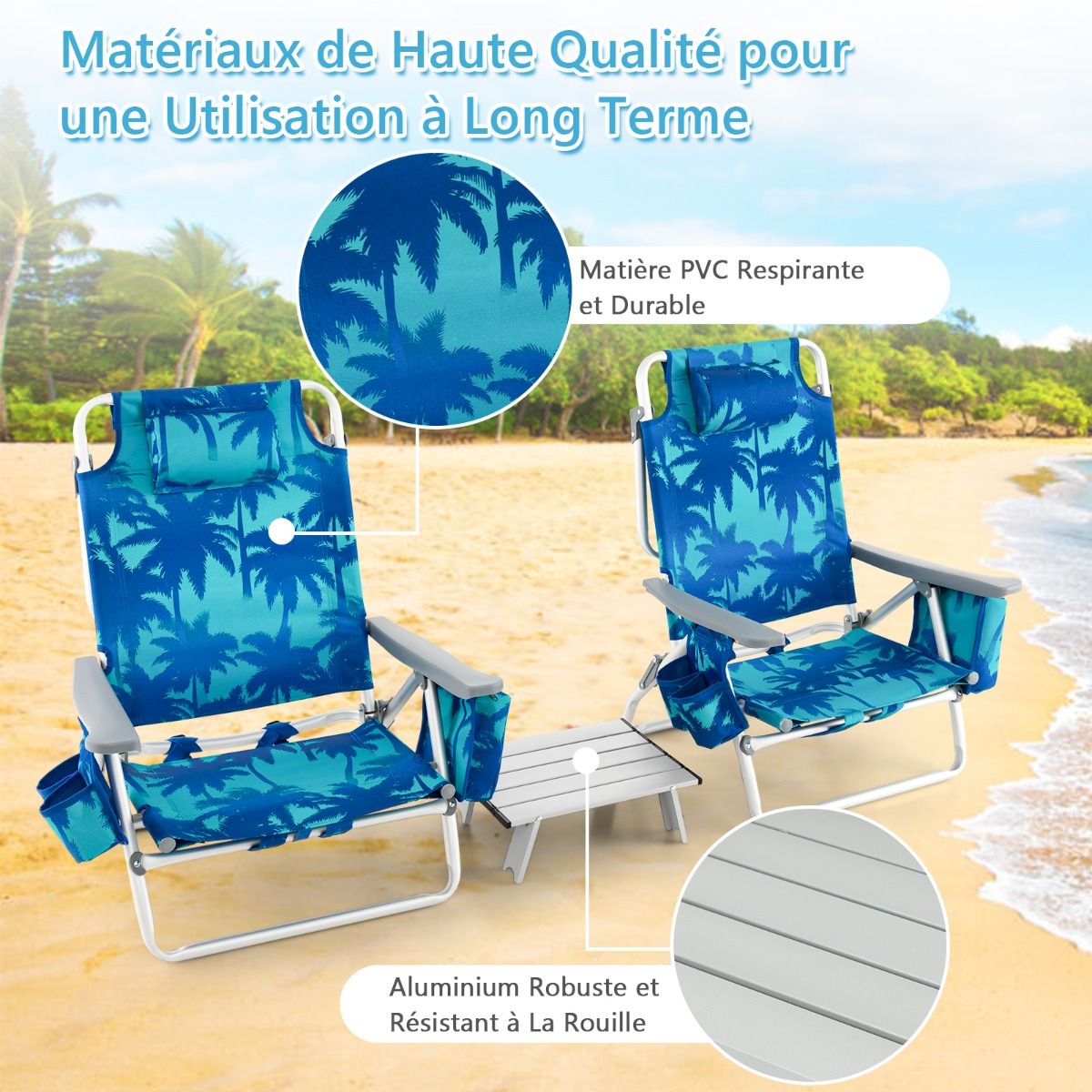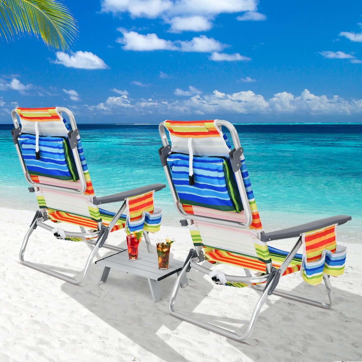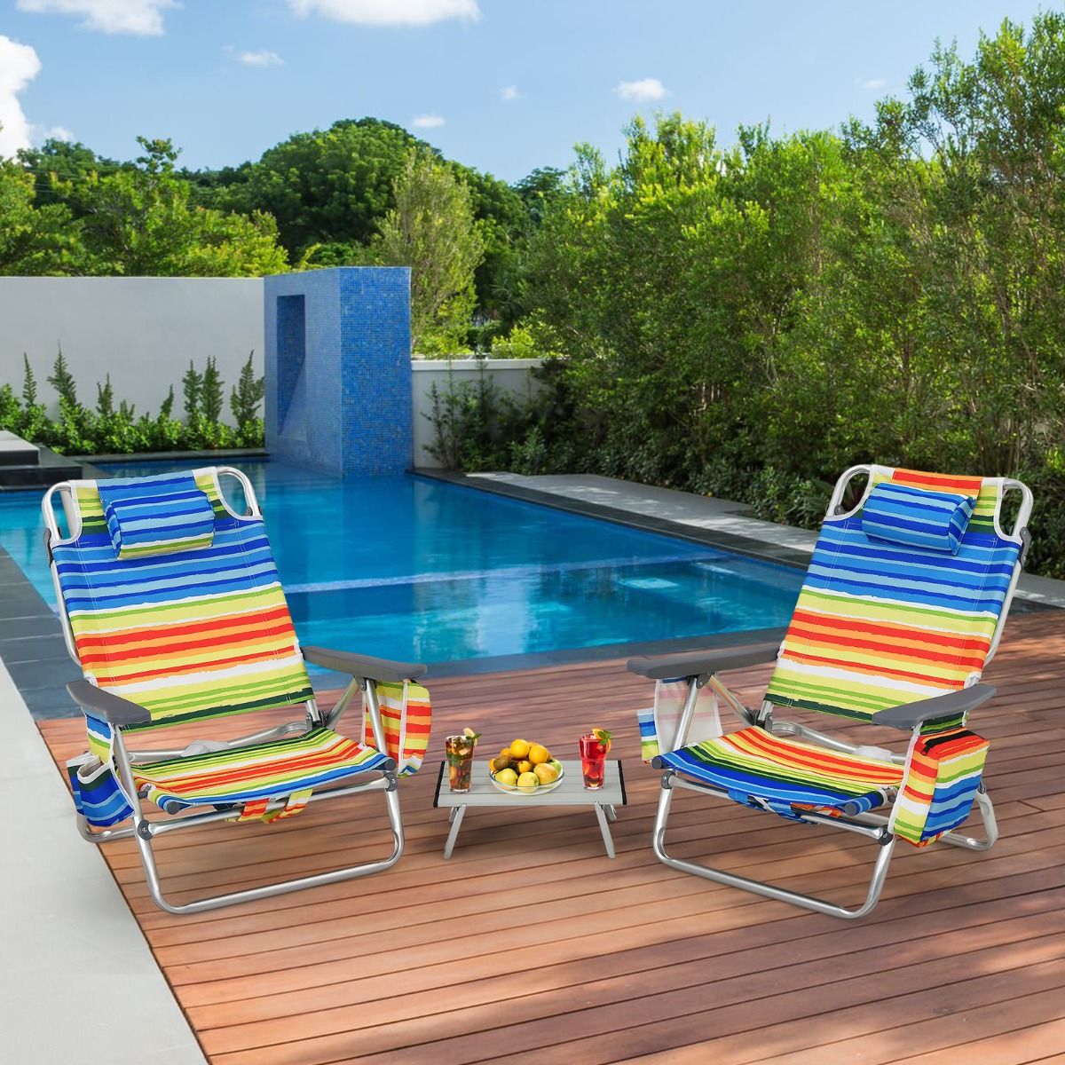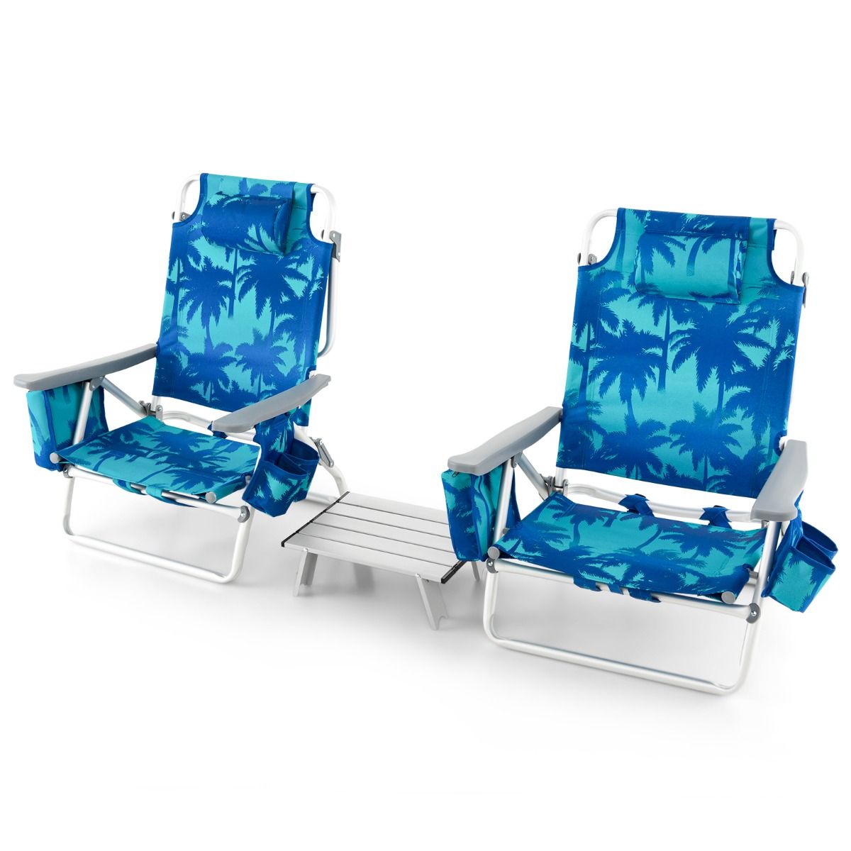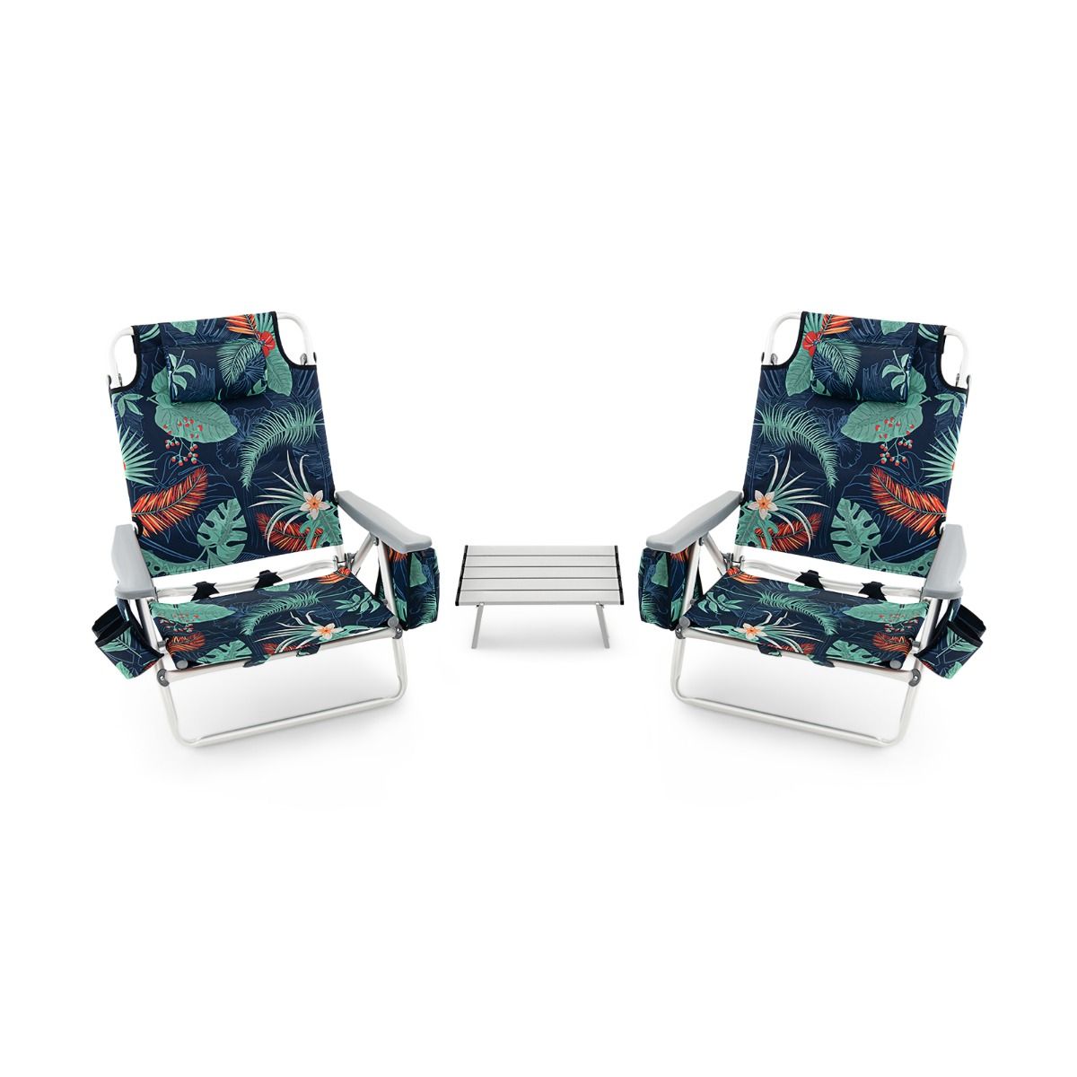 • Set of 2 Folding Camping Beach Chairs with Roll-Up Aluminum Table, Headrest, 5-Position Adjustable Backrest, 6 Colors to Choose From -