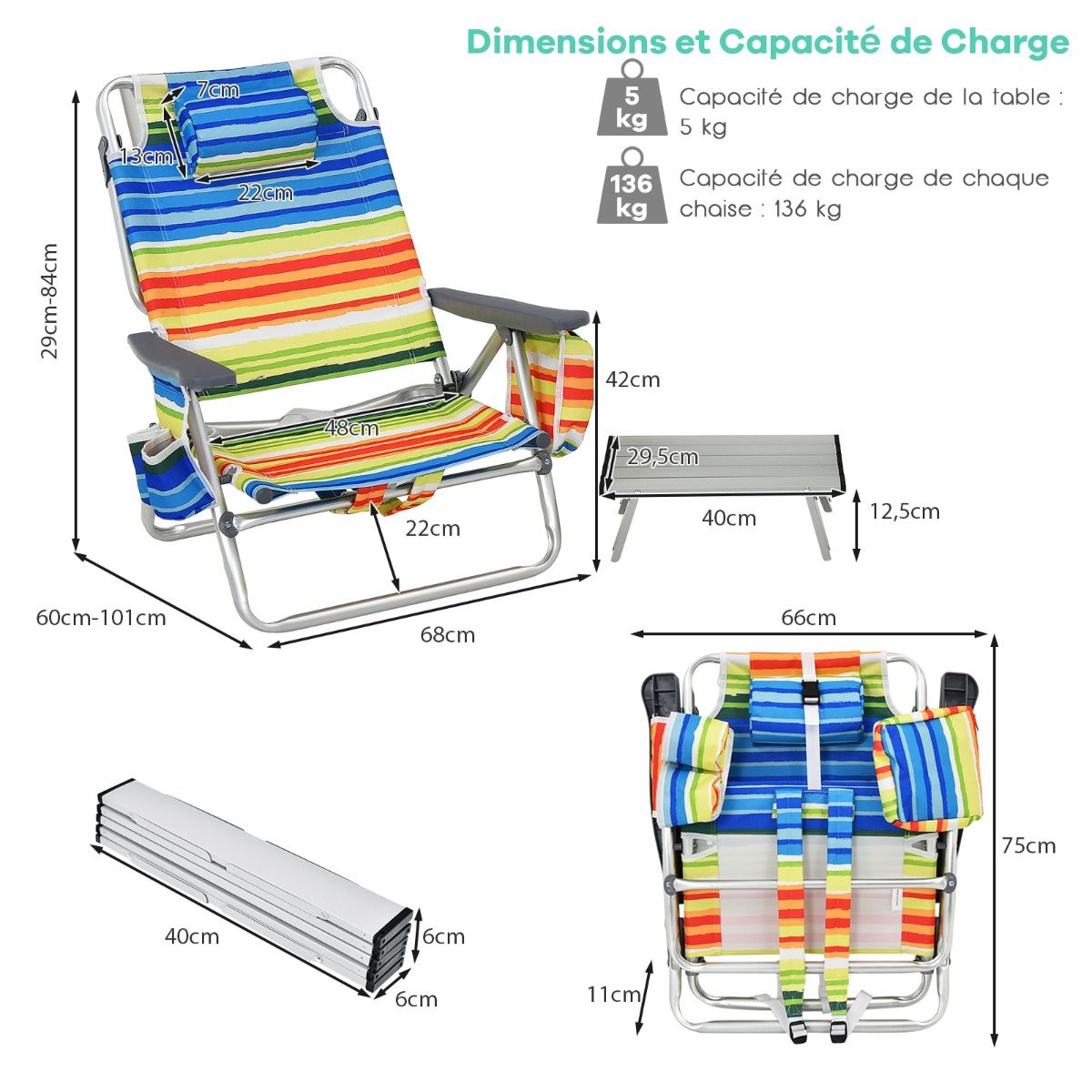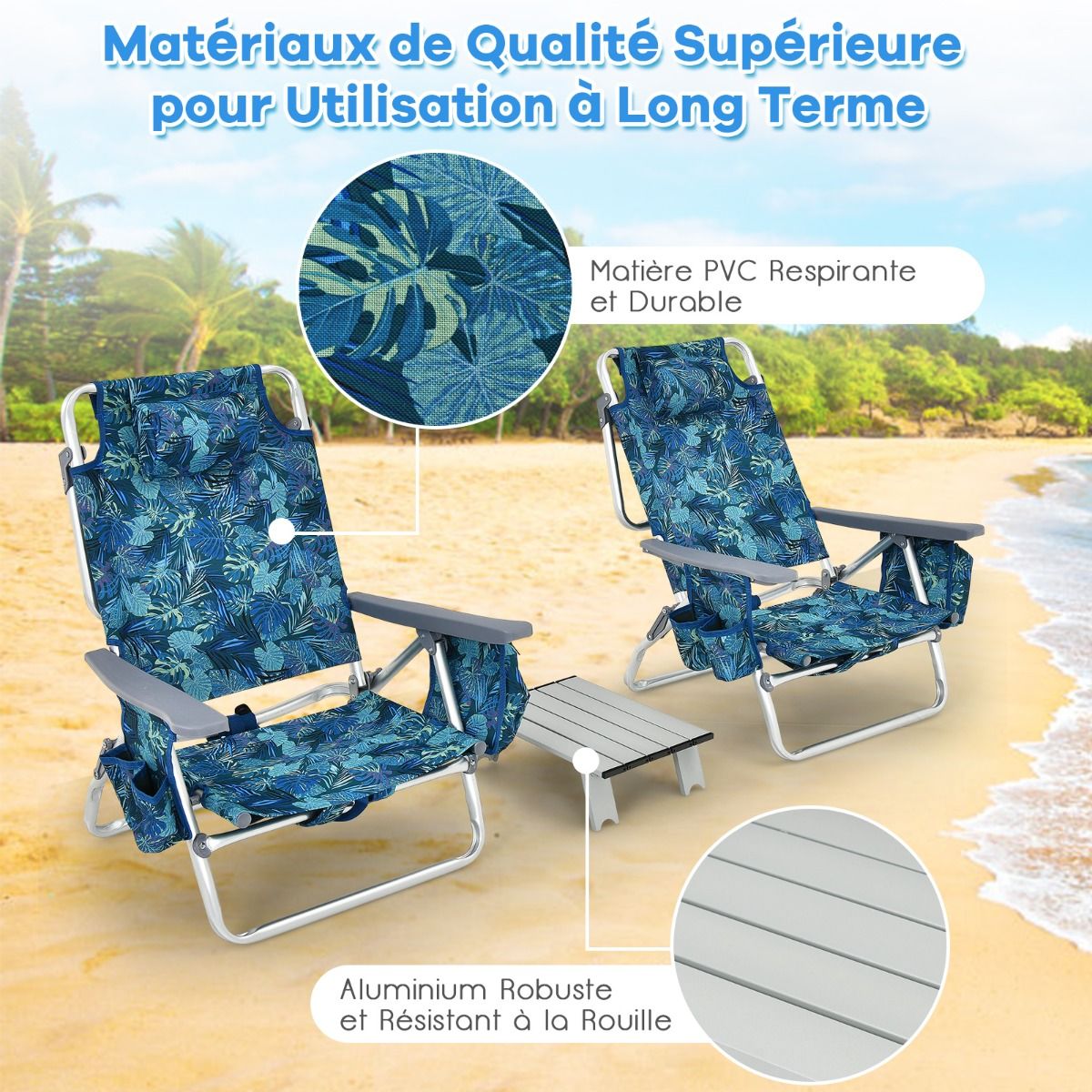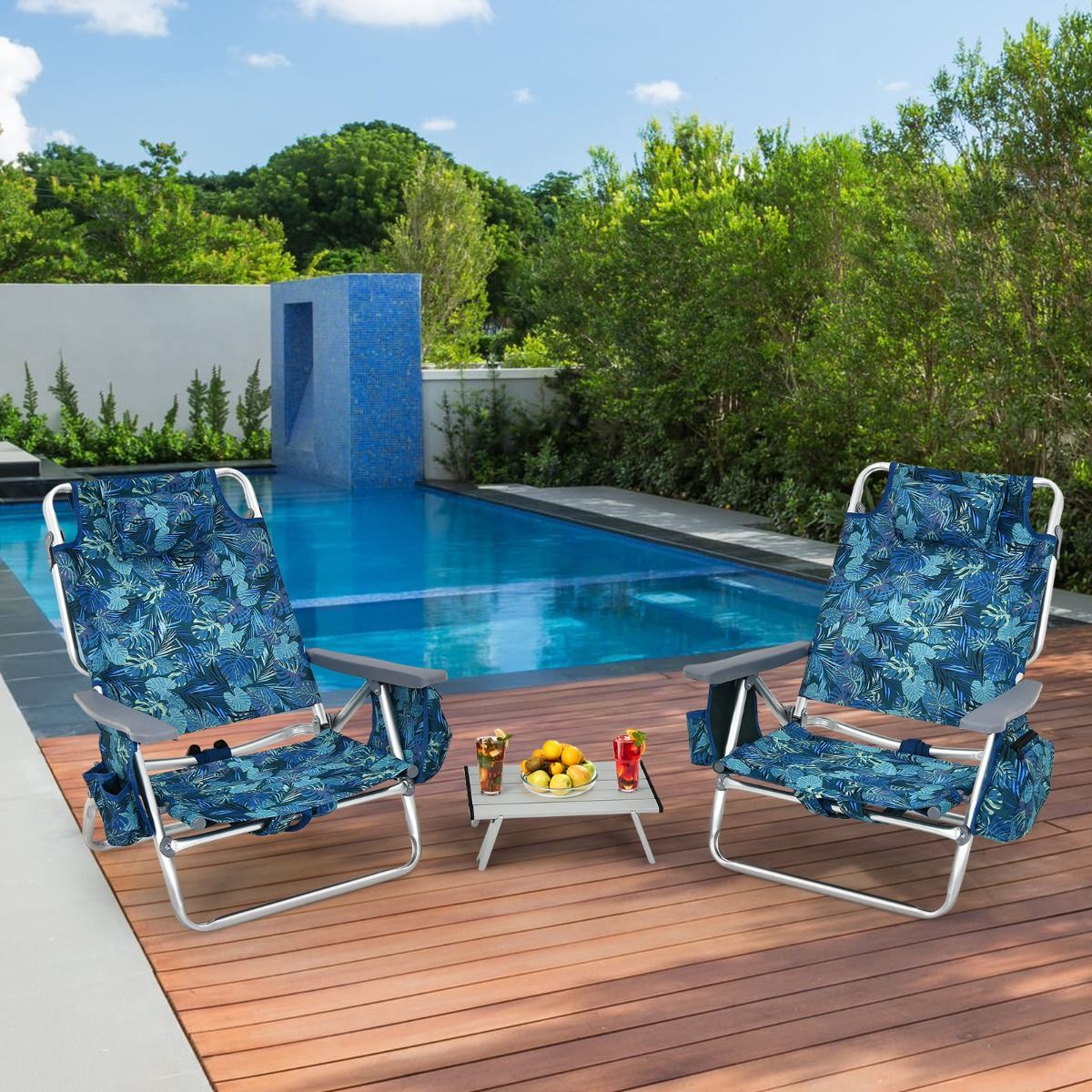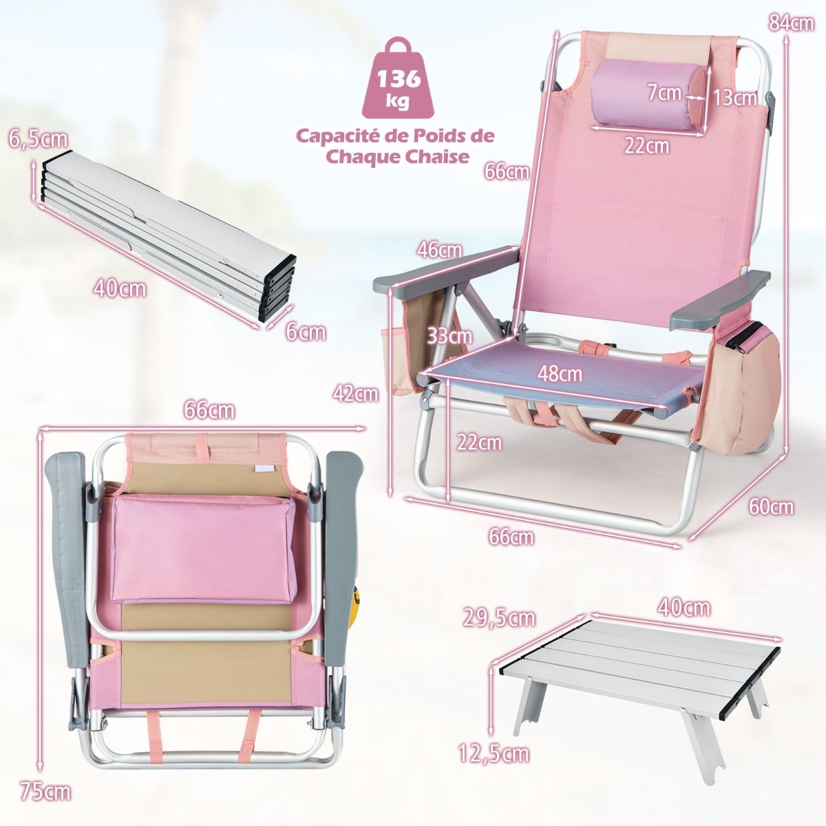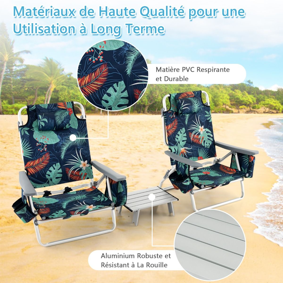 • Set of 2 Folding Camping Beach Chairs with Roll-Up Aluminum Table, Headrest, 5-Position Adjustable Backrest, 6 Colors to Choose From -