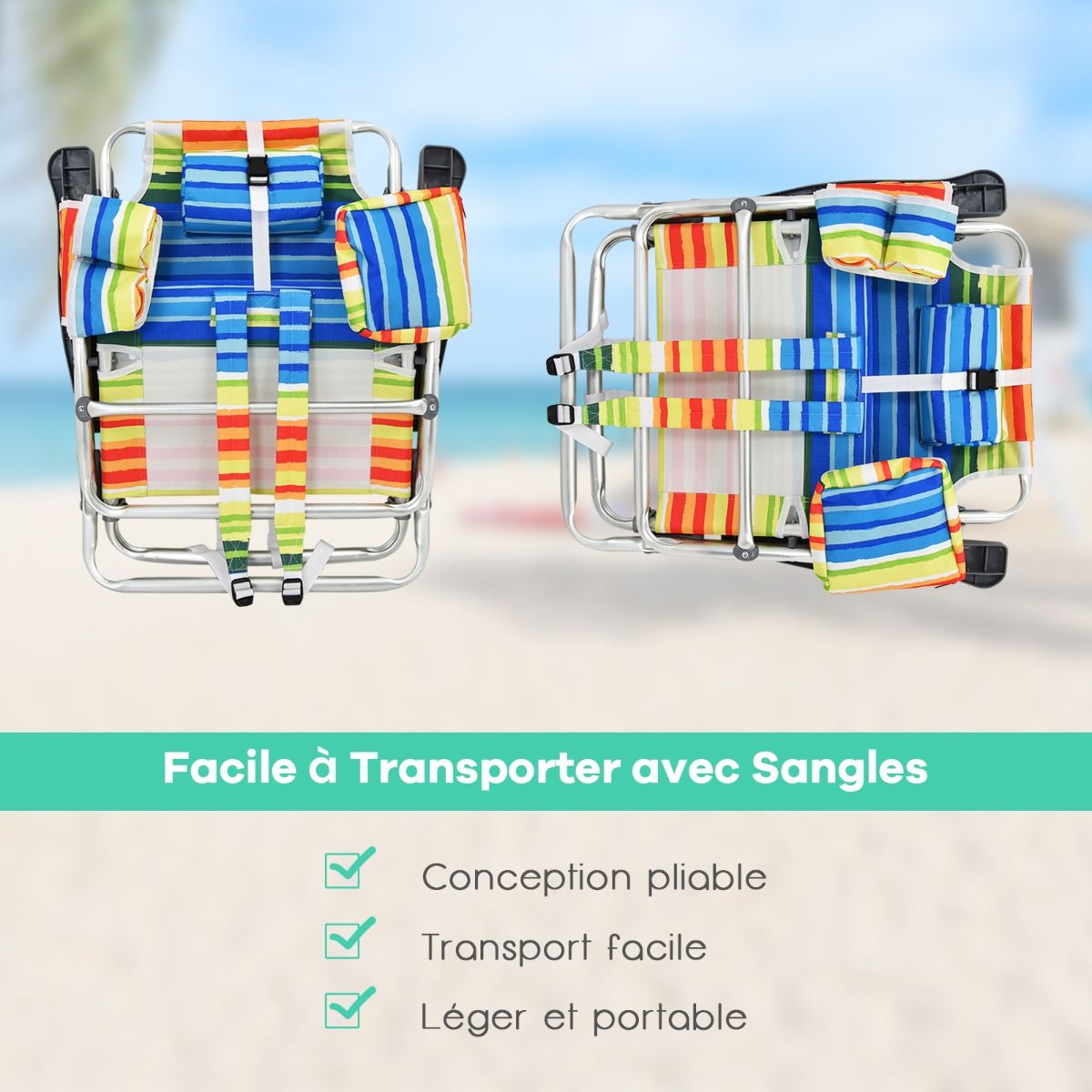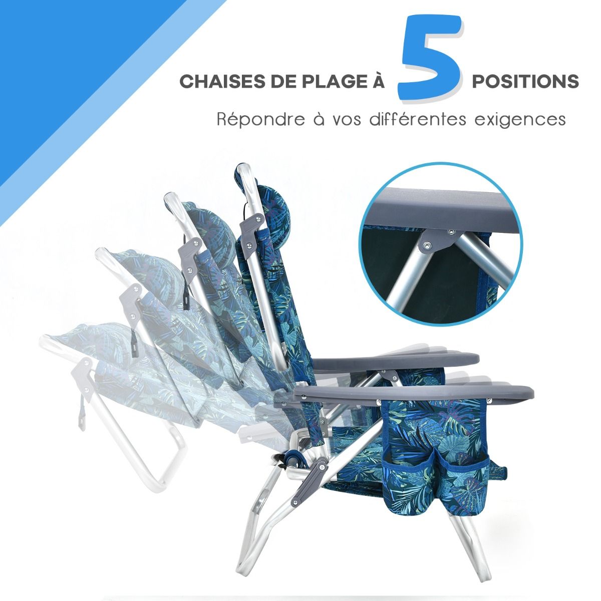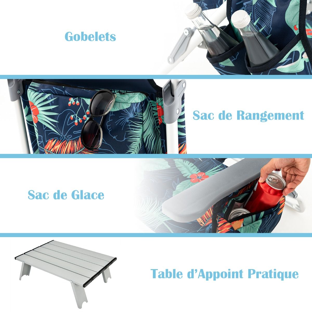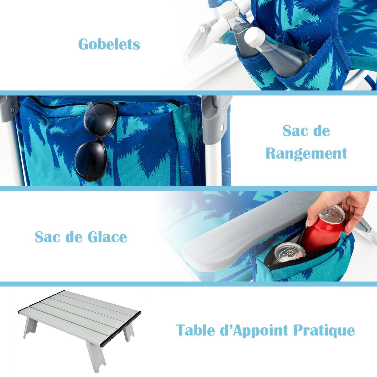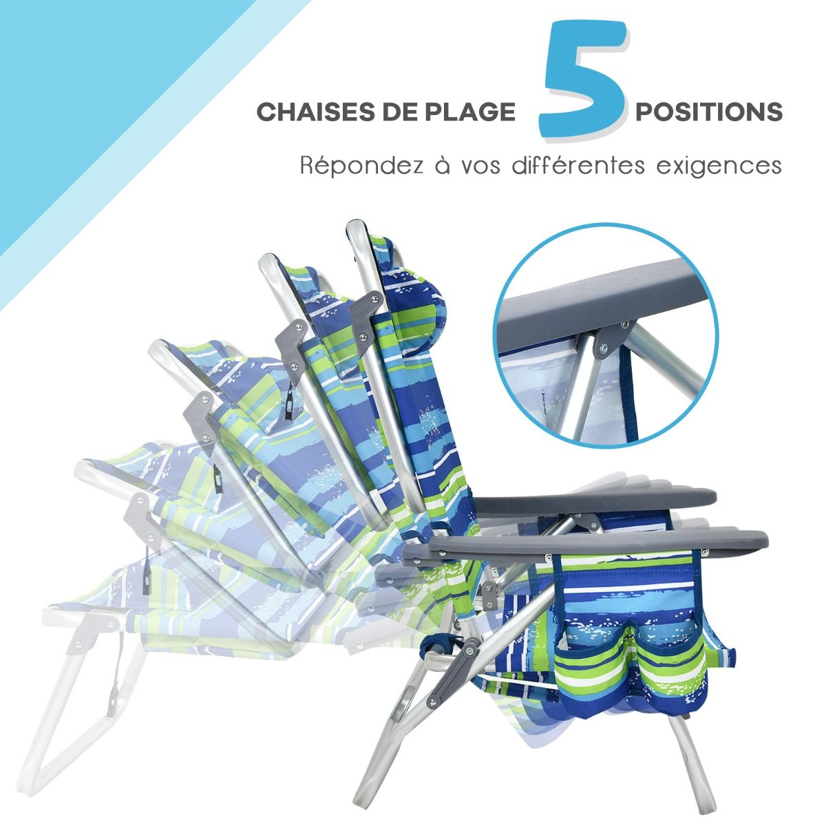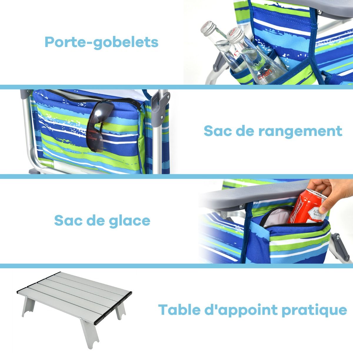 • Set of 2 Folding Camping Beach Chairs with Roll-Up Aluminum Table, Headrest, 5-Position Adjustable Backrest, 6 Colors to Choose From -